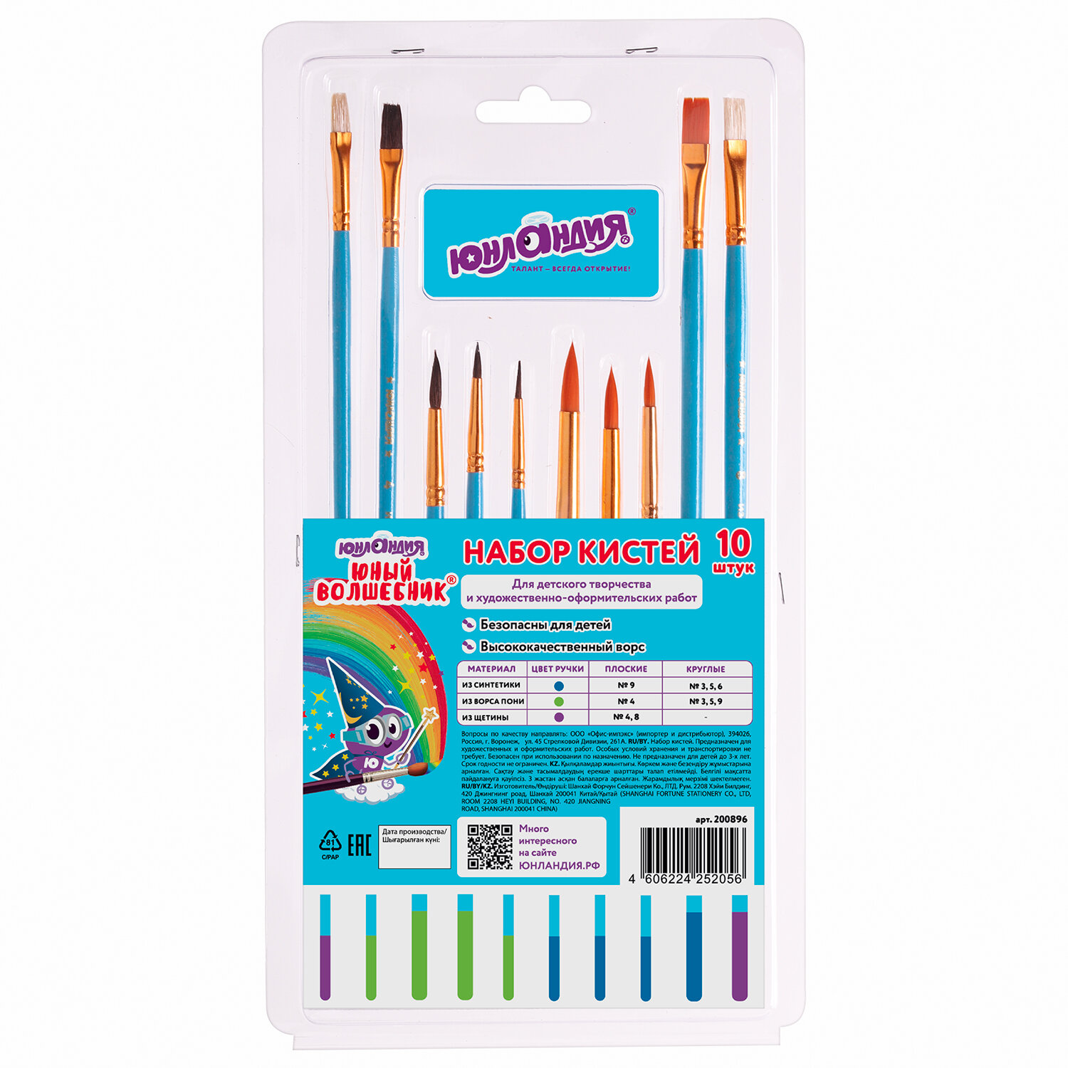 Кисти ЮНЛАНДИЯ "ЮНЫЙ ВОЛШЕБНИК", набор 10 шт. (ПОНИ - 4 шт.; СИНТЕТИКА - 4 шт.; ЩЕТИНА - 2 шт., круглые, плоские), блистер Ликвидация Код товара: 200896 274,92 ₽ Купить Производитель:ЮНЛАНДИЯ Набор из десяти кистей разного размера и типа ворса ЮНЛАНДИЯ предназначен для детского творчества в образовательных учреждениях и дома. Набор содержит: - кисти из волоса пони: круглые № 3, 5, 9; плоские № 4. - кисти из щетины: плоские № 4, 8. - кисти из синтетики: круглые № 3, 5, 6; плоские № 9. Наличие кистей различных номеров позволяет прорисовывать мелкие детали и наносить крупные линии и мазки. Разный тип ворса кисти позволяет работать с различными видами красок в разных техниках рисования. Деревянную лакированную рукоятку кисти удобно держать в руке. Для удобства использования кончики ручки окрашены в разные цвета.Производство: КитайКол-во кистей в наборе: 10 шт.Тип кисти: круглая, плоскаяНомер кисти: 3, 4, 5, 6, 8, 9Ворс: пони, синтетика, щетинаРучка: укороченнаяУпаковка: блистер с европодвесомСерия: Юный ВолшебникВес: 68 грРазмер упаковки: 0.8 × 29.5 × 15.2 смОбъём: 0.0005 м3Промежуточная упаковка: 24 штТранспортная упаковка: 144 штШтрих-код: 4606224252056 Сертификат-1.jpg Сертификат-2.jpg