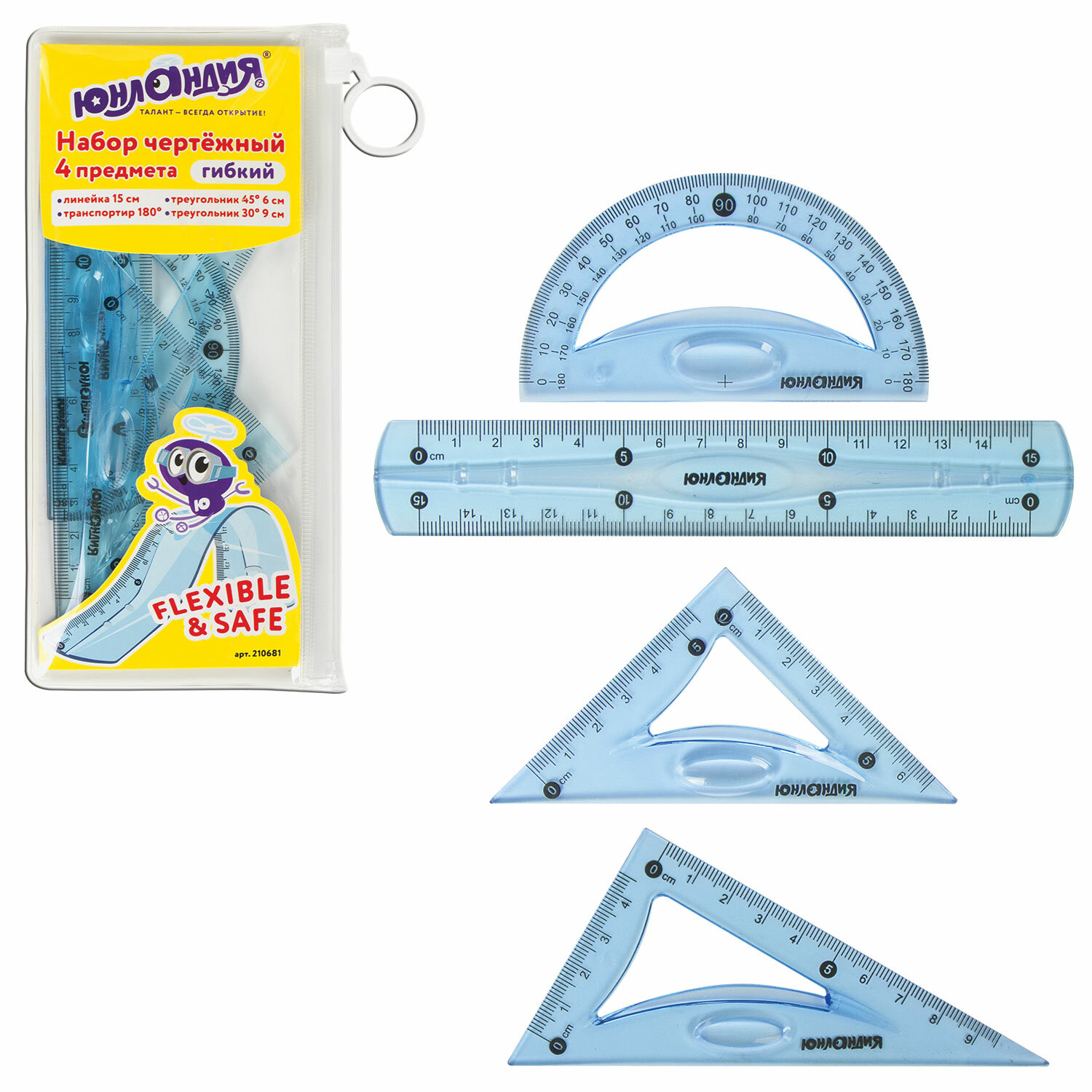 Набор чертежный малый гибкий ЮНЛАНДИЯ "FLEX" (линейка 15 см, 2 треугольника, транспортир), пенал Код товара: 210681 208,76 ₽ Купить Производитель:ЮНЛАНДИЯ Гибкий ударопрочный набор чертежных инструментов ЮНЛАНДИЯ "FLEX" предназначен для чертёжных и измерительных работ. Изготовлен из высококачественного ПВХ. Линейки обладают четкой разметкой, что делает их удобными в использовании. Сантиметровая шкала с двух сторон и безопасные закруглённые углы. Устойчивы к деформации. В комплект входит: линейка 15 см, транспортир 180°, треугольник - 45°, 6 см, треугольник - 30°, 9 см.Производство: КитайКоличество предметов в наборе: 4 шт.Максимальная длина разметки: 15 смКомплектация: большой треугольник, линейка, малый треугольник, транспортирМатериал: пластикПрозрачный: даЦвет: голубойСерия: FlexУпаковка: пенал на молнииВес: 61 грРазмер упаковки: 0.9 × 19.8 × 9.3 смОбъём: 0.0002 м3Промежуточная упаковка: 24 штТранспортная упаковка: 288 штШтрих-код: 4606224235660 Сертификат-1.jpg Сертификат-2.jpg Сертификат-3.jpg