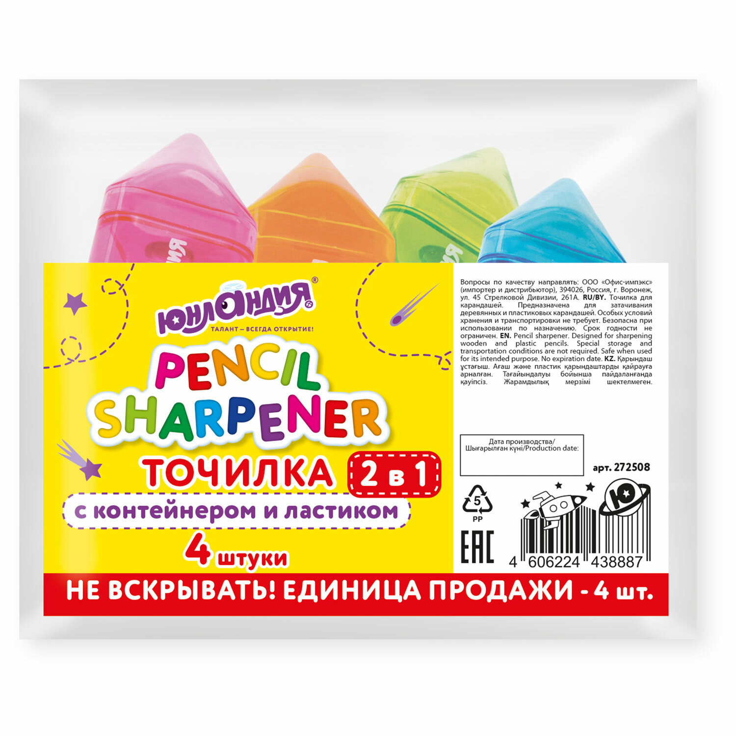 Точилка ЮНЛАНДИЯ "Карандашик" с контейнером и ластиком 2 в 1, НАБОР 4 ШТУКИ Код товара: 272508 224,16 ₽ Купить Производитель:ЮНЛАНДИЯ Точилки для карандашей ЮНЛАНДИЯ "Карандашик" - необходимый инструмент для юных художников. Каждый урок рисования станет особенным для ребенка, если в его руках появится такая точилка. Корпус выполнен из пластика. Острое лезвие обеспечивает высококачественную и точную заточку. Карандаши стандартного диаметра (до 8 мм) затачиваются легко и аккуратно, а стружка остается в контейнере. Ластик в комплекте обеспечивает чистое стирание без повреждения бумаги, а специальная крышечка защитит его от загрязнений и повреждений. Компактные размеры (60х26х26 мм) позволят поместить точилку в пенал, а благодаря интересной форме она не затеряется на парте или столе. Точилки представлены в четырех ярких цветах: голубой, оранжевый, зеленый, розовый. Упакованы в прозрачный пакет.Производство: КитайКоличество в комплекте: 4 шт.Материал корпуса: пластикФорма корпуса: фигурнаяКоличество отверстий: 1Контейнер для стружки: даСерия: КарандашикПодходит для левшей: даЦвет: ассортиВысота: 60 ммШирина: 26 ммГлубина: 26 ммИндивидуальная упаковка: даУпаковка : пакетВес: 65 грРазмер упаковки: 2.7 × 12.4 × 6.7 смОбъём: 0.0003 м3Промежуточная упаковка: 60 штТранспортная упаковка: 180 штШтрих-код: 4606224438887 Сертификат-1.jpg Сертификат-2.jpg Сертификат-3.jpg