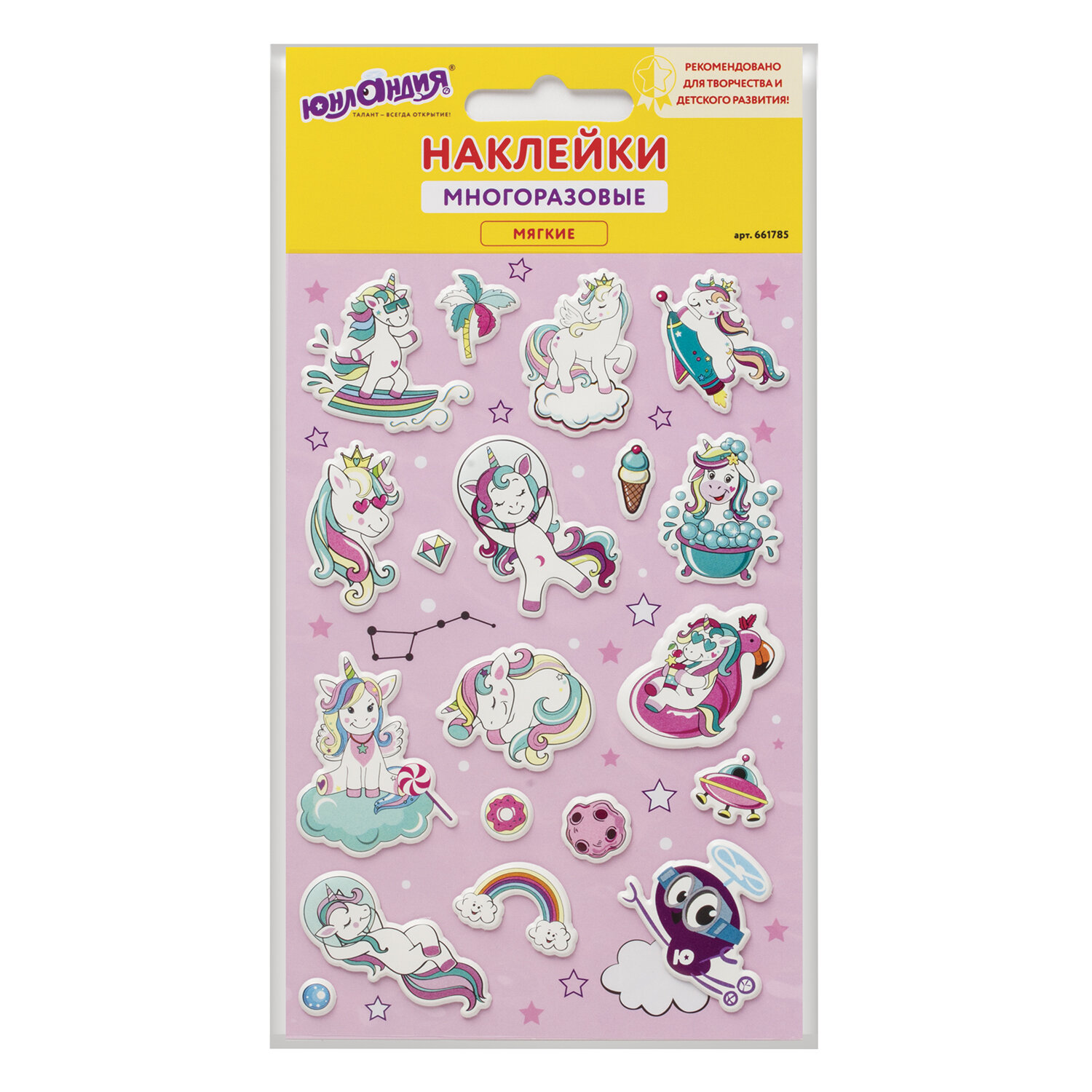 Наклейки зефирные "Единороги", многоразовые, 10х15 см, ЮНЛАНДИЯ Код товара: 661785 126,26 ₽ Купить Производитель:ЮНЛАНДИЯ Зефирные наклейки ЮНЛАНДИЯ - это простой и яркий способ украсить любые изделия. Многоразовые наклейки подходят для использования на бумаге, картоне, дереве, пластике, стекле и других поверхностях несколько раз, не оставляя следов. В наборе содержатся мягкие зефирные наклейки с изображением единорогов в количестве 19 штук. Наклейки отличаются высочайшим качеством печати и цветопередачи. Милые загадочные единороги придадут оригинальности тетрадям, дневникам, гаджетам и волшебно украсят поделки. Качественный клеевой слой позволяет приклеивать и отклеивать наклейки несколько раз, не оставляя следов на поверхности. При этом каждый раз наклейка надёжно фиксируется и продолжает долго радовать своей красотой. Товар премиум-качества, относится к среднему ценовому сегменту.Производство: КитайТип наклеек: зефирныеСерия: ЗефирныеТематика: животныеКоличество наклеек: 19 шт.Тип поверхности наклеивания: любаяОбъемные: даМногократное переклеивание без потери качества: даДлина листа: 150 ммШирина листа: 100 ммМатериал: полимерыВозрастная группа: от 3 летПол ребенка: универсальныеУпаковка: пакет с европодвесомВес: 17 грРазмер упаковки: 0.2 × 19.1 × 10.7 смОбъём: 0.0001 м3Промежуточная упаковка: 48 штТранспортная упаковка: 288 штШтрих-код: 4606224223865 Сертификат-1.jpg Сертификат-2.jpg Сертификат-3.jpg