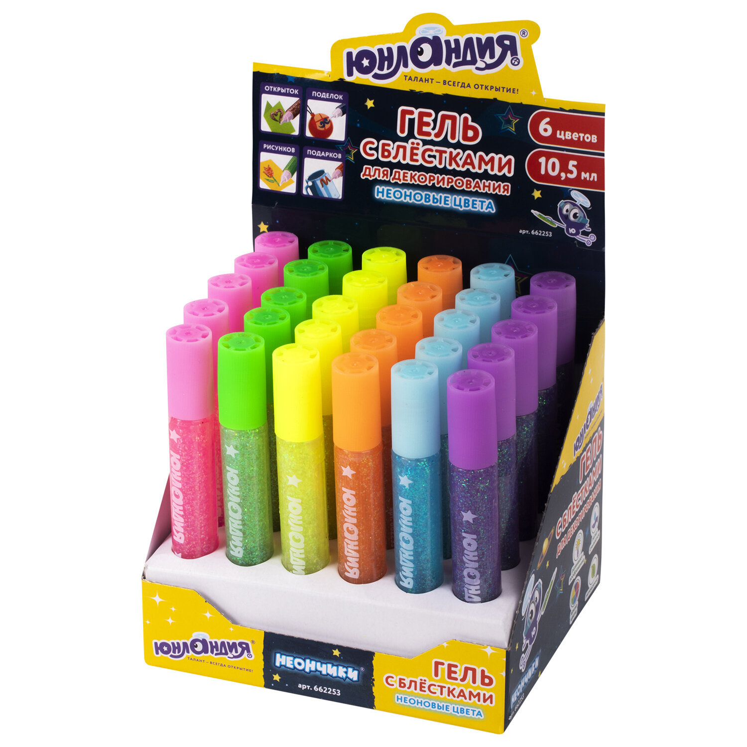 Гель с блестками ЮНЛАНДИЯ "НЕОНЧИКИ", для декора, поделок, DIY, творчества, оформления, 10,5 мл, цвета ассорти, в дисплее Код товара: 662253 22,25 ₽ Купить Производитель:ЮНЛАНДИЯ Гель с блёстками ЮНЛАНДИЯ - это блестящие наборы для творчества и украшения открыток, поделок, рисунков и подарков. Удобный наконечник с дозатором позволяет легко наносить гель на любую поверхность. В наборе содержится 30 туб гель-клея с блёстками объёмом 10,5 мл 6 различных неоновых цветов - розовый, жёлтый, зелёный, оранжевый, голубой, фиолетовый. Удобная упаковка позволяет легко работать с гель-клеем: просто снимите колпачок с тубы, и нанесите гель-клей на изделие через тонкий наконечник. По окончании работы удалите лишний гель с наконечника и плотно закройте колпачок, чтобы предотвратить засыхание геля. После нанесения на поверхность гель высохнет в течение нескольких часов в зависимости от толщины нанесённого слоя, а на поделке останутся искрящиеся блёстки. Гель-клей подходит для использования с различными типами поверхности: бумага, картон, дерево, пенопласт, пластик, стекло, керамика. Гель-клей не токсичен, легко смывается с рук и одежды тёплой водой с мылом.Производство: КитайКоличество цветов в наборе: 6 шт.Тип спецэффекта: блестки, неонСерия: НеончикиЦвет: голубой, желтый, оранжевый, розовый, синий, фиолетовыйОбъем баночки/тубы: 10,5 млУпаковка: картонный дисплейСрок годности: 48 месВес: 18 грРазмер упаковки: 1.4 × 11.1 × 4.9 смОбъём: 0.0001 м3Промежуточная упаковка: 30 штТранспортная упаковка: 480 штШтрих-код: 4606224248653 Файлы Сертификат-1.jpg Сертификат-2.jpg Сертификат-3.jpg Сертификат-4.jpg
