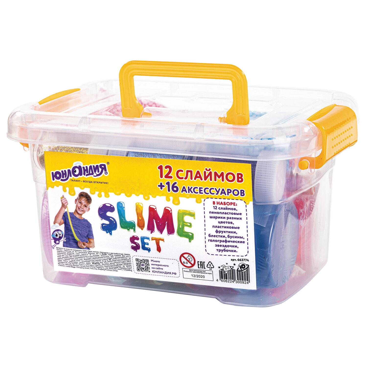 Набор слаймов 12 цветов, 16 аксессуаров, в пластиковом боксе, ЮНЛАНДИЯ Код товара: 663774 548,46 ₽ Купить Производитель:ЮНЛАНДИЯ Набор слаймов с аксессуарами ЮНЛАНДИЯ - это отличное развлечение для детей. Кроме готовых слаймов, в набор входят пенопластовые шарики, блестки и другие аксессуары для создания своего уникального слайма. Не липнут к рукам, не пачкаются, не токсичны. В набор входят 12 слаймов в баночках весом 50-55 грамм, 3 пакетика с пенопластовыми шариками различных цветов, 1 пакетик с пластиковыми фруктиками, 3 пакетика с бусинами, 3 тубы с блёстками различных цветов, 3 баночки с блестящими звездочками, а также трубочки для надувания слаймов. Слайм можно разминать, растягивать, разрывать, помещать в формочки, размешивать и разрезать игрушечными инструментами, добавлять в него любые добавки, входящие в комплект. Набор даёт огромный простор для детского творчества, способствует развитию воображения, мелкой моторики, релаксации. Перед началом игры со слаймом рекомендуем достать его из баночки и размять в руке в течение минуты. Слайм станет более эластичным и будет лучше тянуться. Для предотвращения застывания рекомендуем поместить слайм обратно в баночку и закрыть крышкой после использования.Производство: КитайТип товара: слайм (лизун)Назначение: развивает моторику, способствует релаксацииСерия: КлассикаВозраст ребенка от: 3 летЦвет: ассортиСюжет: 12 цветовМатериал: полимерВысота: 20 смШирина: 15 смУпаковка: пластиковая коробкаВес: 1333 гСрок годности: 36 месРазмер упаковки: 10.4 × 19.5 × 14.7 смОбъём: 0.0039 м3Промежуточная упаковка: 12 штТранспортная упаковка: 12 штШтрих-код: 4606224300924 Файлы Сертификат-1.jpg Сертификат-2.jpg Сертификат-3.jpg Сертификат-4.jpg