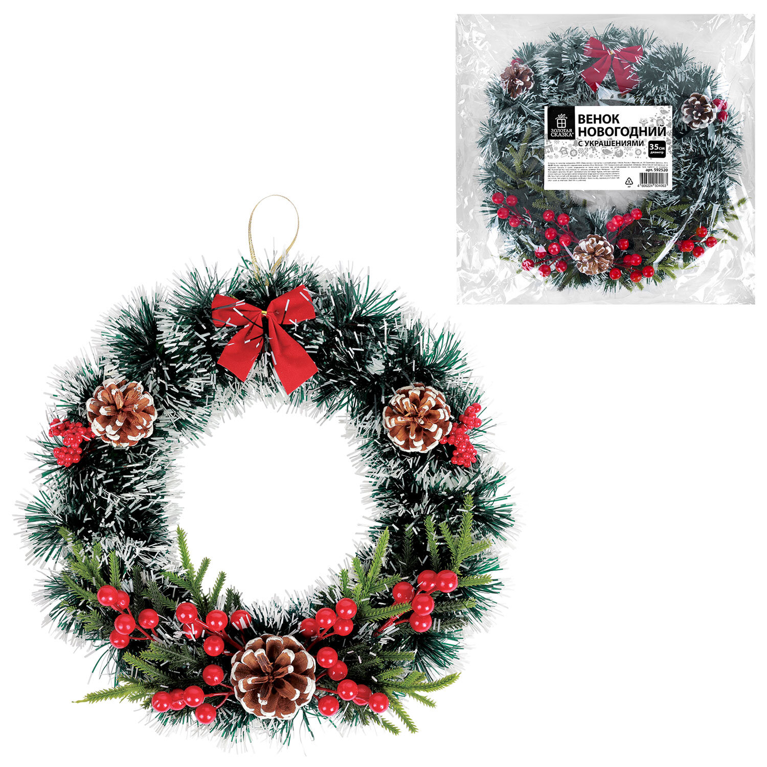 Венок новогодний, диаметр 35 см "Пушистый", с декором, ПЭТ, ЗОЛОТАЯ СКАЗКА Код товара: 592520 481,65 ₽ Купить Производитель:ЗОЛОТАЯ СКАЗКА Венок новогодний ЗОЛОТАЯ СКАЗКА станет прекрасным украшением для дома или офиса. Венок преобразит пространство и подарит ощущение праздника. Венок новогодний диаметром 35 см представляет собой конструкцию из поролона, обмотанного бумагой, на который крепятся веточки. Материал – ПЭТ. Цвет – зелёный с белыми кончиками. Венок украшен ветками красных ягод, шишками, бантиками. К его основанию прикреплена лента, за которую можно легко повесить венок на стену или дверь. Можно разместить не только на вертикальную, но и горизонтальную поверхность, сделав частью новогоднего украшения.Производство: КитайТип товара: ВенокМатериал: ПЭТДлина: 35 смШирина: 35 смЦвет: зеленый с белыми кончикамиСпособ крепления: лентаДизайн: ПушистыйВес: 219 грРазмер упаковки: 8.7 × 34.9 × 30.7 смОбъём: 0.0078 м3Промежуточная упаковка: 20 штТранспортная упаковка: 20 штШтрих-код: 4606224504063 Сертификат-1.jpg Сертификат-2.jpg