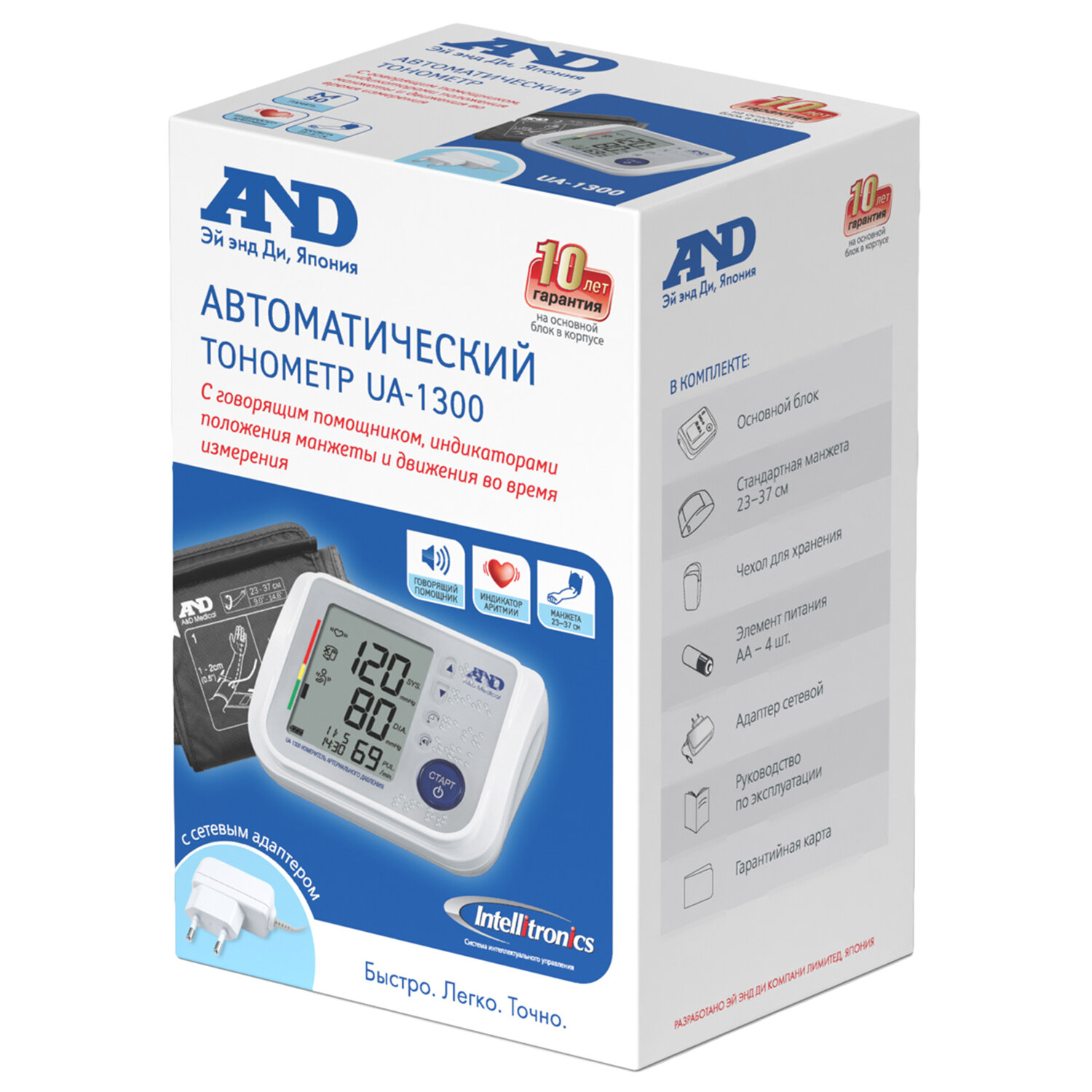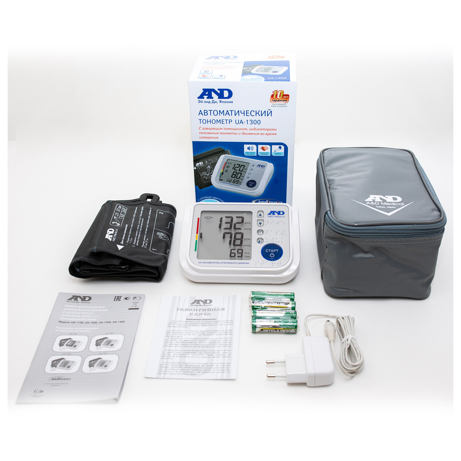 Тонометр AND UA-1300, манжета 23-37 см, автоматический, на плечо, адаптер питания Код товара: 631375 12 516,36 ₽ Купить Производитель:AND Тонометр AND UA-1300 – простой и функциональный прибор для бытового и профессионального применения с удобным управлением, понятным даже пожилым людям. Цифровой прибор для измерения артериального давления и частоты пульса, тонометр AND UA-1300, с манжетой нового поколения AND Opti Cuff для рук с длиной окружности плеча 23–37 см и сетевым адаптером – современная модель, которая предназначена для применения в качестве индивидуального средства контроля артериального давления и частоты пульса, а также для динамических наблюдений за этими параметрами в медицинских учреждениях. Прибор оснащен индикатором аритмии, графическим цветным индикатором повышенного артериального давления по рекомендациям ВОЗ (Всемирная организация здравоохранения), функцией памяти на 90 измерений и расчет среднего значения давления для отслеживания динамики изменения уровня давления. Модель тонометра AND UA-1300 включает в себя говорящего помощника на русском языке. Большой трехстрочный дисплей тонометра AND UA-1300, на котором отчетливо видны все цифры и символы, простота управления при помощи всего одной кнопки и надписи, выполненных на русском языке, – все это позволяет использовать прибор любому человеку без дополнительной подготовки. В комплект поставки входит чехол для хранения и транспортировки и сетевой адаптер. Тонометр работает от 4 пальчиковых батареек (тип AA) или от сетевого адаптера. Производитель оставляет за собой право без предварительного уведомления вносить изменения в технические характеристики, комплектацию и конструкцию, не ухудшающие эксплуатационные характеристики изделия.Производство: КитайТип тонометра: АвтоматическийСерия: UA-1300Фиксация манжеты: на плечоМанжета min: 23 смМанжета max: 37 смОбъем памяти: 90 измеренийСпособ сброса воздуха: АвтоматическийДиапазон измерения давления, мм рт. ст.: 20-280Погрешность измерения давления: 3 мм рт. ст.Диапазон измерения пульса, уд/мин: 40-200Погрешность измерения пульса: 5%Расчёт среднего по последним трём измерениям: даРечевое сопровождение: даУстановка времени и даты: даПитание от батареек: даТип элемента питания: АА х 4Питание от сети: даЧехол для хранения: даМатериал корпуса: пластикВысота: 6 смШирина: 14 смГлубина: 10.5Вес нетто: 0.265 кгВес: 650 грРазмер упаковки: 12 × 12.5 × 16.5 смОбъём: 0.0011 м3Промежуточная упаковка: 10 штТранспортная упаковка: 10 штШтрих-код: 4981046050494