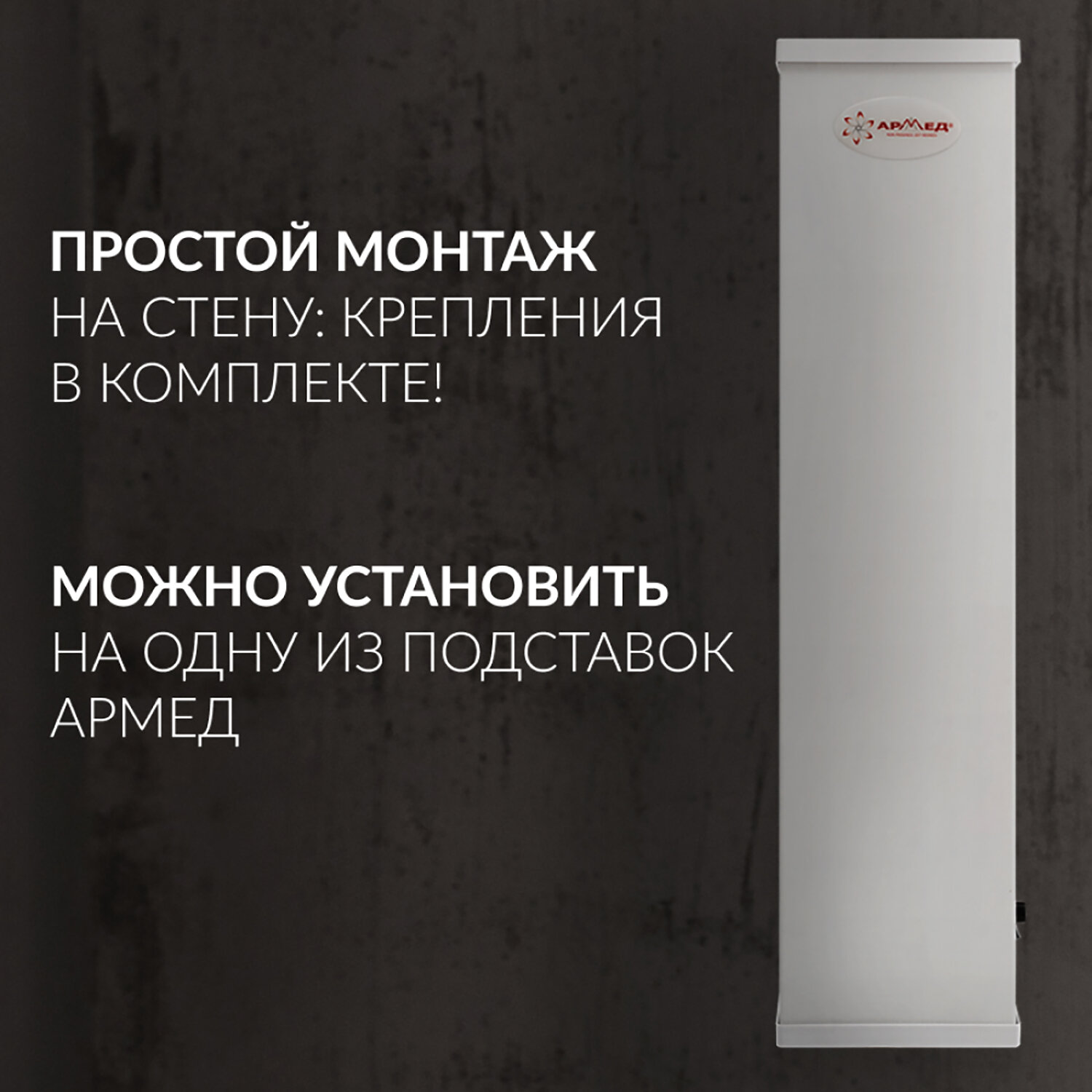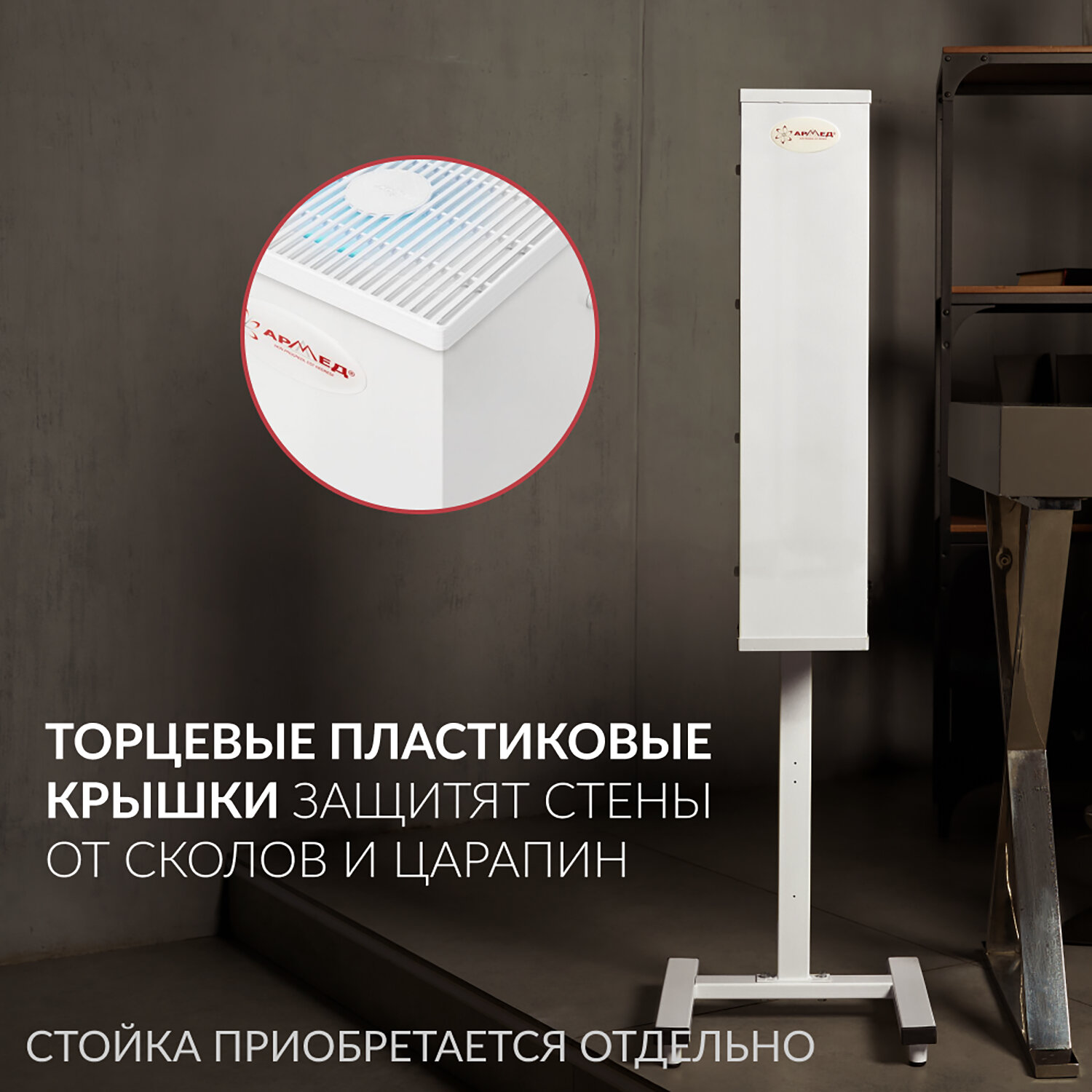 Рециркулятор БАКТЕРИЦИДНЫЙ (МЕД РегУд) АРМЕД AirCube 315 FM, УФ-лампа 3х15 Вт, 100 м3 Код товара: 631774 7 328,7 ₽ Купить Производитель:АРМЕД Бактерицидный рециркулятор АРМЕД AirCube 315 FM — это мощное и безопасное решение для обеззараживания воздуха в помещениях до 100 м3, идеально подходящее для просторных офисов, учебных классов, кабинетов, фитнес-залов, детских садов и даже жилых комнат! Прибор оснащён тремя ультрафиолетовыми лампами по 15 Вт (тип цоколя G13), которые эффективно уничтожают вирусы, бактерии и споры плесени, обеспечивая высокий уровень санитарной безопасности. Благодаря закрытому типу облучателя и прочному металлическому корпусу белого цвета, УФ-излучение полностью изолировано — находиться в помещении во время работы устройства абсолютно безопасно, даже для детей и активных пользователей. Воздух проходит через встроенный фильтр грубой очистки, задерживающий пыль, шерсть и крупные частицы, что защищает лампы и повышает общую эффективность очистки. Продуманная конструкция с вентиляционными решётками сверху и снизу обеспечивает свободную циркуляцию воздушного потока при уровне шума всего 50 дБ — тихо, как фоновый шёпот, не мешающий ни сну, ни концентрации. Рециркулятор легко разместить: его можно повесить на стену (монтажные отверстия уже есть) или установить на передвижную подставку (приобретается отдельно). Потребляемая мощность — 76 Вт, что делает устройство энергоэффективным даже при длительной работе. Прибор зарегистрирован как медицинское изделие, произведён в России. Размещение рециркулятора может быть настенным и передвижным – каждый вариант подходит для разных условий и обеспечивает удобство использования. Подставка в комплект не входит и приобретается отдельно. Производитель оставляет за собой право без предварительного уведомления вносить изменения в технические характеристики, комплектацию и конструкцию, не ухудшающие эксплуатационные характеристики изделия.Производство: РоссияТип товара: рециркуляторЛампа в комплекте: даКоличество ламп: 3 шт.Мощность лампы: 15 wПроизводительность: 100 м3/часТип установки: настенный, настольныйОбеззараживаемая площадь: 40 м2Уровень шума: 50 дБИспользование в присутствии людей: даИмеет регистрационное удостоверение на медицинское изделие: даМатериал корпуса: металлЦвет: белыйШирина: 15.5 смВысота: 64 смГлубина: 14 смВес (без упаковки): 4 кгСерия: AircubeВес: 4,3 кгРазмер упаковки: 16.5 × 18.5 × 73 смОбъём: 0.0223 м3Промежуточная упаковка: 1 штТранспортная упаковка: 1 штШтрих-код: 4630246210091 Приложение-1.pdf