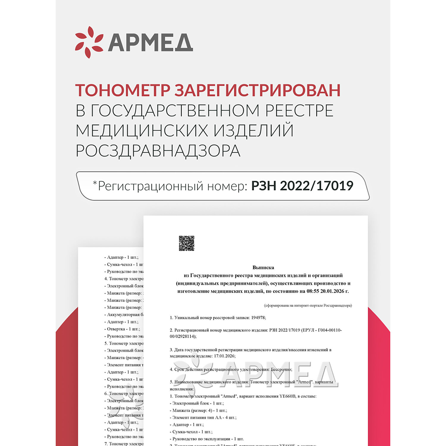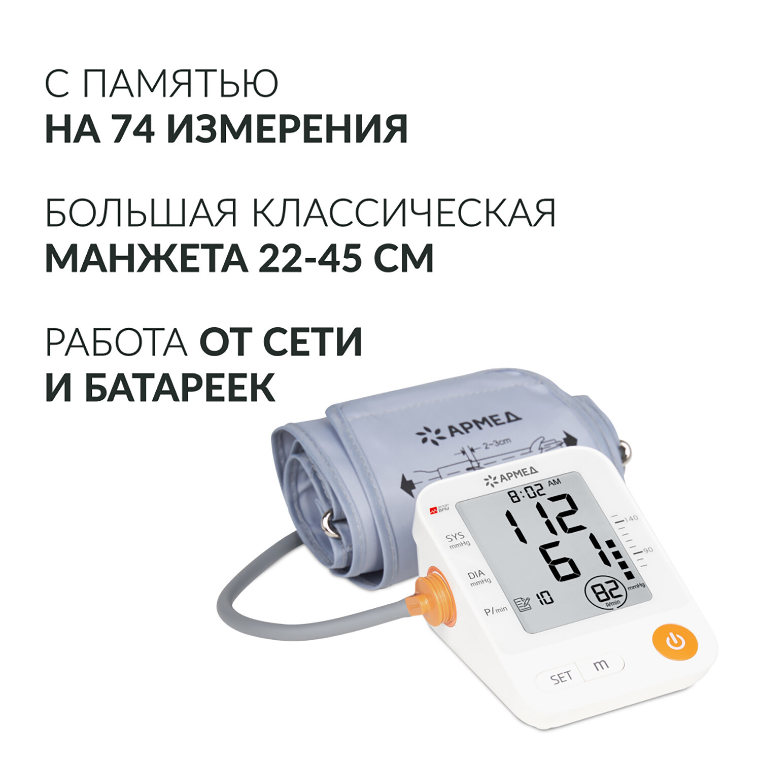 Тонометр АРМЕД YE670A 0-280 мм рт. ст., 40-200 уд/мин, автоматический, без поверки Код товара: 631780 2 677,5 ₽ Купить Производитель:АРМЕД Тонометр АРМЕД YE670A — это современный, точный и практичный прибор для ежедневного контроля артериального давления, созданный для заботы о здоровье всей семьи! Тонометр оснащён классической манжетой для руки окружностью 22–45 см, которая обеспечивает комфортную и надёжную фиксацию без пережимания, подходя как для хрупких, так и для крупных пользователей. Прибор автоматически измеряет систолическое и диастолическое давление в диапазоне 0–280 мм рт. ст. и пульс 40–200 уд/мин с высокой точностью: ±3 мм рт. ст. и ±5% соответственно. Все данные отображаются на чётком информативном дисплее, включая индикатор сердцебиения, уровень давления по цветовой шкале, время, дату и статус памяти. Устройство сохраняет 74 последних измерения и автоматически рассчитывает среднее значение по трём последним замерам, что особенно важно при мониторинге состояния по рекомендации врача. Питание осуществляется как от встроенных батареек АА, так и от сетевого адаптера (6 В, 3,6 Вт) — оба входят в комплект, что делает тонометр готовым к использованию сразу после распаковки и удобным для путешествий. Уровень шума всего 41 дБА обеспечивает тихую работу, не нарушающую покой. В комплекте — практичная сумка-чехол для хранения и транспортировки. Прибор зарегистрирован как медицинское изделие, соответствует требованиям Росздравнадзора. Производитель оставляет за собой право без предварительного уведомления вносить изменения в технические характеристики, комплектацию и конструкцию, не ухудшающие эксплуатационные характеристики изделия.Производство: КитайТип тонометра: АвтоматическийСерия: YE670AФиксация манжеты: на плечоМанжета min: 22 смМанжета max: 45 смОбъем памяти: 74 измеренийСпособ сброса воздуха: АвтоматическийДиапазон измерения давления, мм рт. ст.: 0-280Погрешность измерения давления: ±3 мм рт. ст.Диапазон измерения пульса, уд/мин: 40-200Погрешность измерения пульса: ±5%Расчёт среднего по последним трём измерениям: даУстановка времени и даты: даУровень шума, дБА: 41Питание от батареек: даТип элемента питания: АА х 4Питание от сети: даЧехол для хранения: даМатериал корпуса: пластикВысота: 8 смШирина: 10.5 смГлубина: 13.5Вес нетто: 0.37 кгВес: 740 грРазмер упаковки: 9.2 × 14.2 × 18 смОбъём: 0.0033 м3Промежуточная упаковка: 10 штТранспортная упаковка: 10 штШтрих-код: 4650168661863