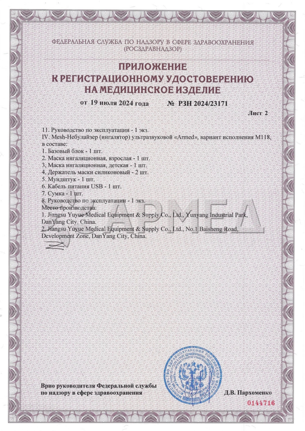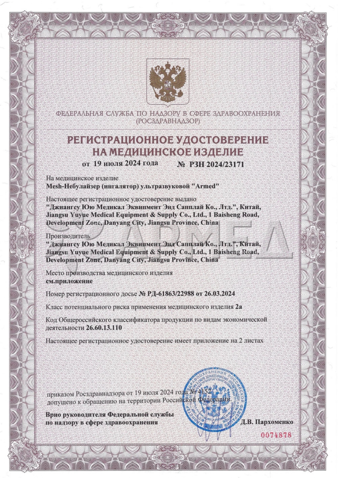 Ингалятор-небулайзер портативный ультразвуковой АРМЕД М102, производительность 0,2 мл/мин., объём 8 мл Код товара: 631781 2 218,5 ₽ Купить Производитель:АРМЕД Небулайзер АРМЕД М102 – это компактное, умное и удобное решение для эффективной ингаляционной терапии всей семьи! Благодаря ультразвуковой технологии распыления, он превращает лекарственный раствор в мелкодисперсный аэрозоль с частицами, способными проникать глубоко в дыхательные пути, обеспечивая быстрое и целенаправленное воздействие на слизистую. Прибор подходит как для взрослых, так и для детей: в комплекте идут детская, взрослая маски и мундштук, а тихая работа (всего 50 дБ) и короткое время процедуры делают лечение комфортным даже для малышей. Устройство невероятно простое в использовании: достаточно нажать одну кнопку – распыление начнётся автоматически, а по окончании отключится само, предварительно мигнув индикатором. Подготовка занимает считанные секунды: залейте до 8 мл раствора в чашу, подключите маску или мундштук – и можно начинать. После использования активируется режим автоматической промывки: просто залейте воду и нажмите кнопку – прибор сам очистит внутреннюю камеру, что гарантирует гигиеничность и долгий срок службы. Небулайзер питается от сети, USB (5 В) или 3 батареек АА (все в комплекте), что делает его по-настоящему мобильным – его можно брать в дорогу, на дачу или в гости. Вес – всего 150 г, размеры – 60х45х125 мм, а всё содержимое помещается в удобную сумку, входящую в набор. Прибор зарегистрирован как медицинское изделие, соответствует требованиям Росздравнадзора. Производитель оставляет за собой право без предварительного уведомления вносить изменения в технические характеристики, комплектацию и конструкцию, не ухудшающие эксплуатационные характеристики изделия.Производство: КитайТип распыления: УльтразвуковойСкорость распыления: 0.2 мл/минРежим работы: 60 минРежим паузы: 0 минМаксимальный объём раствора: 8 млРабочее давление компрессора: 0 кПаУровень шума, дБ: 50Материал корпуса: ПластикВысота: 12.5 смШирина: 6 смГлубина: 4.5 смВес нетто: 0.15 кгВес: 443 грРазмер упаковки: 15.1 × 16.5 × 7.4 смОбъём: 0.0025 м3Промежуточная упаковка: 10 штТранспортная упаковка: 10 штШтрих-код: 4650168662341 Файлы Сертификат-1.jpg Сертификат-2.jpg Сертификат-3.jpg
