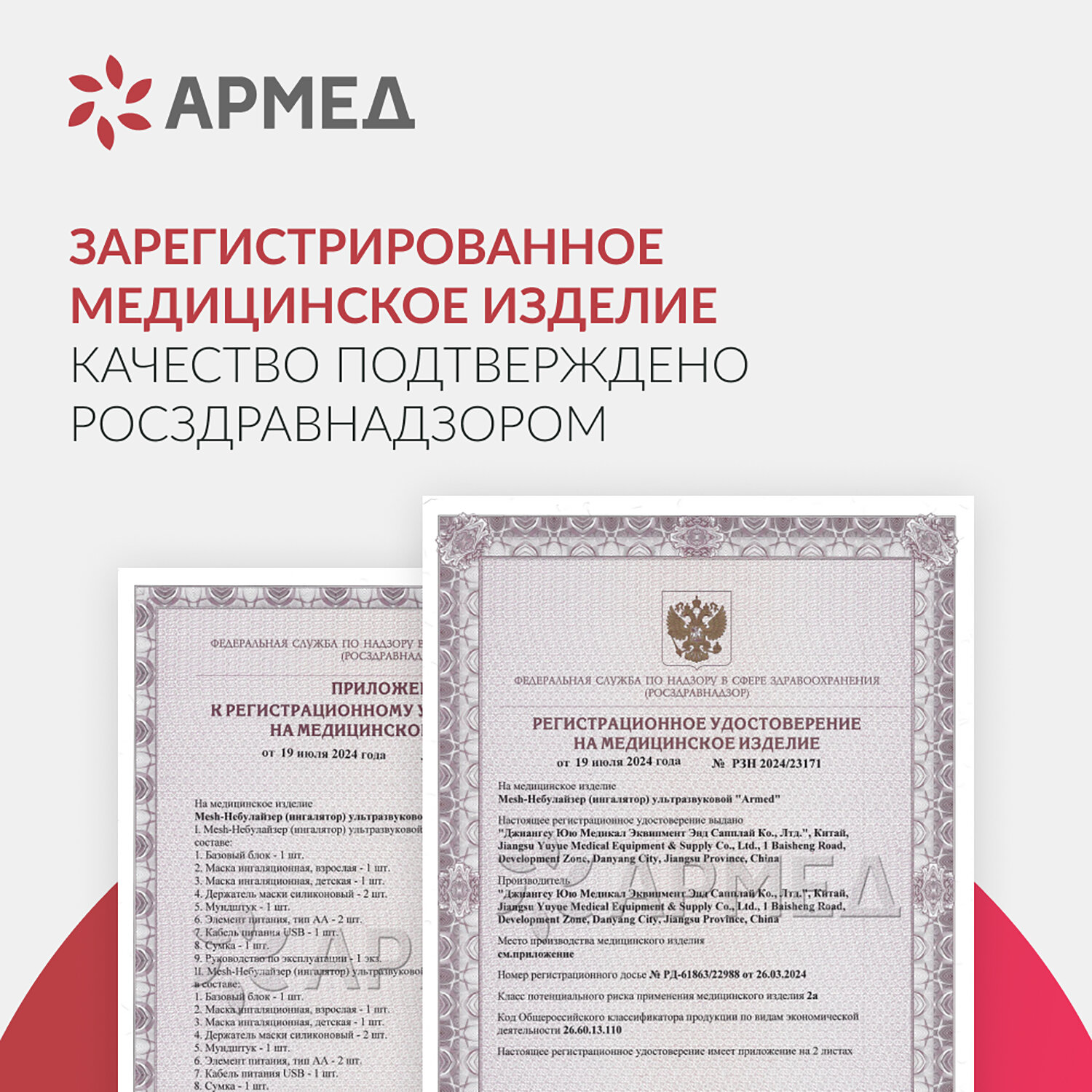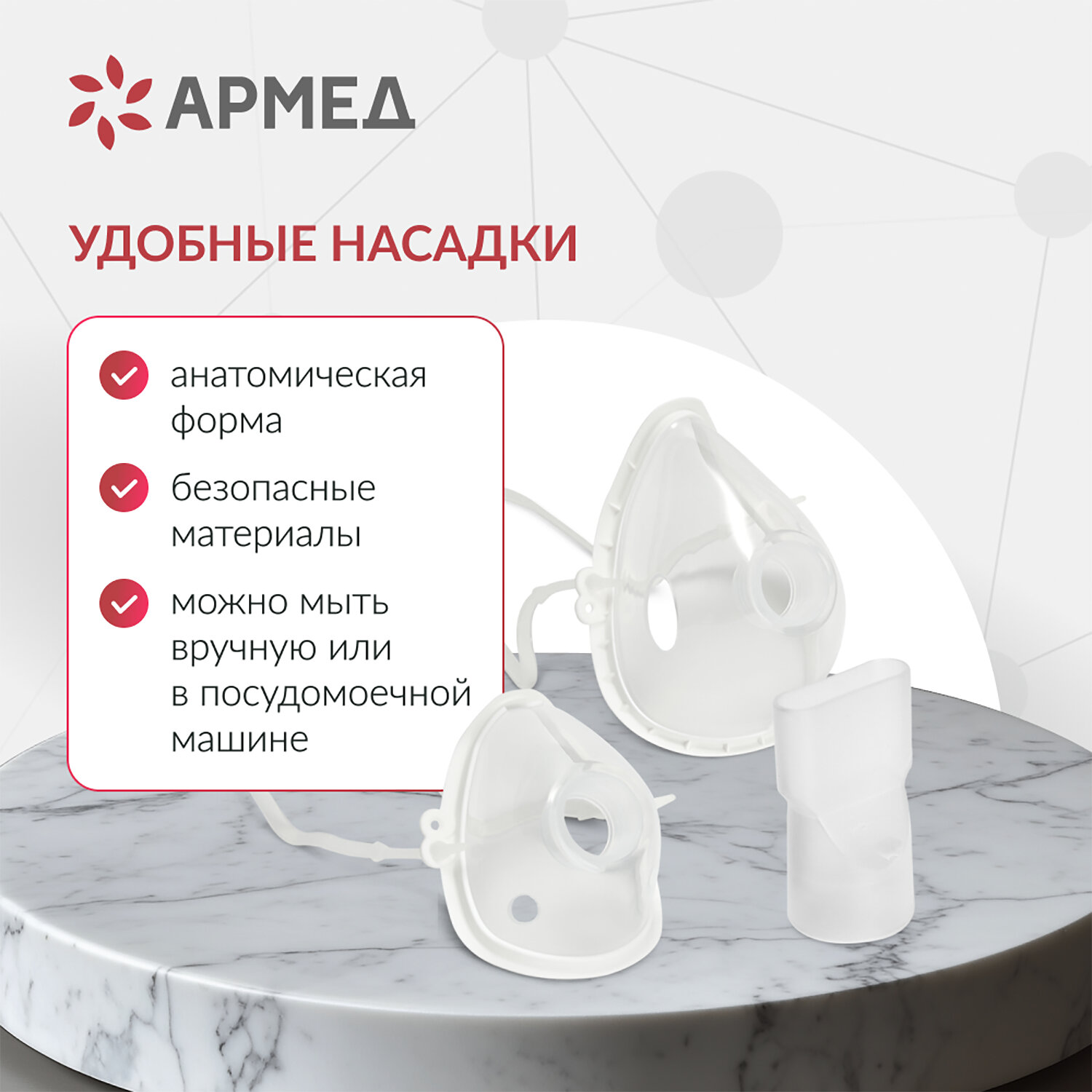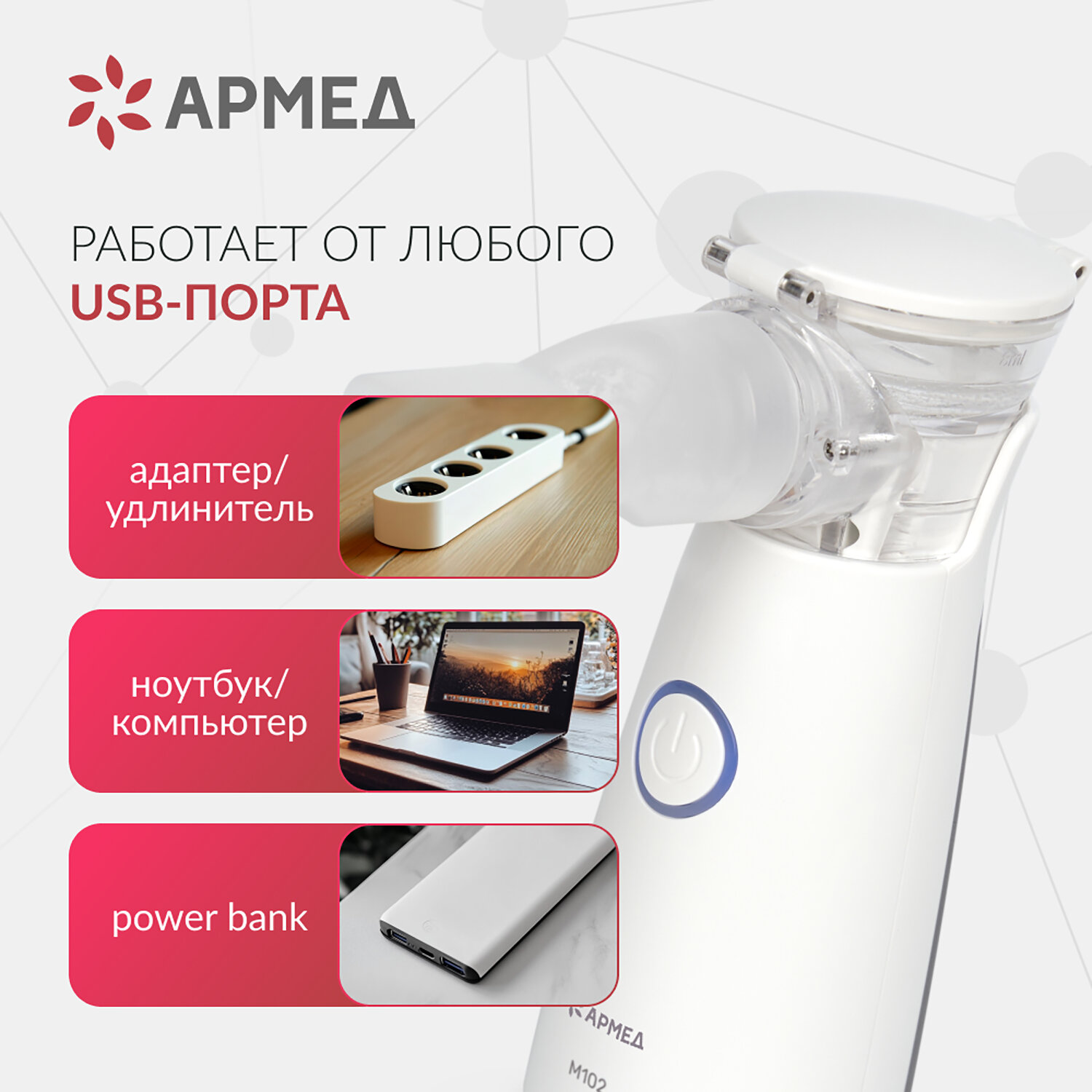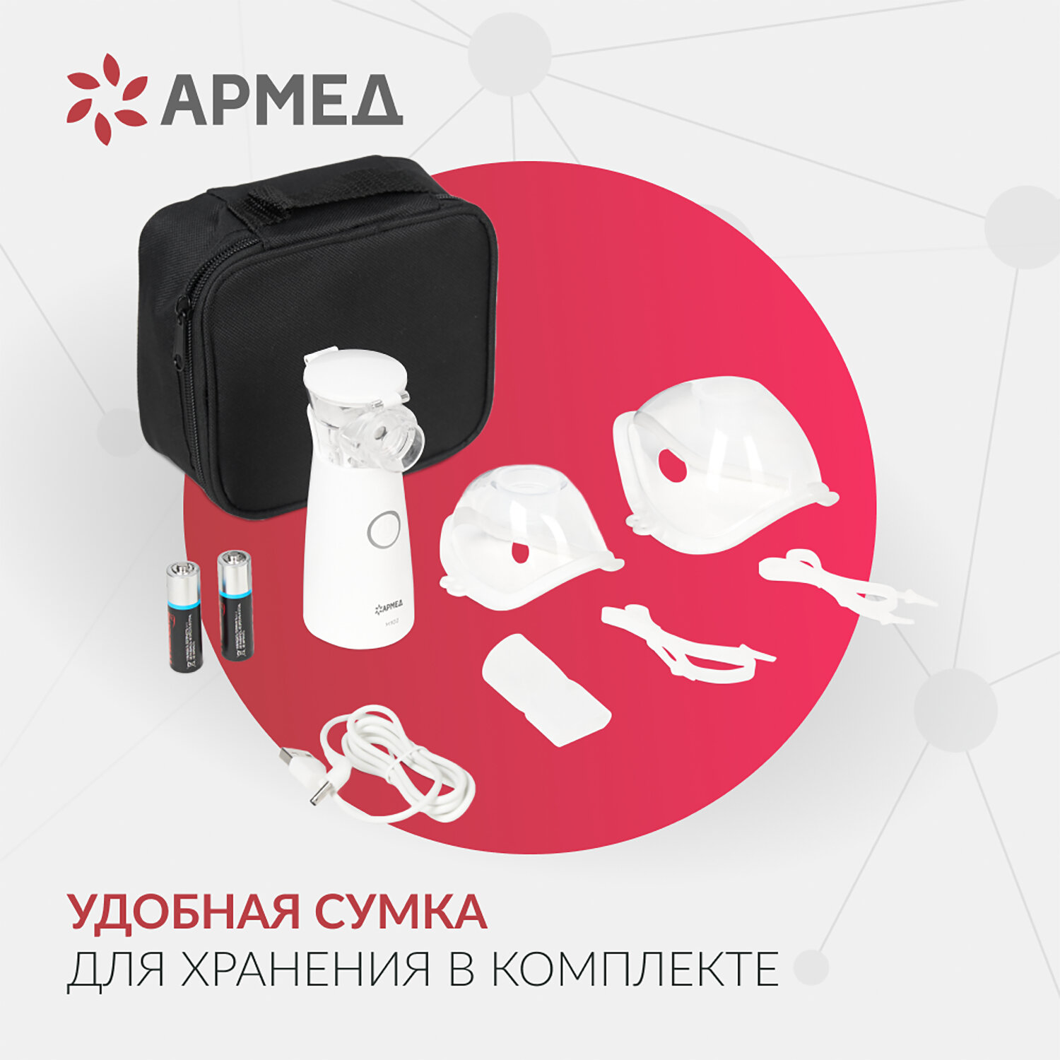 Ингалятор-небулайзер портативный ультразвуковой АРМЕД М102, производительность 0,2 мл Код товара: 631781 2 218,5 ₽ Купить Производитель:АРМЕД Небулайзер АРМЕД М102 — это компактное, умное и удобное решение для эффективной ингаляционной терапии всей семьи! Благодаря ультразвуковой технологии распыления, он превращает лекарственный раствор в мелкодисперсный аэрозоль с частицами, способными проникать глубоко в дыхательные пути, обеспечивая быстрое и целенаправленное воздействие на слизистую. Прибор подходит как для взрослых, так и для детей: в комплекте идут детская и взрослая маски, а также мундштук, а тихая работа (всего 50 дБ) и короткое время процедуры делают лечение комфортным даже для малышей. Устройство невероятно простое в использовании: достаточно нажать одну кнопку — распыление начнётся автоматически, а по окончании — отключится само, предварительно мигнув индикатором. Подготовка занимает считанные секунды: залейте до 8 мл раствора в чашу, подключите маску или мундштук — и можно начинать. После использования активируется режим автоматической промывки: просто залейте воду и нажмите кнопку — прибор сам очистит внутреннюю камеру, что гарантирует гигиеничность и долгий срок службы. Небулайзер питается от сети, USB (5 В) или 3 батареек АА (все в комплекте), что делает его по-настоящему мобильным — его можно брать в дорогу, на дачу или в гости. Вес всего 150 г, размеры — 60х45х125 мм, а всё содержимое помещается в удобную сумку, входящую в набор. Прибор зарегистрирован как медицинское изделие, соответствует требованиям Росздравнадзора. Производитель оставляет за собой право без предварительного уведомления вносить изменения в технические характеристики, комплектацию и конструкцию, не ухудшающие эксплуатационные характеристики изделия.Производство: КитайТип распыления: УльтразвуковойСкорость распыления: 0.2 мл/минРежим работы: 60 минРежим паузы: 0 минМаксимальный объём раствора: 8 млРабочее давление компрессора: 0 кПаУровень шума, дБ: 50Материал корпуса: ПластикВысота: 12.5 смШирина: 6 смГлубина: 4.5 смВес нетто: 0.15 кгВес: 350 грРазмер упаковки: 7.6 × 15 × 16 смОбъём: 0.0023 м3Промежуточная упаковка: 10 штТранспортная упаковка: 10 штШтрих-код: 4650168662341