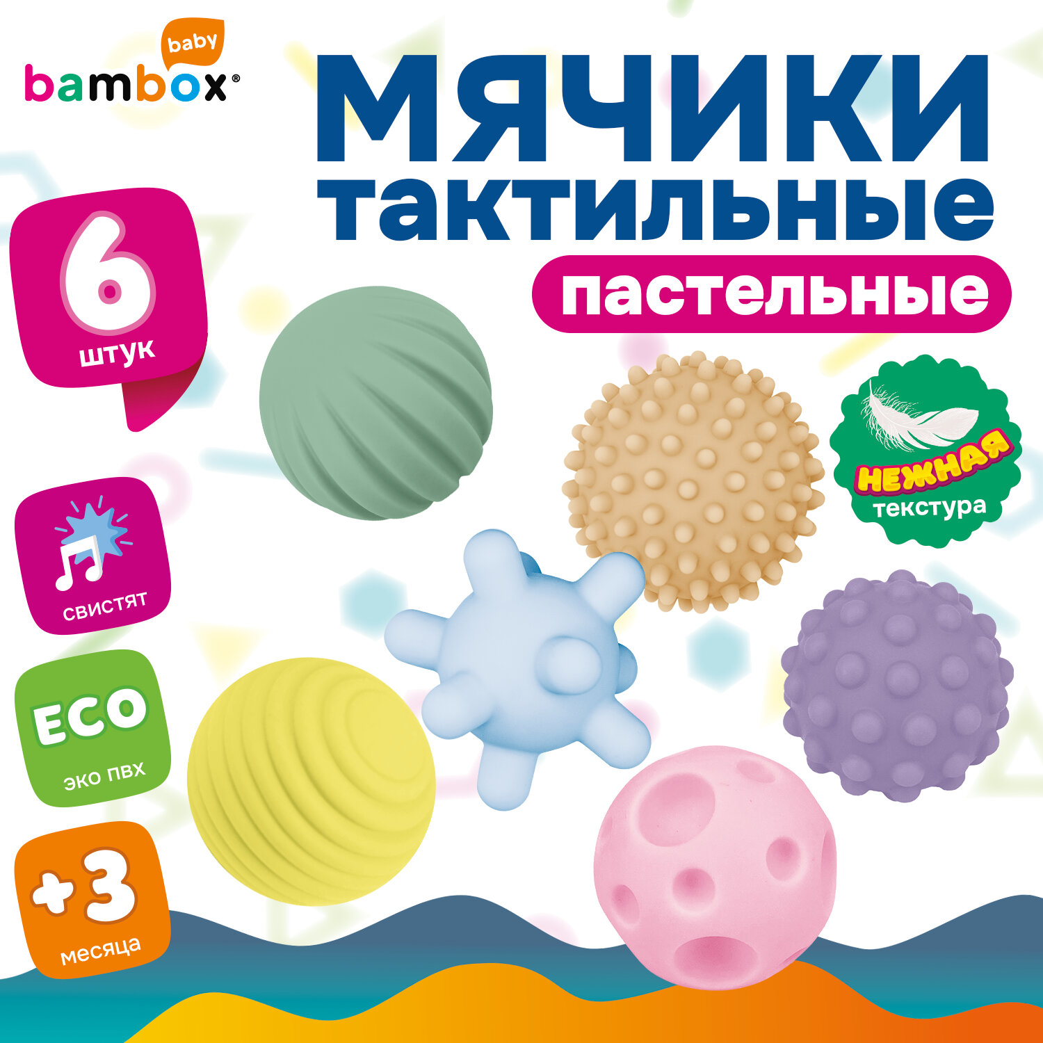 Тактильные мячики пастельные сенсорные игрушки развивающие ЭКО 6 штук d 60-80 мм, BAMBOX BABY (БАМБОКС БЭБИ), 665897 Код товара: 665897 241,83 ₽ Купить Производитель:BAMBOX Тактильные мячики пастельных цветов BAMBOX BABY – замечательный подарок для малыша. Игра с мячиками способствует развитию мелкой моторики, координации движений, пространственного мышления, снимает психологическое напряжение и дарит новые эмоции! Тактильные мячики пастельных цветов выполнены из безопасного ПВХ, очень приятные на ощупь, отлично ложатся в детскую ручку. Тактильные мячики – это простая, но очень функциональная развивающая забава для малыша. Отлично подходят для игр на суше и в воде. Ребёнок будет купаться с удовольствием! В наборе 6 тактильных мячиков различного рельефа и 6 разных цветов. Диаметр каждого мячика 55 мм. Изделия полые внутри, при надавливании издают мягкий, свистящий звук за счет выхода воздуха. Мягкие, но упругие шарики выполнены из экологически чистого ПВХ, имеющего сертификат ЕАС для выпуска детских товаров. Отсутствует резкий запах, не страшно, если ребенок будет их грызть во время занятий.Производство: КитайВид игрушки: мячикиКоличество в комплекте: 6 шт.Возраст ребенка: от 3 месЦвет: разноцветныйОсобенности : массажныеСюжет: тактильныеСерия: тактильные развивающие игрушкиМатериал: ПВХДлина: 7.5 смШирина: 13.5 смГлубина: 20.1 смУпаковка: сетка с тэгомВес: 244 грРазмер упаковки: 7.5 × 13.5 × 20.1 смОбъём: 0.0025 м3Промежуточная упаковка: 12 штТранспортная упаковка: 12 штШтрих-код: 4606224464558 Сертификат-1.jpg Сертификат-2.jpg