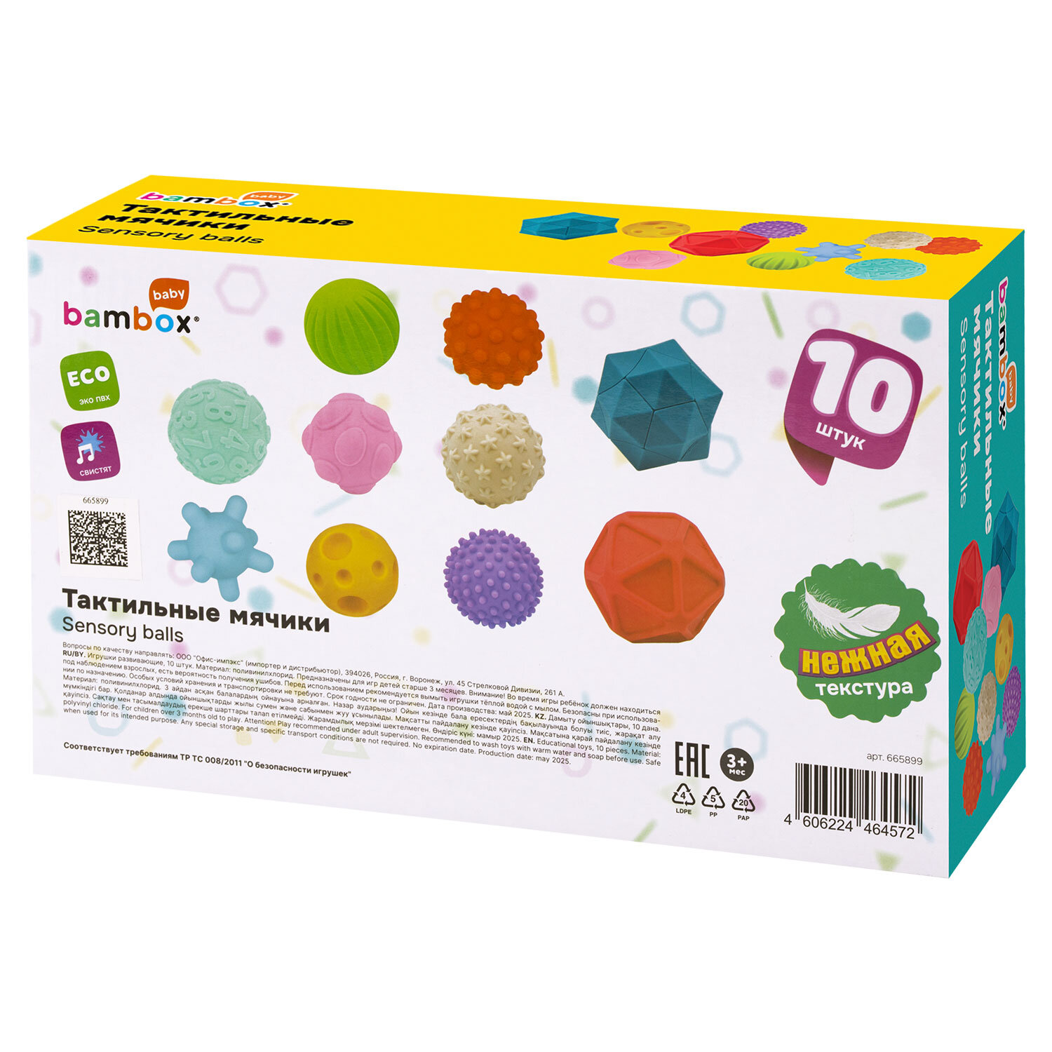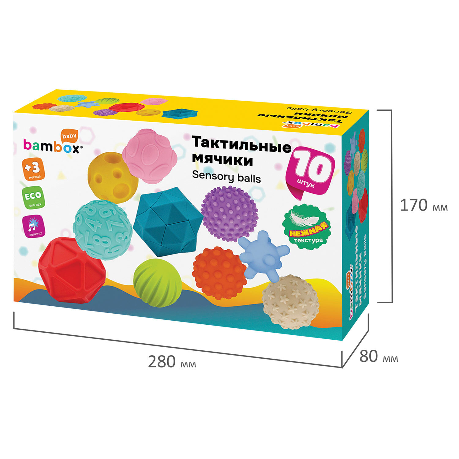 Тактильные мячики, сенсорные игрушки развивающие, ЭКО, 10 штук, диаметр 60-80 мм, BAMBOX BABY (БАМБОКС БЭБИ), 665899 Код товара: 665899 726,53 ₽ Купить Производитель:BAMBOX Тактильные мячики BAMBOX BABY – замечательный подарок для малыша. Игра с мячиками способствует развитию мелкой моторики, координации движений, пространственного мышления, снимает психологическое напряжение и дарит новые эмоции! Тактильные мячики ярких цветов выполнены из безопасного ПВХ, очень приятные на ощупь, отлично ложатся в детскую ручку. Тактильные мячики – это простая, но очень функциональная развивающая забава для малыша. Отлично подходят для игр на суше и в воде. Ребёнок будет купаться с удовольствием! В наборе 10 тактильных мячиков различного рельефа, формы, размера и цветов. Диаметр мячиков: от 6 см до 85 см. Изделия полые внутри, при надавливании издают мягкий, свистящий звук за счет выхода воздуха. Мягкие, но упругие шарики выполнены из экологически чистого ПВХ, имеющего сертификат ЕАС для выпуска детских товаров. Отсутствует резкий запах, не страшно, если ребенок будет их грызть во время занятий. Красиво оформленная яркая подарочная упаковка из плотного картона идеально подходит для вручения набора на день рождения и любой другой праздник.Производство: КитайВид игрушки: мячикиКоличество в комплекте: 10 шт.Возраст ребенка: от 3 месЦвет: разноцветныйОсобенности : массажныеСюжет: тактильныеСерия: тактильная развивающая игрушкаМатериал: ПВХ, эко-материалДлина: 28 смШирина: 17 смГлубина: 8 смУпаковка: подарочная коробкаВес: 488 грРазмер упаковки: 8.3 × 28.5 × 17 смОбъём: 0.0051 м3Промежуточная упаковка: 6 штТранспортная упаковка: 6 штШтрих-код: 4606224464572 Файлы Сертификат-1.jpg Сертификат-2.jpg Сертификат-3.jpg Сертификат-4.jpg