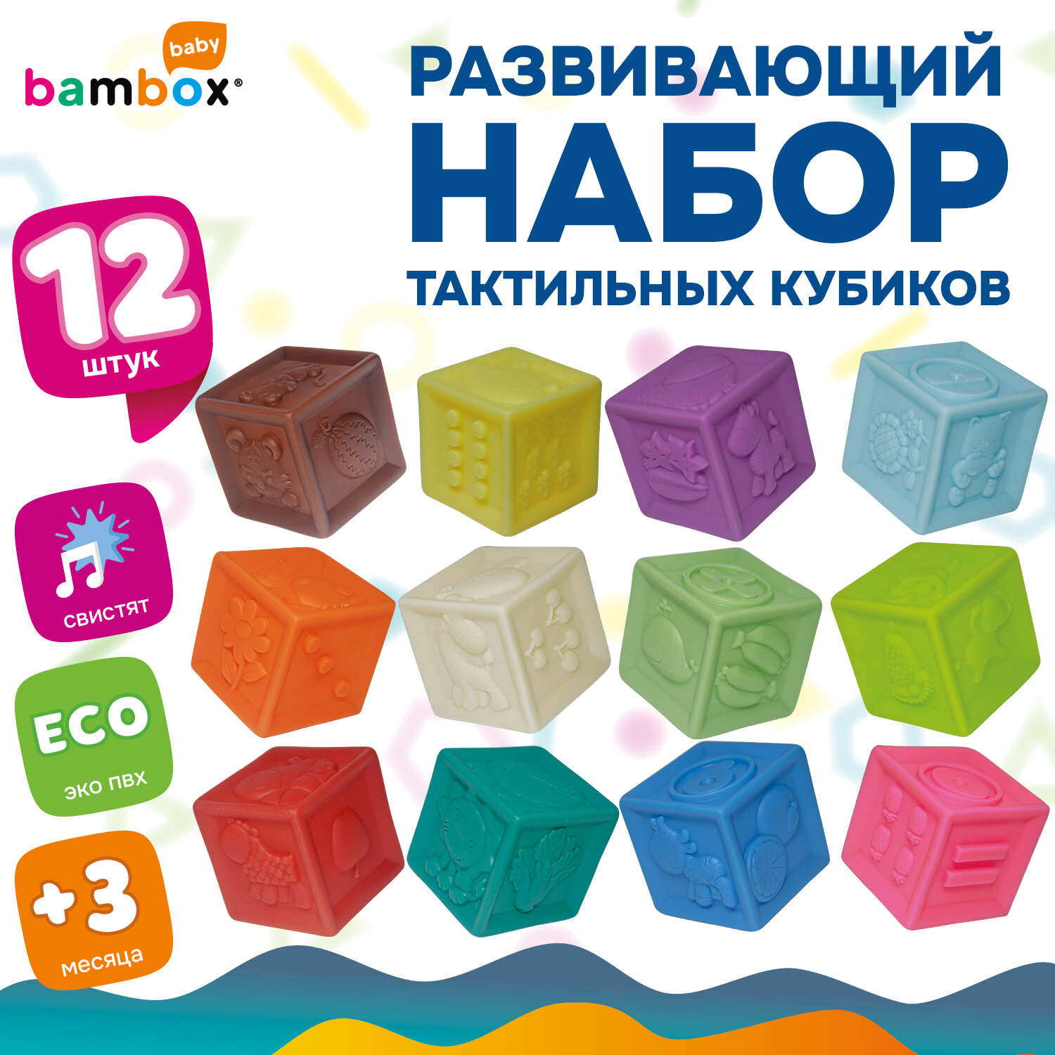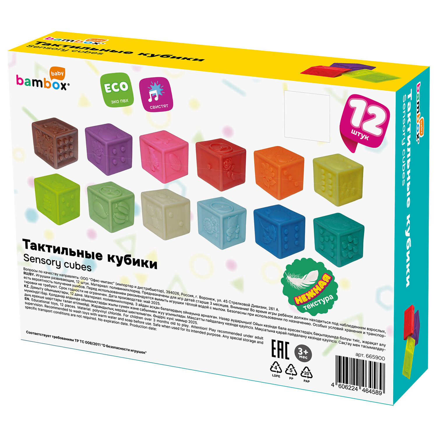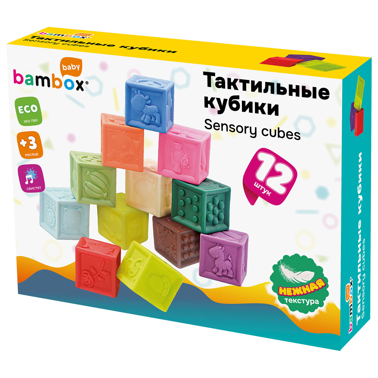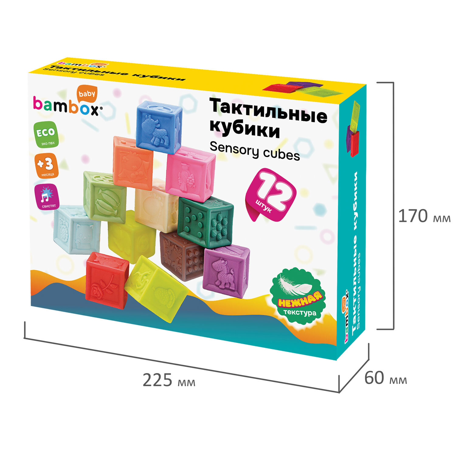Тактильные кубики сенсорные ЭКО 12 штук, BAMBOX BABY (БАМБОКС БЭБИ), 665900 Код товара: 665900 912,12 ₽ Купить Производитель:BAMBOX Тактильные кубики BAMBOX BABY ярких оттенков – замечательный подарок для малыша. Игра с кубиками способствует развитию мелкой моторики, координации движений, пространственного мышления, снимает психологическое напряжение и дарит новые эмоции! Развивающие тактильные кубики ярких оттенков выполнены из безопасного ПВХ, приятные на ощупь. Размер кубиков позволяет малышу удобно держать их в маленькой ручке. Размер одного кубика 5,5*5,5*5,5 см. Тактильные кубики – это простая, но очень функциональная развивающая забава для малыша. С такими кубиками ребёнок точно выучит цвета, цифры, формы, предметы и животных. Отлично подходят для игр на суше и в в воде. Ребёнок будет играть, строить и купаться, познавая окружающий мир с удовольствием! В наборе 12 тактильных кубиков с объемными и рельефными обучающими гранями. Изделия полые внутри, при надавливании издают мягкий, свистящий звук за счет выхода воздуха. Мягкие, но упругие шарики выполнены из экологически чистого ПВХ, имеющего сертификат ЕАС для выпуска детских товаров. Отсутствует резкий запах, не страшно, если ребенок будет их грызть во время занятий. Красиво оформленная яркая подарочная упаковка из плотного картона идеально подходит для вручения набора на день рождения и любой другой праздник.Производство: КитайВид игрушки: кубикиКоличество в комплекте: 12 шт.Возраст ребенка: от 3 месЦвет: разноцветныйОсобенности : сенсорныеСюжет: тактильныеСерия: тактильные развивающие игрушкиМатериал: ПВХДлина: 22.5 смШирина: 17 смГлубина: 6 смУпаковка: подарочная коробкаВес: 620 грРазмер упаковки: 6.3 × 16.4 × 24.4 смОбъём: 0.0031 м3Промежуточная упаковка: 6 штТранспортная упаковка: 6 штШтрих-код: 4606224464589 Сертификат-1.jpg Сертификат-2.jpg