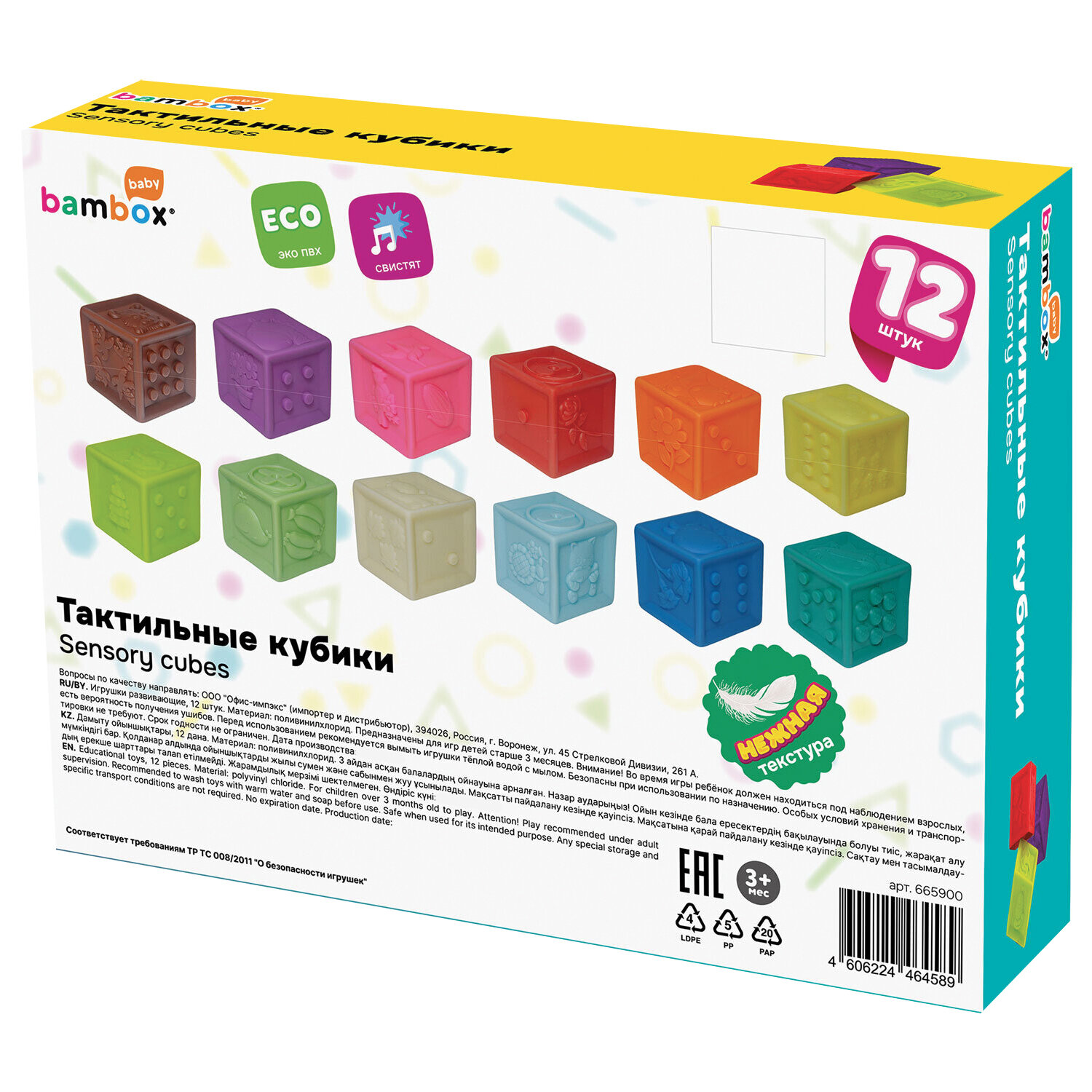 Тактильные кубики, сенсорные, ЭКО 12 штук, BAMBOX BABY (БАМБОКС БЭБИ), 665900 Код товара: 665900 912,12 ₽ Купить Производитель:BAMBOX Тактильные кубики BAMBOX BABY ярких оттенков – замечательный подарок для малыша. Игра с кубиками способствует развитию мелкой моторики, координации движений, пространственного мышления, снимает психологическое напряжение и дарит новые эмоции! Развивающие тактильные кубики ярких оттенков выполнены из безопасного ПВХ, приятные на ощупь. Размер кубиков позволяет малышу удобно держать их в маленькой ручке. Размер одного кубика – 5,5х5,5х5,5 см. Тактильные кубики – это простая, но очень функциональная развивающая забава для малыша. С такими кубиками ребёнок точно выучит цвета, цифры, формы, предметы и животных. Отлично подходят для игр на суше и в воде. Ребёнок будет играть, строить и купаться, познавая окружающий мир с удовольствием! В наборе 12 тактильных кубиков с объемными и рельефными обучающими гранями. Изделия полые внутри, при надавливании издают мягкий, свистящий звук за счет выхода воздуха. Мягкие, но упругие шарики выполнены из экологически чистого ПВХ, имеющего сертификат ЕАС для выпуска детских товаров. Отсутствует резкий запах, не страшно, если ребенок будет их грызть во время занятий. Красиво оформленная яркая подарочная упаковка из плотного картона идеально подходит для вручения набора на день рождения и любой другой праздник.Производство: КитайВид игрушки: кубикиКоличество в комплекте: 12 шт.Возраст ребенка: от 3 месЦвет: разноцветныйОсобенности : сенсорныеСюжет: яркиеСерия: тактильная развивающая игрушкаМатериал: ПВХ, эко-материалДлина: 22.5 смШирина: 17 смГлубина: 6 смУпаковка: подарочная коробкаВес: 610 грРазмер упаковки: 6.4 × 23 × 17.2 смОбъём: 0.0034 м3Промежуточная упаковка: 6 штТранспортная упаковка: 6 штШтрих-код: 4606224464589 Файлы Сертификат-1.jpg Сертификат-2.jpg Сертификат-3.jpg Сертификат-4.jpg