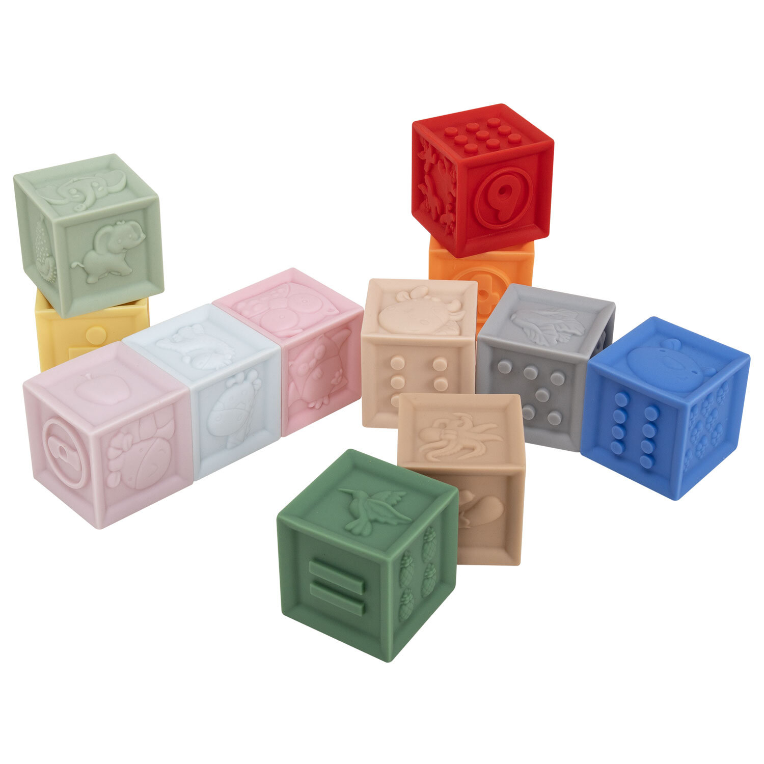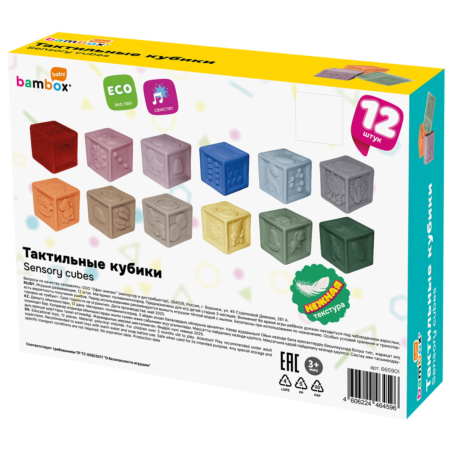 Тактильные кубики пастельные сенсорные с функцией сортера ЭКО 12 штук, BAMBOX BABY (БАМБОКС БЭБИ), 665901 Код товара: 665901 902,38 ₽ Купить Производитель:BAMBOX Тактильные кубики BAMBOX BABY в пастельных оттенках – замечательный подарок для малыша. Игра с кубиками способствует развитию мелкой моторики, координации движений, пространственного мышления, снимает психологическое напряжение и дарит новые эмоции! Развивающие тактильные кубики пастельных оттенков выполнены из безопасного ПВХ, приятные на ощупь. Размер кубиков позволяет малышу удобно держать их в маленькой ручке. Размер одного кубика 5,5*5,5*5,5 см. Тактильные кубики – это простая, но очень функциональная развивающая забава для малыша. С такими кубиками ребёнок точно выучит цвета, цифры, формы, предметы и животных. Отлично подходят для игр на суше и в воде. Ребёнок будет играть, строить и купаться, познавая окружающий мир с удовольствием! В наборе 12 тактильных кубиков с объемными и рельефными обучающими гранями. Изделия полые внутри, при надавливании издают мягкий, свистящий звук за счет выхода воздуха. Мягкие, но упругие шарики выполнены из экологически чистого ПВХ, имеющего сертификат ЕАС для выпуска детских товаров. Отсутствует резкий запах, не страшно, если ребенок будет их грызть во время занятий. Красиво оформленная яркая подарочная упаковка из плотного картона идеально подходит для вручения набора на день рождения и любой другой праздник.Производство: КитайВид игрушки: кубикиКоличество в комплекте: 12 шт.Возраст ребенка: от 3 месЦвет: разноцветныйОсобенности : сенсорныеСюжет: тактильныеСерия: тактильные развивающие игрушкиМатериал: ПВХДлина: 22.5 смШирина: 17 смГлубина: 6 смУпаковка: подарочная коробкаВес: 620 грРазмер упаковки: 6.3 × 16.4 × 24.4 смОбъём: 0.0031 м3Промежуточная упаковка: 6 штТранспортная упаковка: 6 штШтрих-код: 4606224464596 Сертификат-1.jpg Сертификат-2.jpg