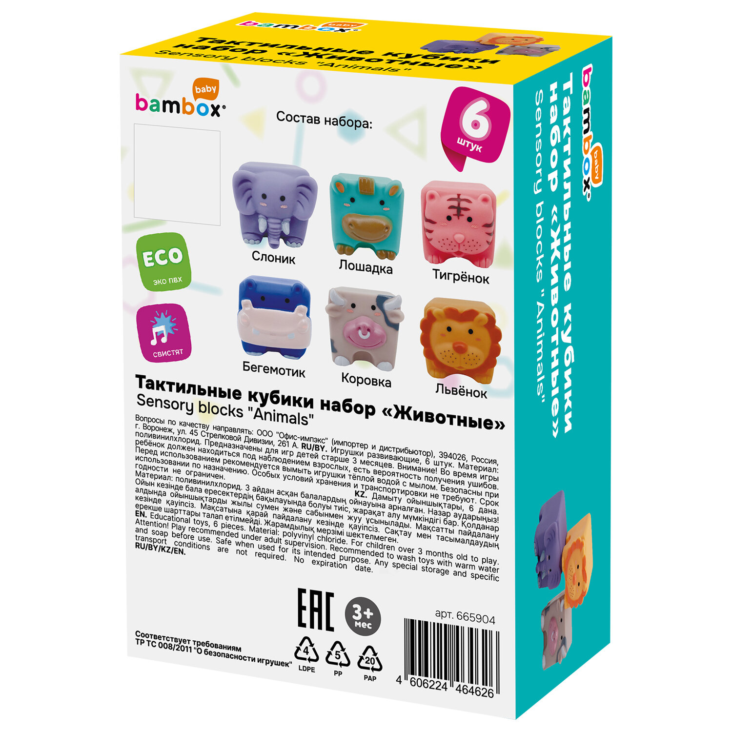Тактильные кубики "Животные", сенсорные игрушки развивающие, ЭКО, 6 штук, BAMBOX BABY (БАМБОКС БЭБИ), 665904 Код товара: 665904 570,77 ₽ Купить Производитель:BAMBOX Тактильные кубики-животные BAMBOX BABY – замечательный подарок для малыша. Игра с кубиками способствует развитию мелкой моторики, координации движений, пространственного мышления, снимает психологическое напряжение и дарит новые эмоции! Развивающие тактильные кубики-животные выполнены из безопасного ПВХ, приятные на ощупь. Размер кубиков позволяет малышу удобно держать их в маленькой ручке. Каждый кубик размером 4,5х5х5,5 см. Тактильные кубики – это простая, но очень функциональная развивающая забава для малыша. С такими кубиками ребёнок точно выучит цвета и научится различать животных. Отлично подходят для игр на суше и в воде. Ребёнок будет играть, строить и купаться, познавая окружающий мир с удовольствием! В наборе 6 тактильных кубиков с изображением животных: слоник, лошадка, тигрёнок, бегемотик, коровка, львёнок. Изделия полые внутри, при надавливании издают мягкий, свистящий звук за счет выхода воздуха. Мягкие, но упругие шарики выполнены из экологически чистого ПВХ, имеющего сертификат ЕАС для выпуска детских товаров. Отсутствует резкий запах, не страшно, если ребенок будет их грызть во время занятий. Красиво оформленная яркая подарочная упаковка из плотного картона идеально подходит для вручения набора на день рождения и любой другой праздник.Производство: КитайВид игрушки: кубикиКоличество в комплекте: 6 шт.Возраст ребенка: от 3 месЦвет: разноцветныйОсобенности : сенсорныеСюжет: яркиеСерия: тактильная развивающая игрушкаМатериал: ПВХ, эко-материалДлина: 15.5 смШирина: 14 смГлубина: 7 смУпаковка: подарочная коробкаВес: 271 грРазмер упаковки: 7.2 × 16.5 × 11.4 смОбъём: 0.0017 м3Промежуточная упаковка: 12 штТранспортная упаковка: 12 штШтрих-код: 4606224464626 Файлы Сертификат-1.jpg Сертификат-2.jpg Сертификат-3.jpg Сертификат-4.jpg