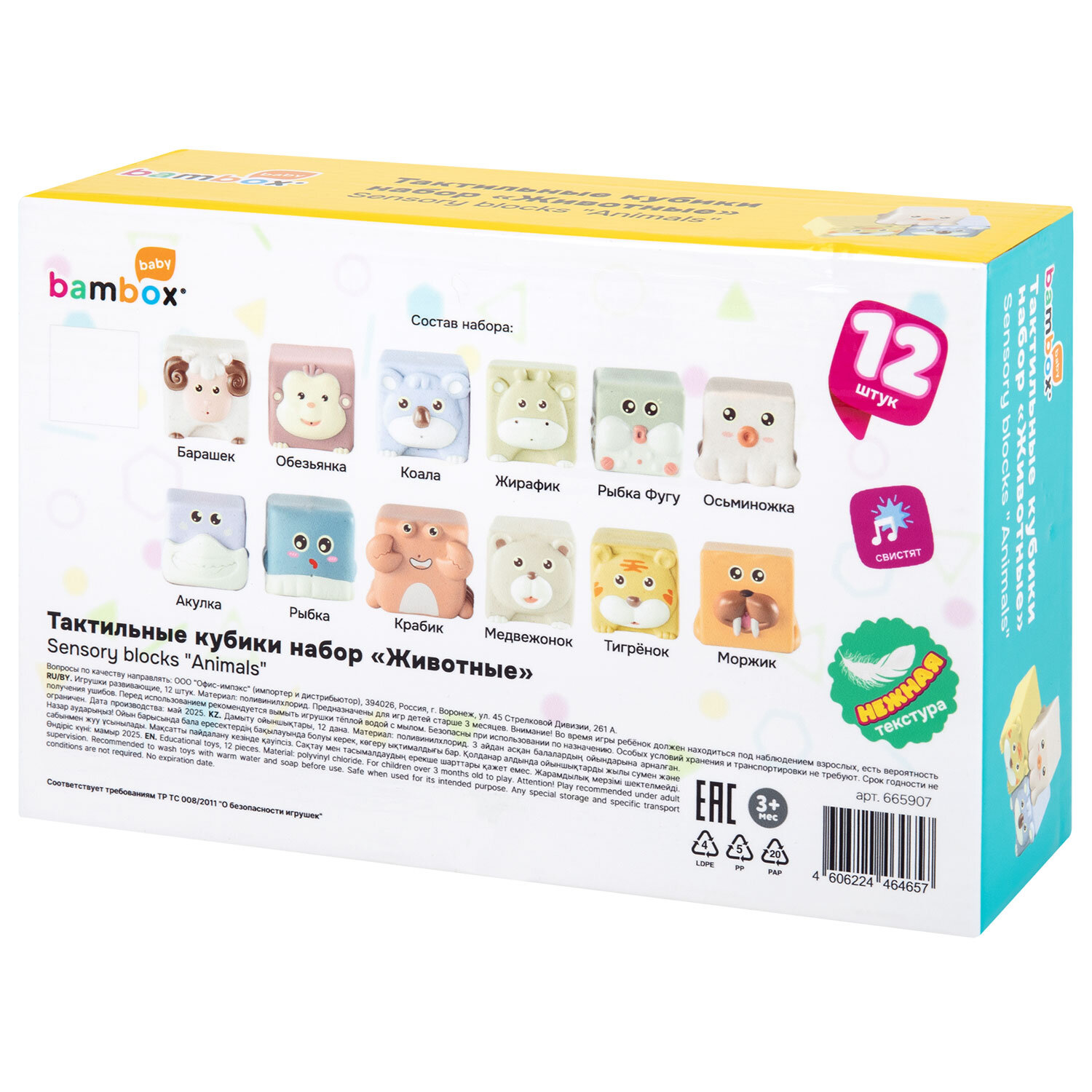 Тактильные кубики Животные сенсорные игрушки развивающие ЭКО 12 штук, BAMBOX BABY (БАМБОКС БЭБИ), 665907 Код товара: 665907 1 148,18 ₽ Купить Производитель:BAMBOX Тактильные кубики BAMBOX BABY в пастельных оттенках – замечательный подарок для малыша. Игра с кубиками способствует развитию мелкой моторики, координации движений, пространственного мышления, снимает психологическое напряжение и дарит новые эмоции! Развивающие тактильные кубики пастельных оттенков выполнены из безопасного ПВХ, приятные на ощупь. Размер кубиков позволяет малышу удобно держать их в маленькой ручке. Каждый кубик 5,3*6,1*5,1 см. Тактильные кубики – это простая, но очень функциональная развивающая забава для малыша. С такими кубиками ребёнок точно выучит цвета, научится считать и различать животных. Отлично подходят для игр на суше и в в воде. Ребёнок будет играть, строить и купаться, познавая окружающий мир с удовольствием! В наборе 12 тактильных кубиков с изображением животных: Барашек, Обезьянка, Коала, Жирафик, Рыбка Фугу, Осьминожка, Акулка, Рыбка, Крабик, Медвежонок, Тигрёнок, Моржик. Изделия полые внутри.Производство: КитайВид игрушки: кубикиКоличество в комплекте: 12 шт.Возраст ребенка: от 3 месЦвет: разноцветныйОсобенности : сенсорныеСюжет: животныеСерия: тактильные развивающие игрушкиМатериал: ПВХ, эко материалДлина: 25.5 смШирина: 16.5 смГлубина: 6.3 смУпаковка: подарочная коробкаВес: 583 грРазмер упаковки: 6.3 × 16.5 × 25.5 смОбъём: 0.0032 м3Промежуточная упаковка: 6 штТранспортная упаковка: 6 штШтрих-код: 4606224464657 Сертификат-1.jpg Сертификат-2.jpg