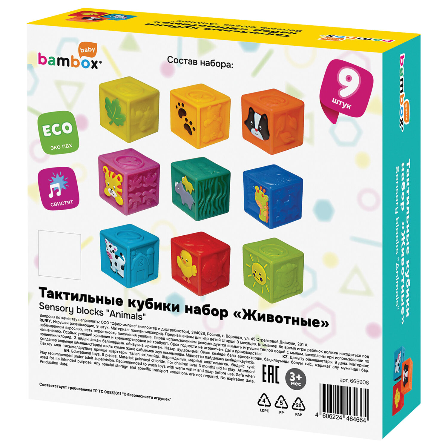 Тактильные кубики, сенсорные игрушки развивающие, ЭКО, 9 штук, BAMBOX BABY (БАМБОКС БЭБИ), 665908 Код товара: 665908 929,59 ₽ Купить Производитель:BAMBOX Яркие, красочные тактильные кубики BAMBOX BABY – замечательный подарок для малыша. Игра с кубиками способствует развитию мелкой моторики, координации движений, пространственного мышления, снимает психологическое напряжение и дарит новые эмоции! Развивающие тактильные кубики выполнены из безопасного ПВХ, приятные на ощупь. Размер кубиков позволяет малышу удобно держать их в маленькой ручке. Каждый кубик размером 5х5х5 см. Тактильные кубики – это простая, но очень функциональная развивающая забава для малыша. С такими кубиками ребёнок точно выучит цвета, цифры, предметы и животных. Отлично подходят для игр на суше и в воде. Ребёнок будет играть, строить и купаться, познавая окружающий мир с удовольствием! В наборе 9 тактильных кубиков, имеющих различную текстуру и цвета. Изделия полые внутри.Производство: КитайВид игрушки: кубикиКоличество в комплекте: 9 шт.Возраст ребенка: от 3 месЦвет: разноцветныйОсобенности : сенсорныеСюжет: кубикиСерия: тактильная развивающая игрушкаМатериал: ПВХ, эко-материалДлина: 21 смШирина: 21 смГлубина: 6 смУпаковка: подарочная коробкаВес: 446 грРазмер упаковки: 5.9 × 17 × 16.4 смОбъём: 0.0022 м3Промежуточная упаковка: 12 штТранспортная упаковка: 12 штШтрих-код: 4606224464664 Файлы Сертификат-1.jpg Сертификат-2.jpg Сертификат-3.jpg Сертификат-4.jpg