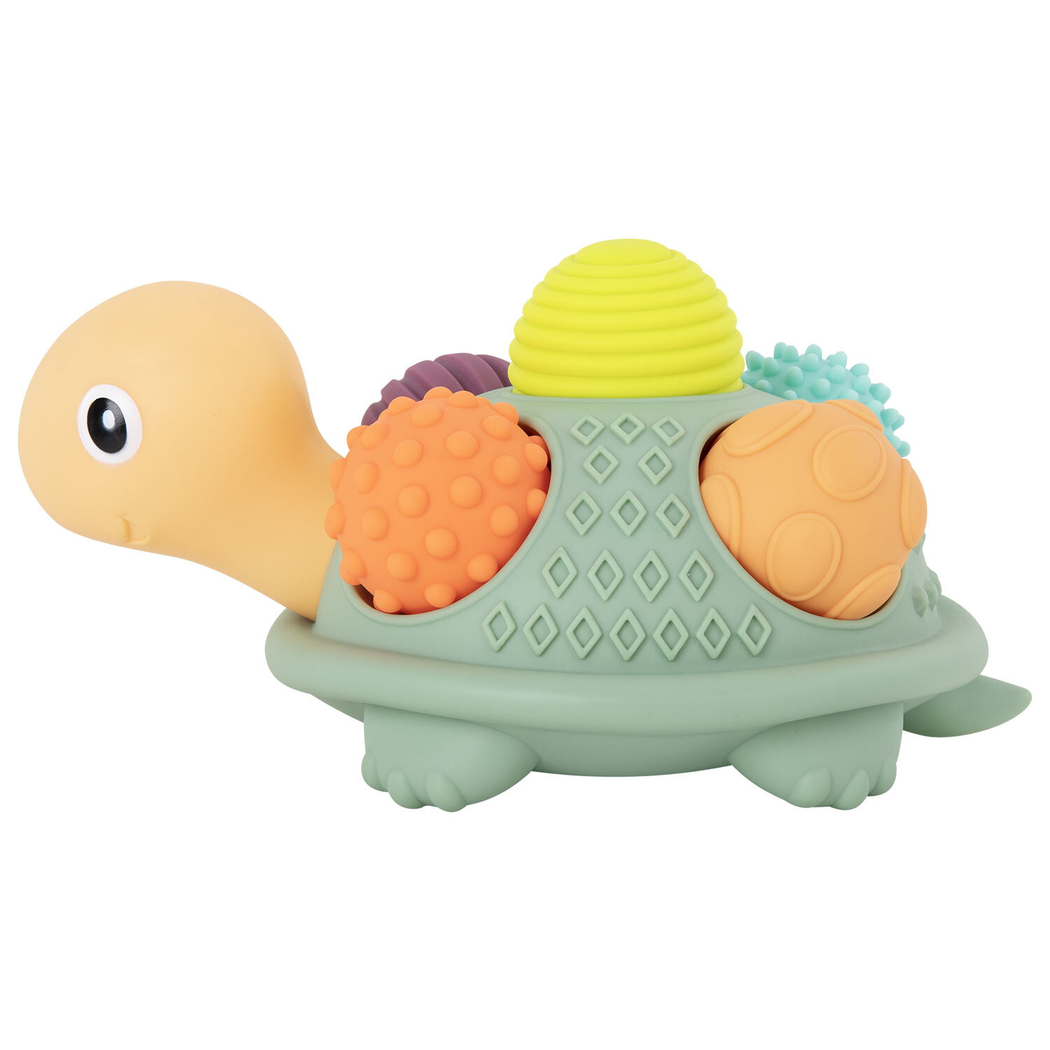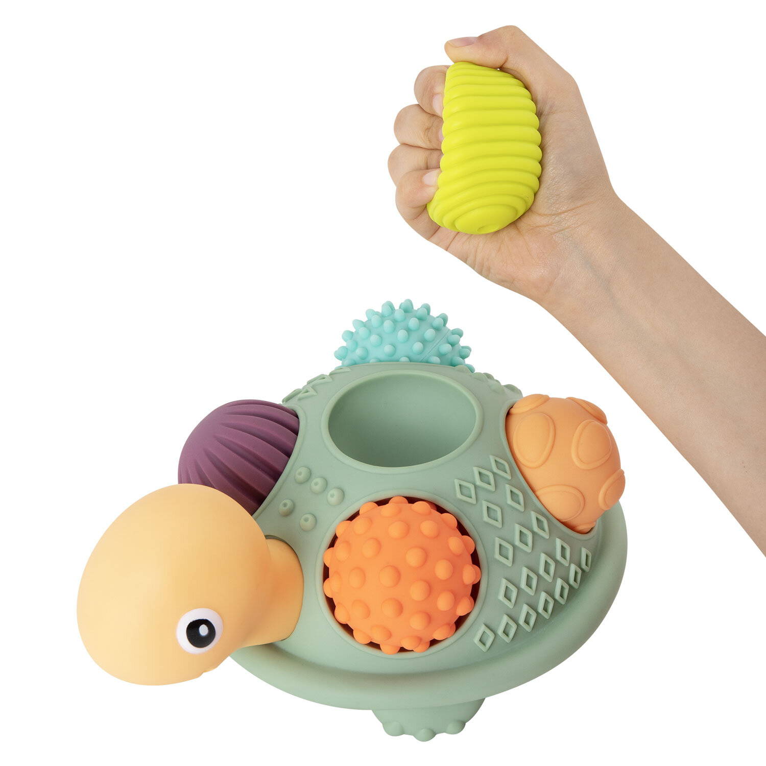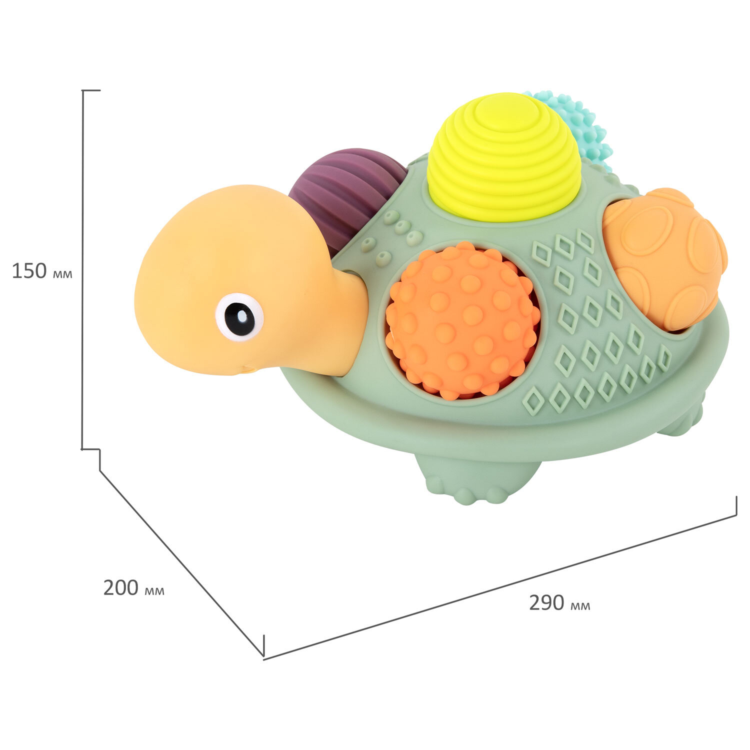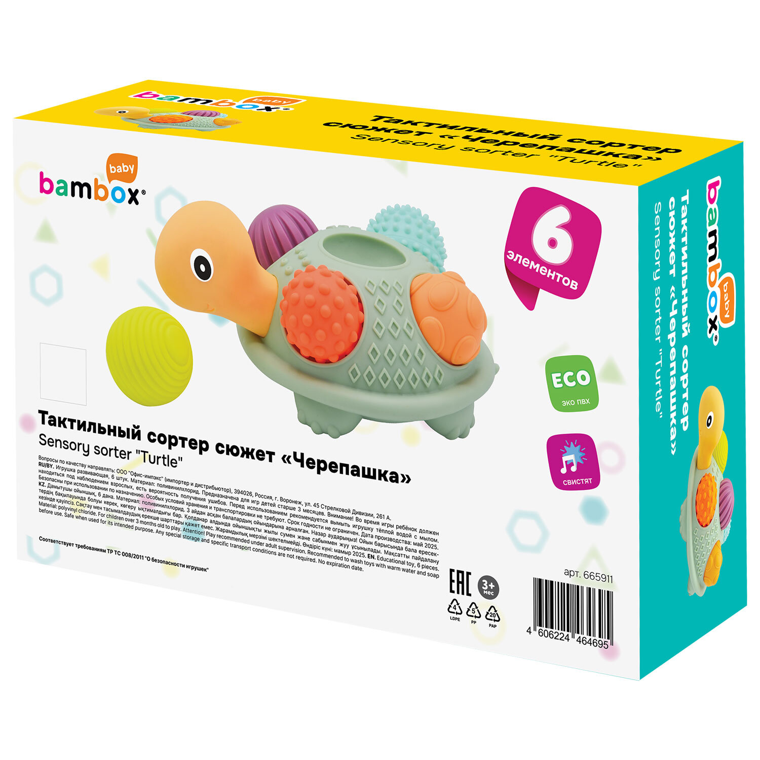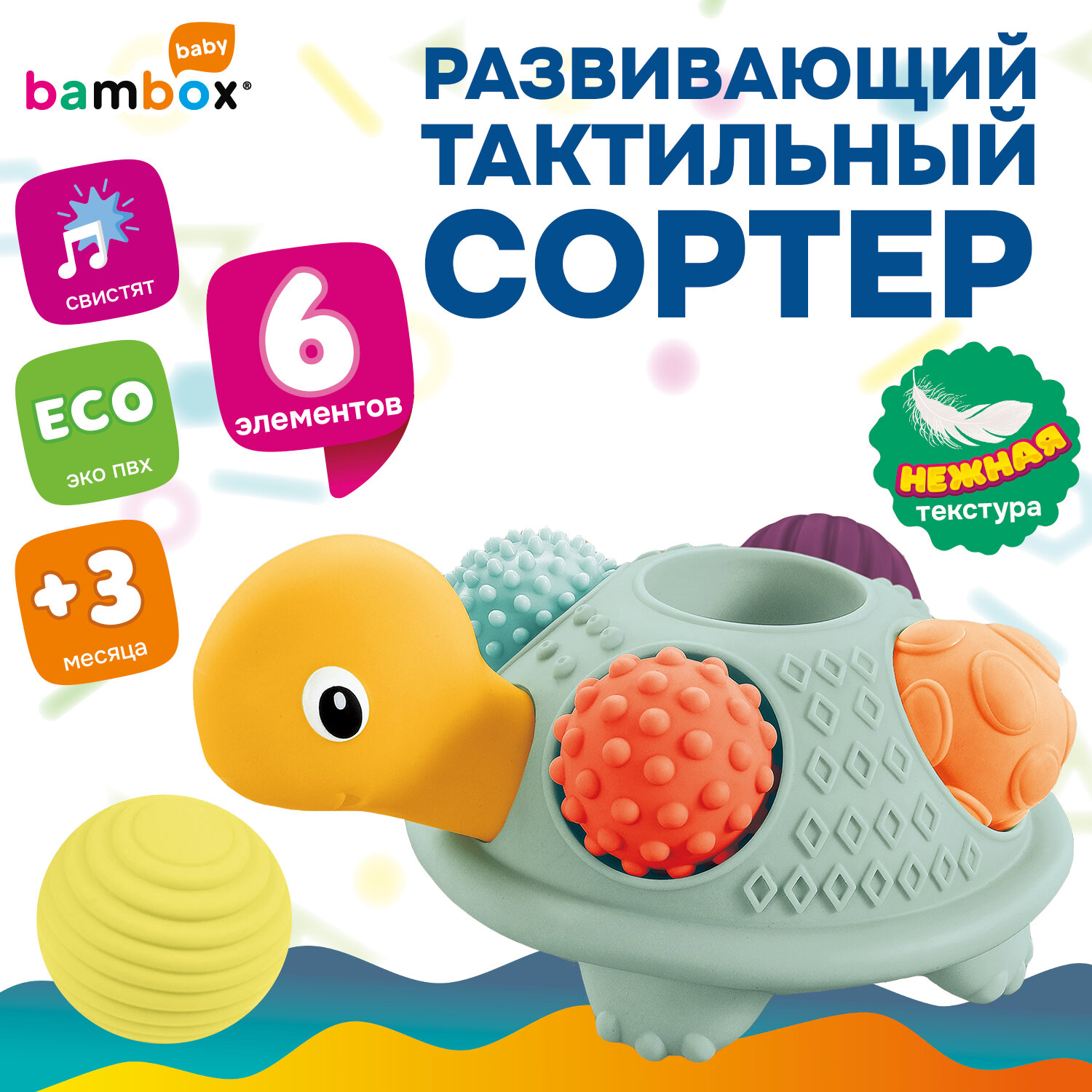 Тактильная игрушка сортер Черепашка с мячиками 5 шт сенсорная развивающая ЭКО, BAMBOX BABY (БАМБОКС БЭБИ), 665911 Код товара: 665911 1 246,1 ₽ Купить Производитель:BAMBOX Яркий и красочный тактильный сортер Черепашка BAMBOX BABY – замечательный подарок для малыша. Игра с сортером способствует развитию мелкой моторики, координации движений, пространственного мышления, снимает психологическое напряжение и дарит новые эмоции! Сортер представляет собой основание в виде Черепашки и 5 тактильных мячиков. Все изделия выполнены из безопасного ПВХ, очень приятные на ощупь. Массажные мячики полые внутри. Всего 5 тактильных мячиков различного цвета и рельефа. Диаметр мячиков от 6,3 до 7,0 см. При надавливании изделия издают мягкий свистящий звук за счет выхода воздуха. Игрушки из набора отлично подходят для игр на суше и в воде. Ребёнок точно будет купаться с удовольствием и интересом!Производство: КитайВид игрушки: Тактильная игрушка ЧерепашкаКоличество в комплекте: 6 шт.Возраст ребенка: от 3 месЦвет: разноцветныйОсобенности : сенсорные, массажные, сортерСюжет: ЧерепашкаСерия: тактильная развивающая игрушкаМатериал: ПВХДлина: 26 смШирина: 26 смГлубина: 14 смУпаковка: подарочная коробкаВес: 783 грРазмер упаковки: 14 × 26 × 26 смОбъём: 0.0107 м3Промежуточная упаковка: 12 штТранспортная упаковка: 12 штШтрих-код: 4606224464695 Сертификат-1.jpg Сертификат-2.jpg