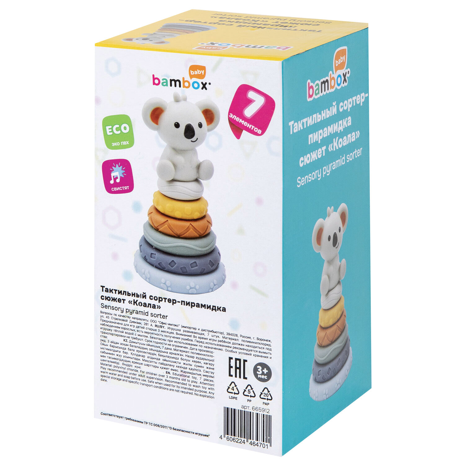 Тактильная игрушка-сортер, пирамидка "Коала", 7 элементов, сенсорная развивающая, ЭКО, BAMBOX BABY (БАМБОКС БЭБИ), 665912 Код товара: 665912 398,52 ₽ Купить Производитель:BAMBOX Тактильная игрушка-сортер (пирамидка "Коала") BAMBOX BABY в пастельных оттенках – замечательный подарок для малыша! Пирамидка выполнена из безопасного ПВХ, все детали приятные на ощупь. Пирамидка Коала – это сочетание увлекательной игры и развития! Игра с пирамидкой-сортером способствует развитию мелкой моторики, координации движений, пространственного мышления, снимает психологическое напряжение и дарит новые эмоции! Размер составляющих пирамидки позволяет малышу удобно держать их в маленькой ручке и соединять детали между собой. Каждое кольцо пирамидки отличается друг от друга размером, цветом и рельефной поверхностью. С такой пирамидкой ребёнок точно научится различать цвета и сравнивать размеры. Все детали пирамидки отлично подходят для игр на суше и в в воде. Ребёнок будет играть, собирать пирамидку и купаться, познавая окружающий мир с удовольствием! Пирамидка состоит из 7 элементов: • Размер фигурки "Коалы" – 8,1х4,1х7,7 см • Диаметр самого большого кольца пирамидки – 9,3 см. • Диаметр самого маленького кольца пирамидки – 4,5 см.Производство: КитайВид игрушки: пирамидкаКоличество в комплекте: 7 шт.Возраст ребенка: от 3 месЦвет: разноцветныйОсобенности : сортерСюжет: коалаСерия: тактильная развивающая игрушкаМатериал: ПВХ, эко-материалДлина: 12.5 смШирина: 10.6 смГлубина: 10.6 смУпаковка: подарочная коробкаВес: 331 грРазмер упаковки: 11 × 20.5 × 11 смОбъём: 0.0029 м3Промежуточная упаковка: 12 штТранспортная упаковка: 12 штШтрих-код: 4606224464701 Файлы Сертификат-1.jpg Сертификат-2.jpg Сертификат-3.jpg Сертификат-4.jpg