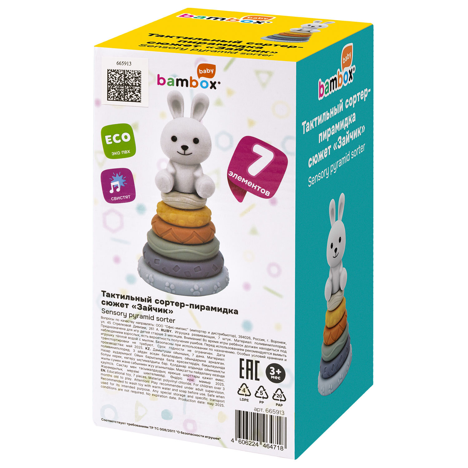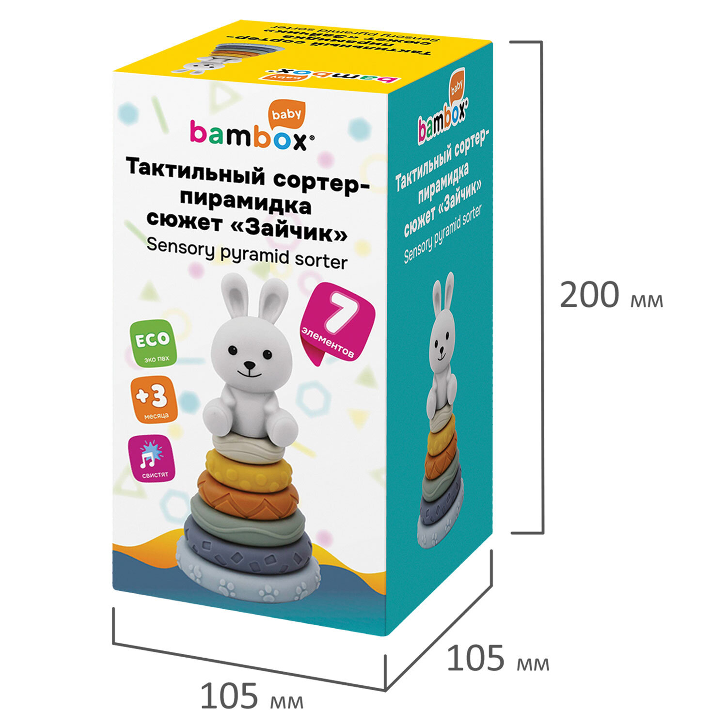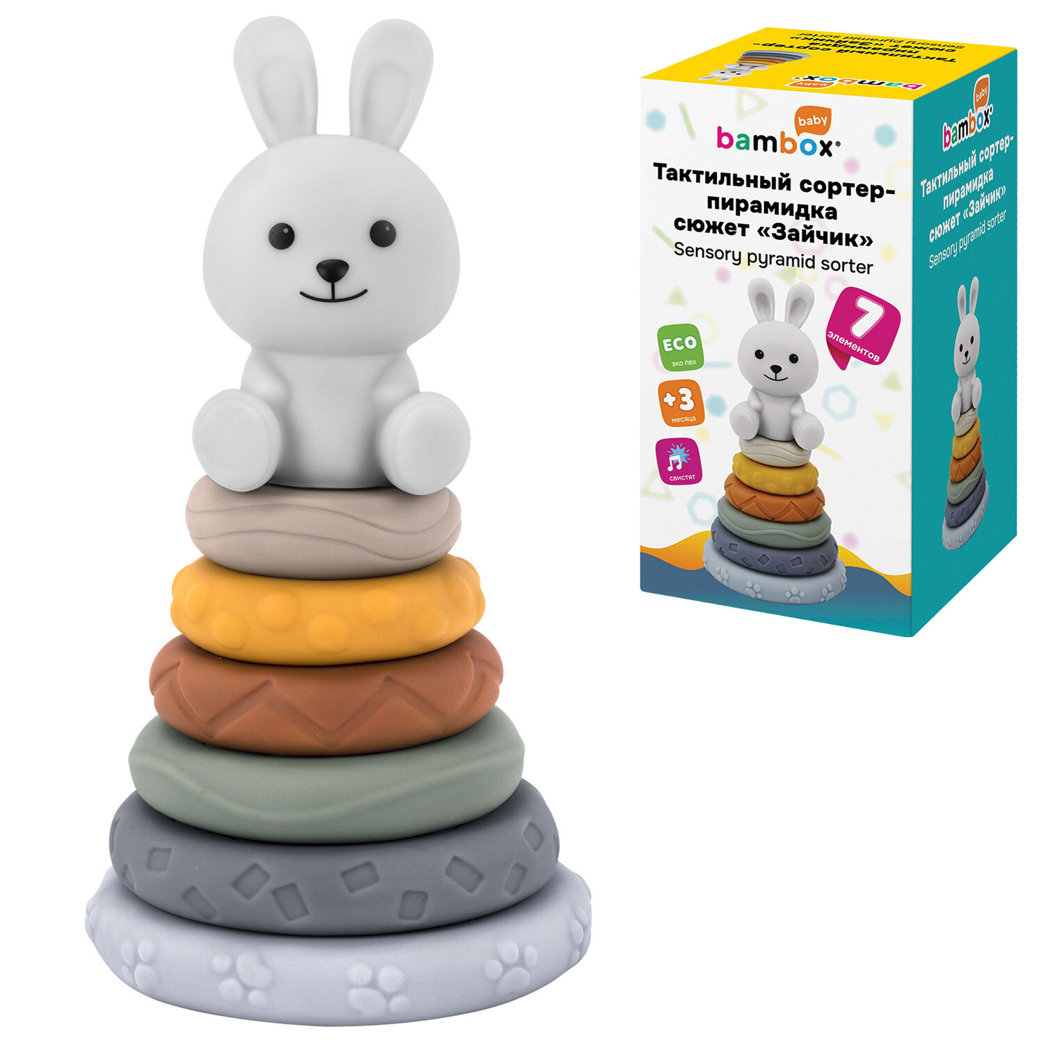 Тактильная игрушка-сортер, пирамидка "Зайчик", 7 элементов, сенсорная развивающая, ЭКО, BAMBOX BABY (БАМБОКС БЭБИ), 665913 Код товара: 665913 414,17 ₽ Купить Производитель:BAMBOX Тактильная игрушка-сортер (пирамидка "Зайчик") BAMBOX BABY в пастельных оттенках – замечательный подарок для малыша! Пирамидка выполнена из безопасного ПВХ, все детали приятные на ощупь. Пирамидка "Зайчик" – это сочетание увлекательной игры и развития! Игра с пирамидкой-сортером способствует развитию мелкой моторики, координации движений, пространственного мышления, снимает психологическое напряжение и дарит новые эмоции! Размер составляющих пирамидки позволяет малышу удобно держать их в маленькой ручке и соединять детали между собой. Каждое кольцо пирамидки отличается друг от друга размером, цветом и рельефной поверхностью. С такой пирамидкой ребёнок точно научится различать цвета и сравнивать размеры. Все детали пирамидки отлично подходят для игр на суше и в в воде. Ребёнок будет играть, собирать пирамидку и купаться, познавая окружающий мир с удовольствием! Пирамидка состоит из 7 элементов. • Размер фигурки "Зайчика" – 8,5х4,6х8,0 см • Диаметр самого большого кольца пирамидки – 10 см. • Диаметр самого маленького кольца пирамидки – 4,5 см.Производство: КитайВид игрушки: пирамидкаКоличество в комплекте: 7 шт.Возраст ребенка: от 3 месЦвет: разноцветныйОсобенности : сортерСюжет: зайчикСерия: тактильная развивающая игрушкаМатериал: ПВХ, эко-материалДлина: 20 смШирина: 10.5 смГлубина: 10.5 смУпаковка: подарочная коробкаВес: 331 грРазмер упаковки: 10.9 × 20.2 × 10.9 смОбъём: 0.0029 м3Промежуточная упаковка: 12 штТранспортная упаковка: 12 штШтрих-код: 4606224464718 Файлы Сертификат-1.jpg Сертификат-2.jpg Сертификат-3.jpg Сертификат-4.jpg