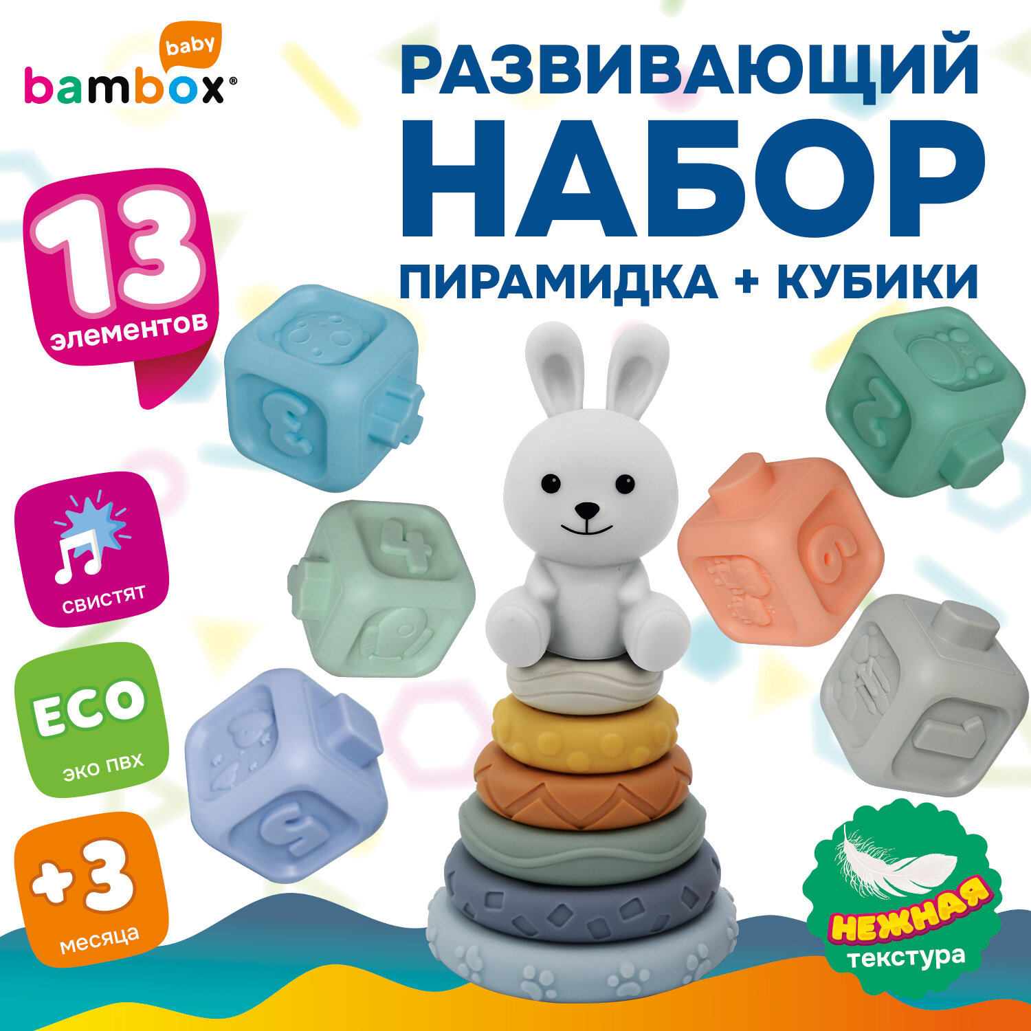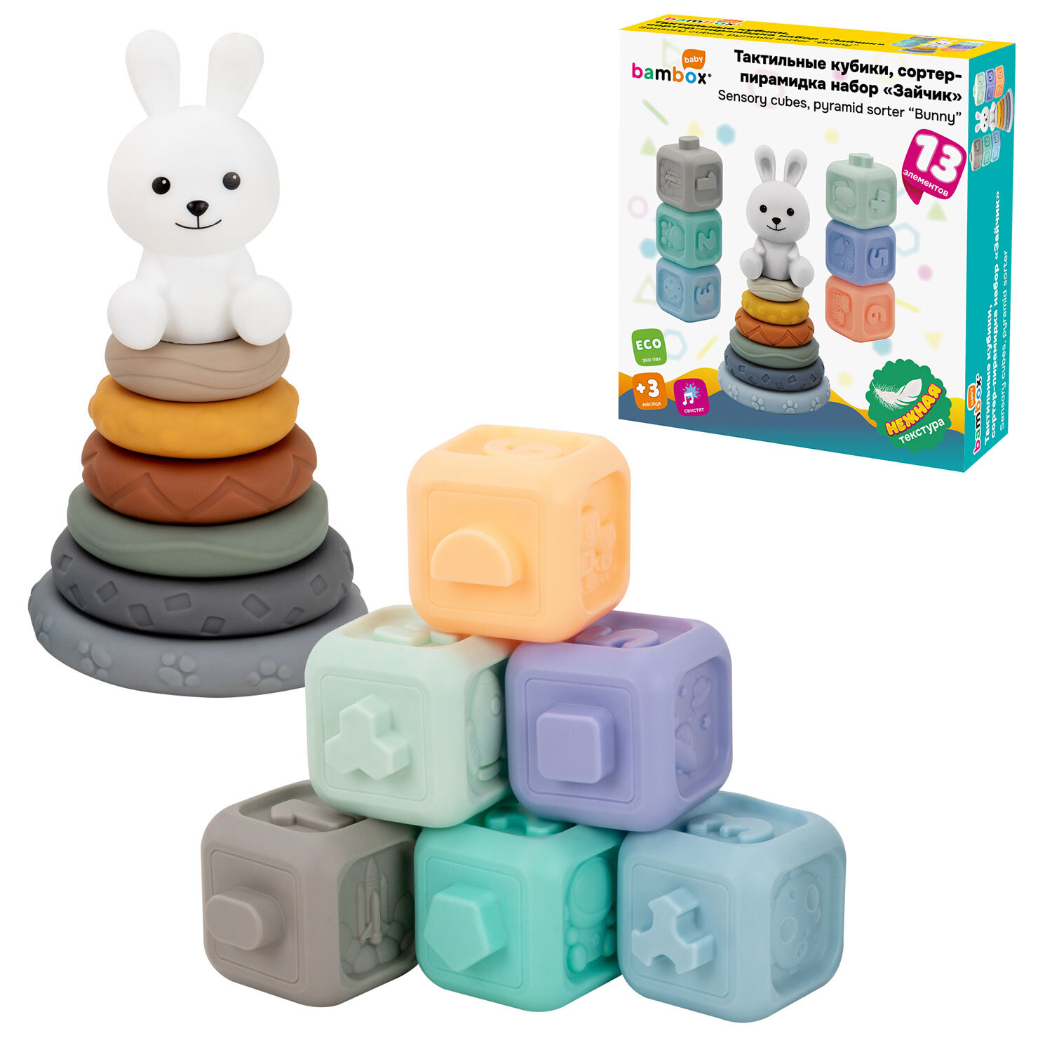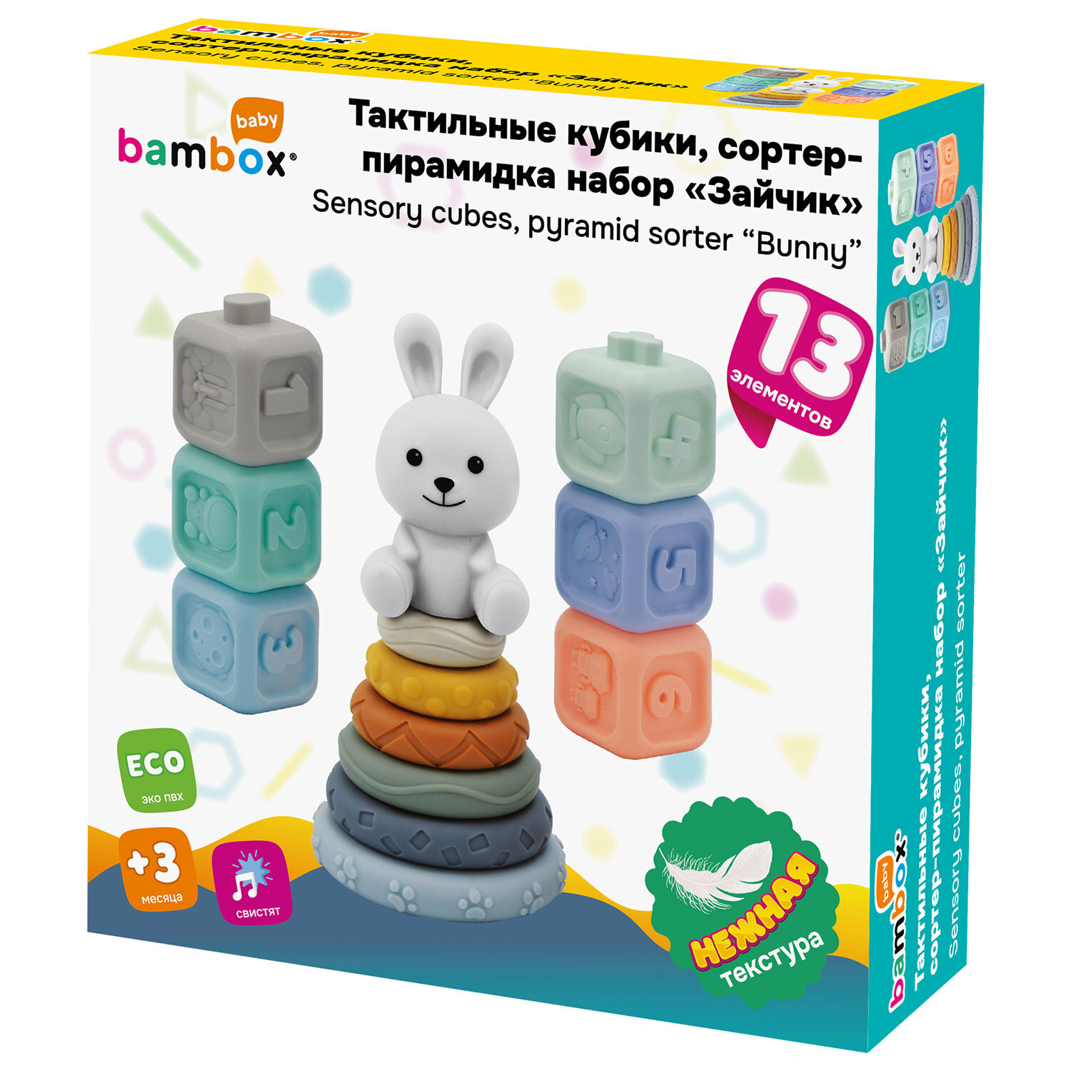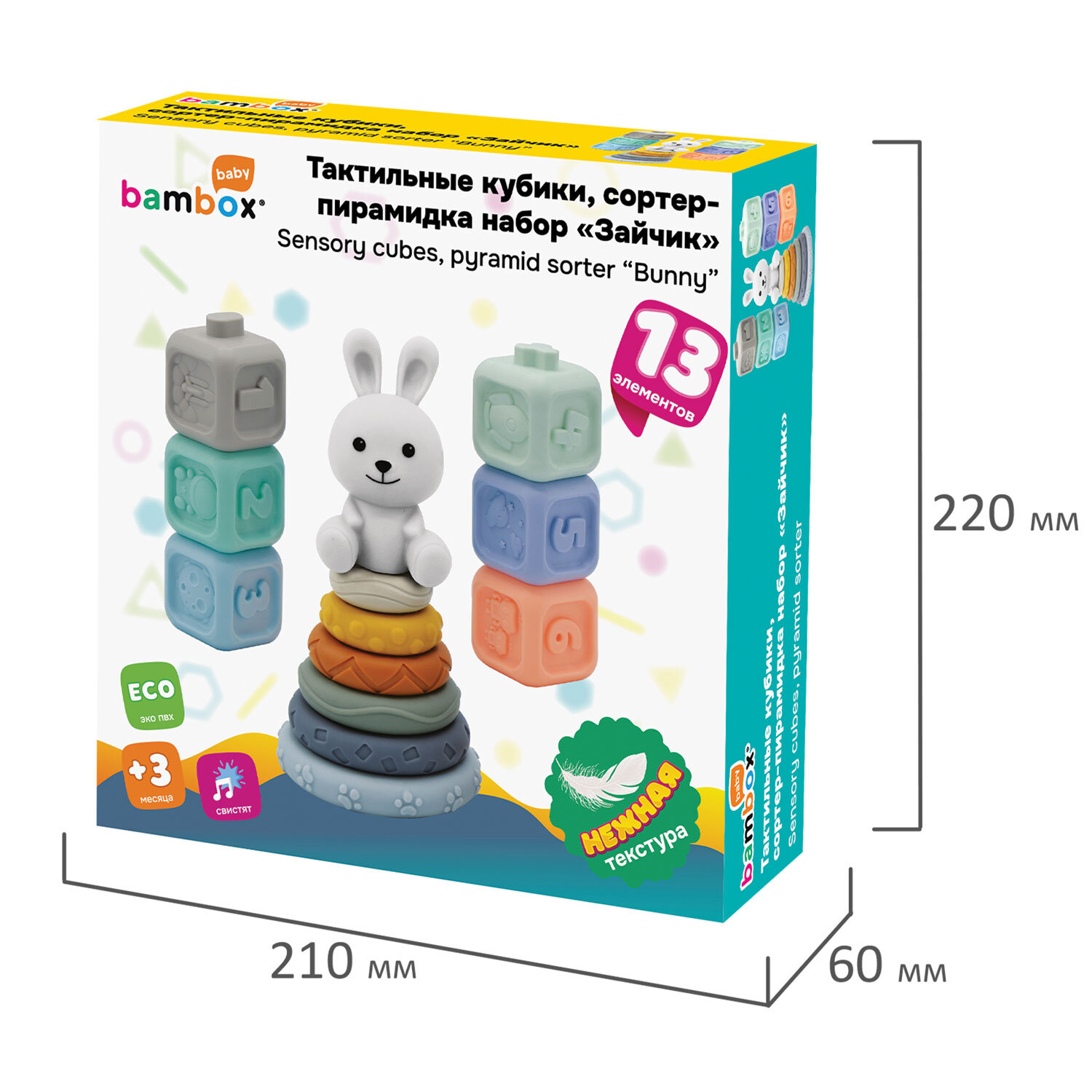 Набор тактильных игрушек сортеров развивающих пирамидка Зайчик, кубики 13 эл ЭКО, BAMBOX BABY (БАМБОКС БЭБИ), 665914 Код товара: 665914 859,37 ₽ Купить Производитель:BAMBOX Тактильный набор из игрушки пирамидки - сортера Зайчика и кубиков с функцией сортера BAMBOX BABY в пастельных оттенках – замечательный подарок для малыша! Все детали набора выполнены из безопасного ПВХ, все детали приятные на ощупь. Пирамидка Зайчик - это сочетание увлекательной игры и развития! Игра с пирамидкой - сортером и кубиками способствует развитию мелкой моторики, координации движений, пространственного мышления, снимает психологическое напряжение и дарит новые эмоции! Размер составляющих пирамидки и кубиков позволяет малышу удобно держать их в маленькой ручке и соединять детали между собой. Каждое кольцо пирамидки отличается друг от друга размером, цветом и рельефной поверхностью. Кубики легко соединяются между собой по принципу сортера — малыш сможет собирать башню, домики, пирамидки. С таким набором ребёнок точно научится различать цвета и считать. Все детали набора отлично подходят для игр на суше и в в воде. Ребёнок будет играть, познавая окружающий мир с удовольствием! В наборе: - 6 развивающих тактильных кубиков с объемными и рельефными обучающими гранями ярких оттенков с функцией сортера. Размер кубика 5,2*5,2*6,0 см. - Пирамидка состоит из 7 элементов. Размер фигурки Зайчика 8,5*4,6*8,0 см Диаметр самого большого кольца пирамидки 9,3 см. Диаметр самого маленького кольца пирамидки 4,5 см.Производство: КитайВид игрушки: пирамидка, кубикиКоличество в комплекте: 13 шт.Возраст ребенка: от 3 месЦвет: разноцветныйОсобенности : сенсорные, сортерСюжет: тактильныеСерия: тактильные развивающие игрушкиМатериал: ПВХДлина: 22 смШирина: 21 смГлубина: 6 смУпаковка: подарочная коробкаВес: 500 грРазмер упаковки: 5.8 × 16 × 23 смОбъём: 0.0028 м3Промежуточная упаковка: 6 штТранспортная упаковка: 6 штШтрих-код: 4606224464725 Сертификат-1.jpg Сертификат-2.jpg