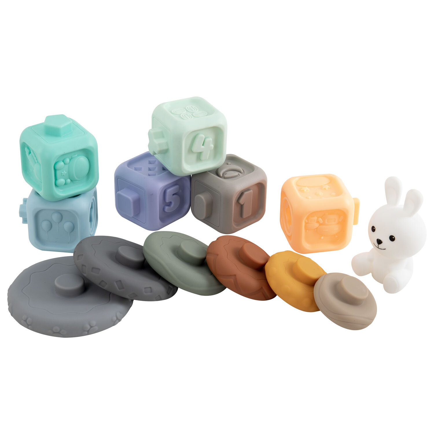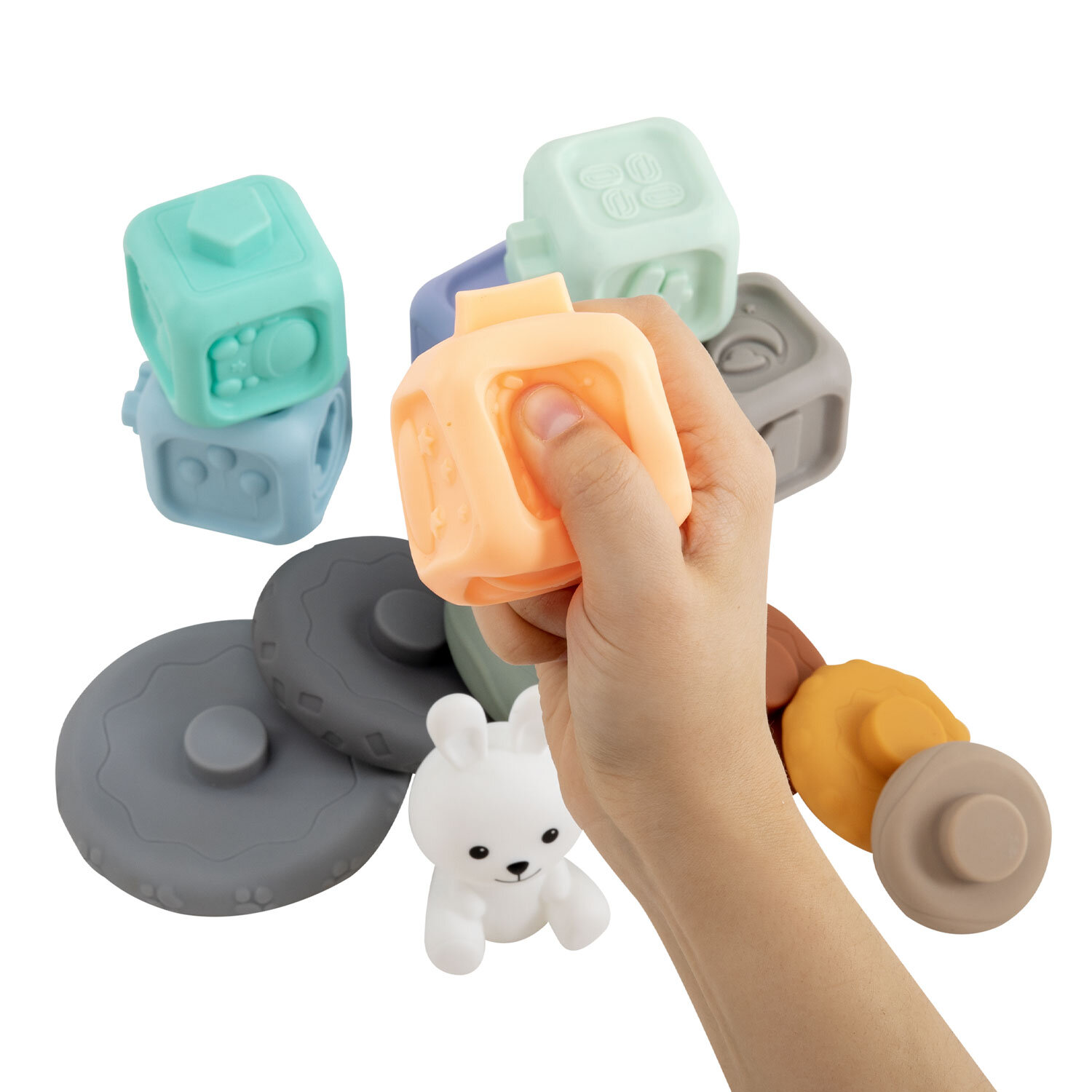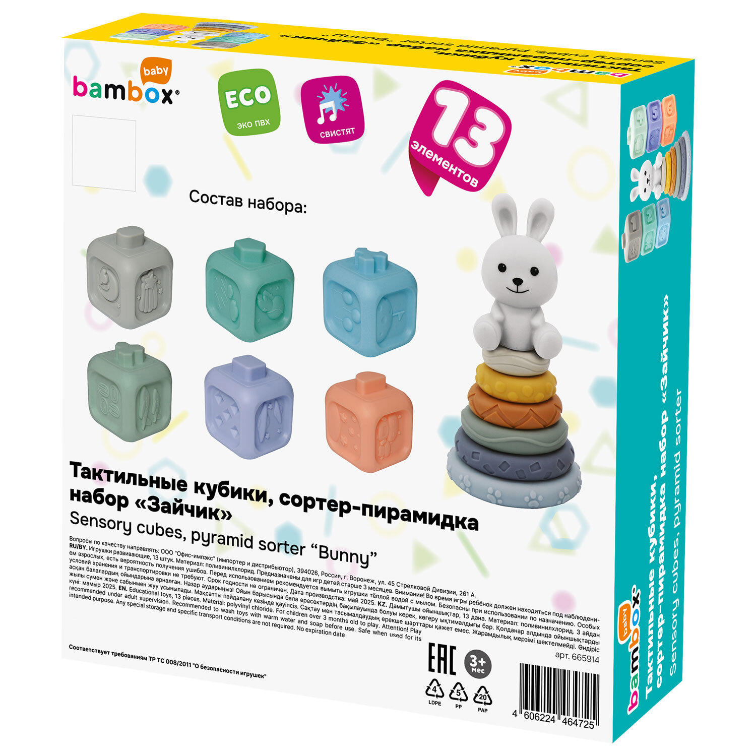 Набор тактильных игрушек сортеров развивающих пирамидка Зайчик, кубики 13 эл ЭКО, BAMBOX BABY (БАМБОКС БЭБИ), 665914 Код товара: 665914 859,37 ₽ Купить Производитель:BAMBOX Тактильный набор из игрушки пирамидки - сортера Зайчика и кубиков с функцией сортера BAMBOX BABY в пастельных оттенках – замечательный подарок для малыша! Все детали набора выполнены из безопасного ПВХ, все детали приятные на ощупь. Пирамидка Зайчик - это сочетание увлекательной игры и развития! Игра с пирамидкой - сортером и кубиками способствует развитию мелкой моторики, координации движений, пространственного мышления, снимает психологическое напряжение и дарит новые эмоции! Размер составляющих пирамидки и кубиков позволяет малышу удобно держать их в маленькой ручке и соединять детали между собой. Каждое кольцо пирамидки отличается друг от друга размером, цветом и рельефной поверхностью. Кубики легко соединяются между собой по принципу сортера — малыш сможет собирать башню, домики, пирамидки. С таким набором ребёнок точно научится различать цвета и считать. Все детали набора отлично подходят для игр на суше и в в воде. Ребёнок будет играть, познавая окружающий мир с удовольствием! В наборе: - 6 развивающих тактильных кубиков с объемными и рельефными обучающими гранями ярких оттенков с функцией сортера. Размер кубика 5,2*5,2*6,0 см. - Пирамидка состоит из 7 элементов. Размер фигурки Зайчика 8,5*4,6*8,0 см Диаметр самого большого кольца пирамидки 9,3 см. Диаметр самого маленького кольца пирамидки 4,5 см.Производство: КитайВид игрушки: пирамидка, кубикиКоличество в комплекте: 13 шт.Возраст ребенка: от 3 месЦвет: разноцветныйОсобенности : сенсорные, сортерСюжет: тактильныеСерия: тактильные развивающие игрушкиМатериал: ПВХДлина: 22 смШирина: 21 смГлубина: 6 смУпаковка: подарочная коробкаВес: 500 грРазмер упаковки: 5.8 × 16 × 23 смОбъём: 0.0028 м3Промежуточная упаковка: 6 штТранспортная упаковка: 6 штШтрих-код: 4606224464725 Сертификат-1.jpg Сертификат-2.jpg