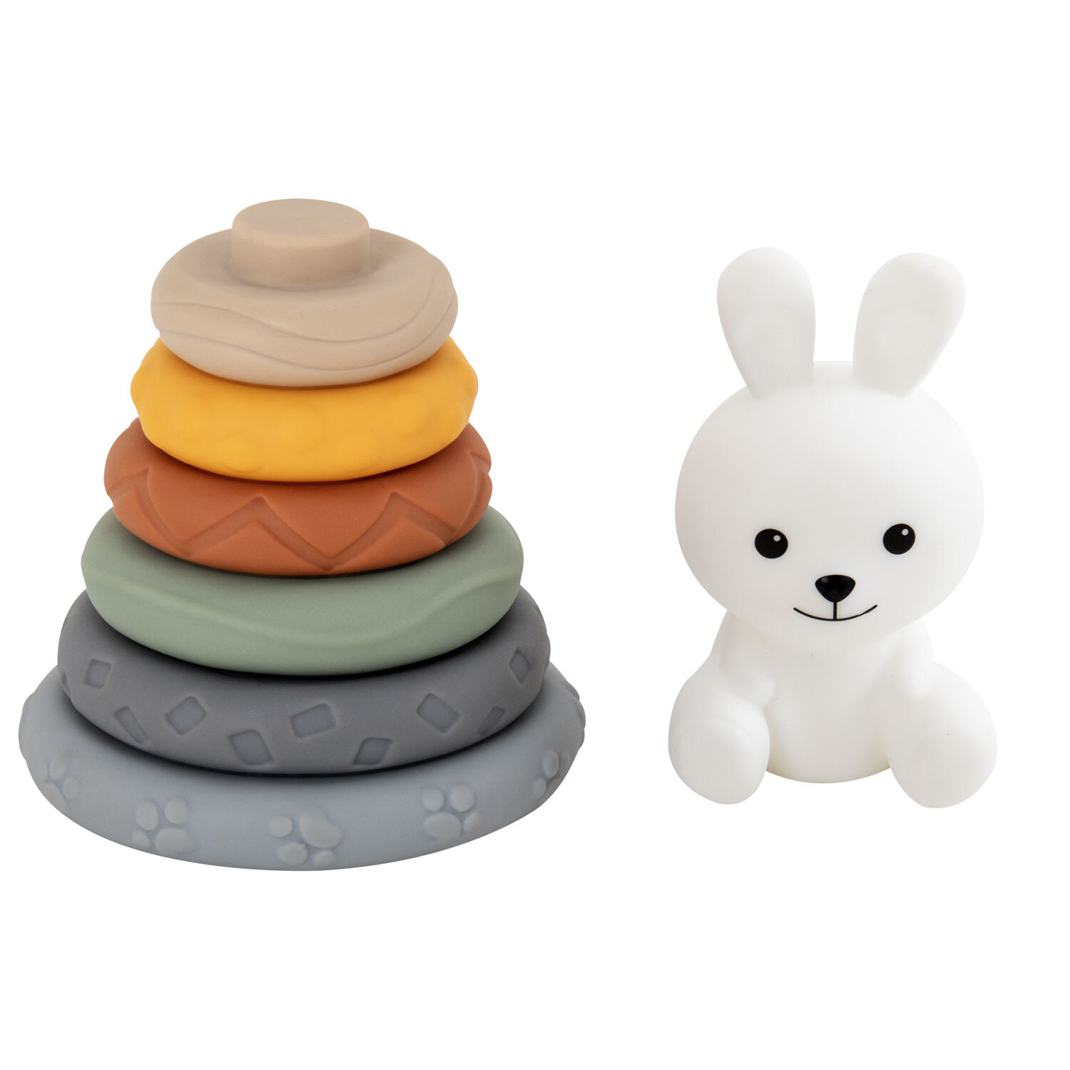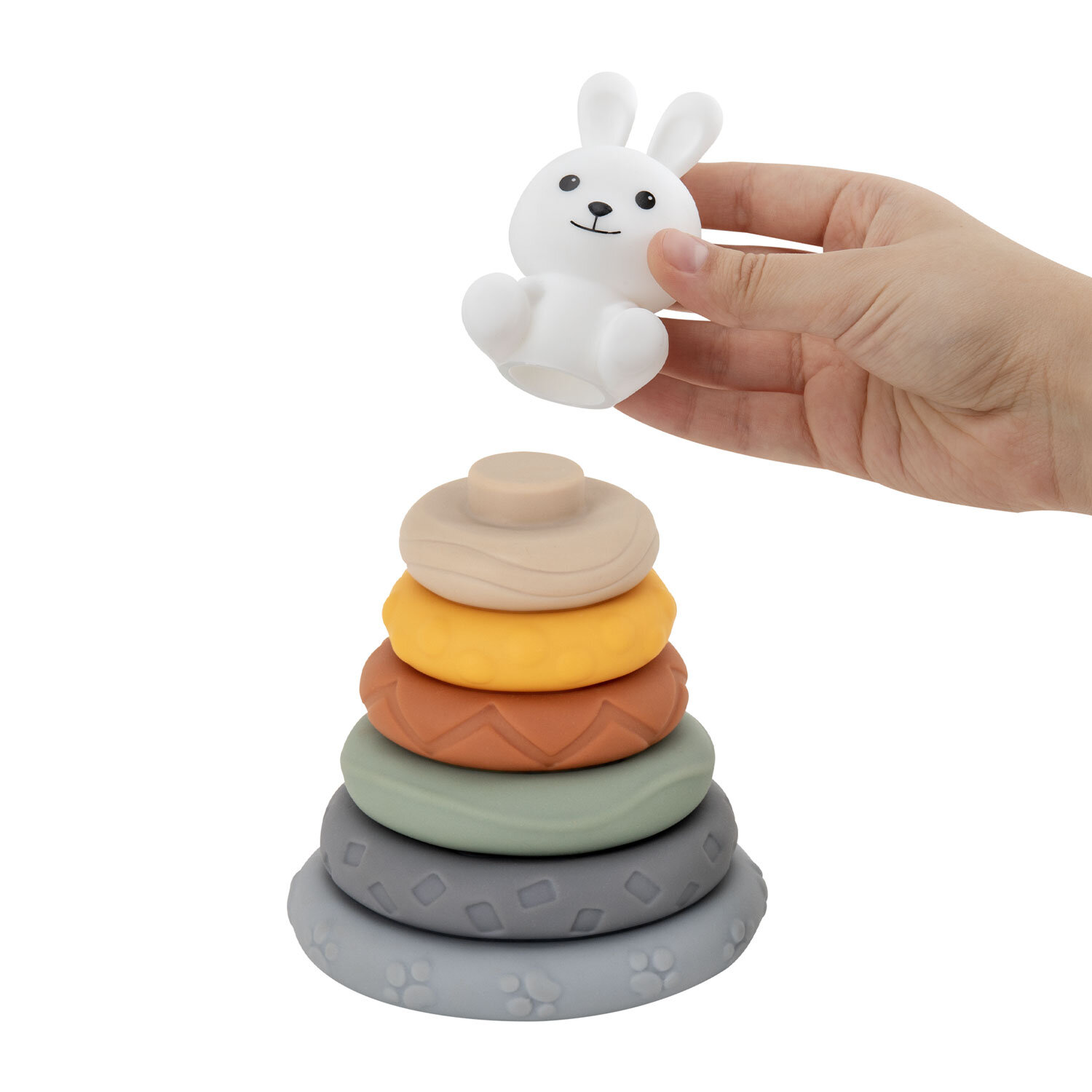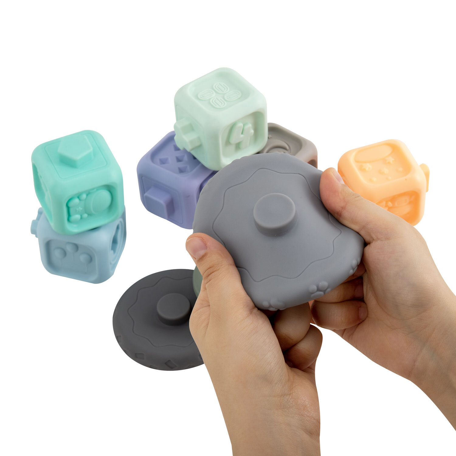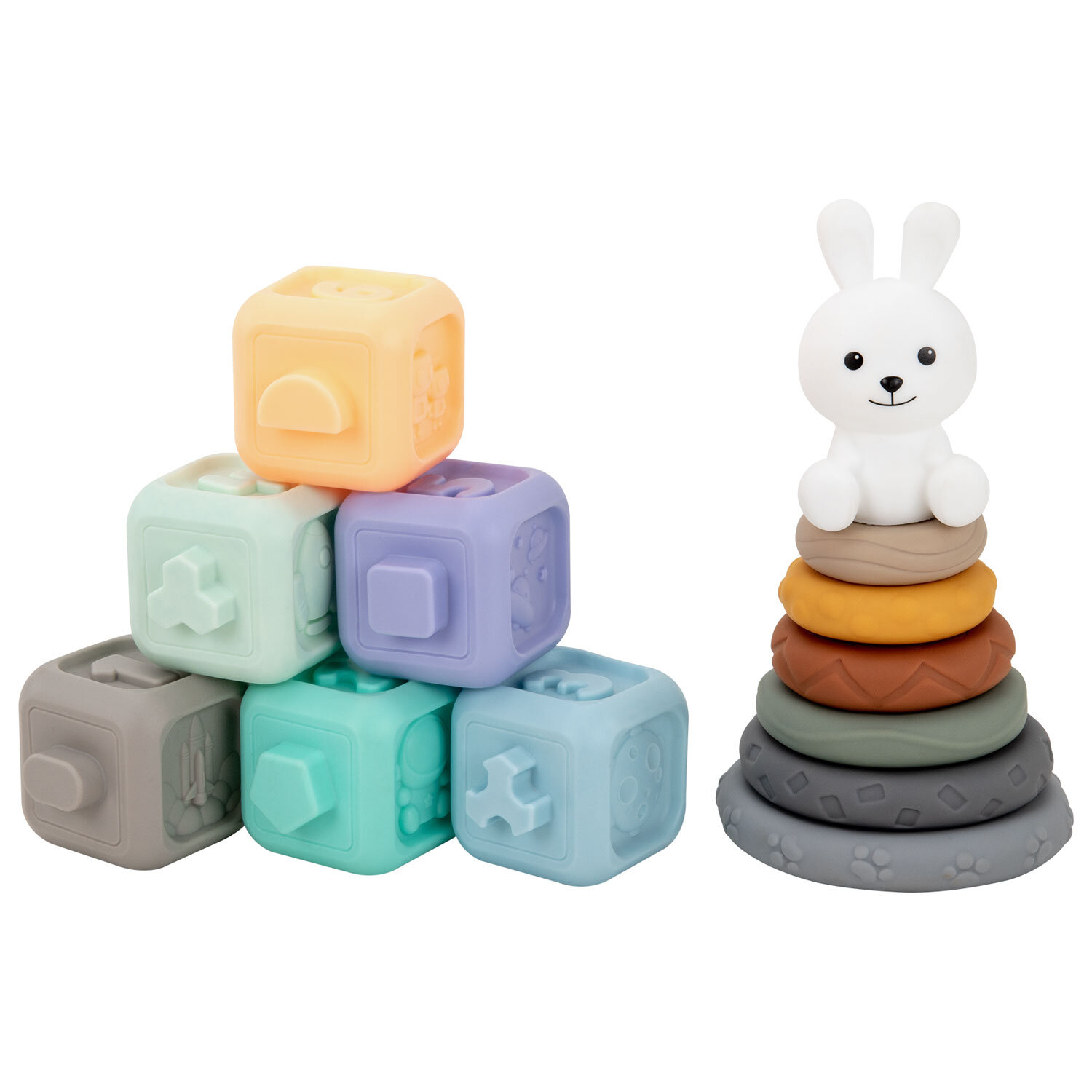 Набор тактильных игрушек сортеров развивающих пирамидка Зайчик, кубики 13 эл ЭКО, BAMBOX BABY (БАМБОКС БЭБИ), 665914 Код товара: 665914 859,37 ₽ Купить Производитель:BAMBOX Тактильный набор из игрушки пирамидки - сортера Зайчика и кубиков с функцией сортера BAMBOX BABY в пастельных оттенках – замечательный подарок для малыша! Все детали набора выполнены из безопасного ПВХ, все детали приятные на ощупь. Пирамидка Зайчик - это сочетание увлекательной игры и развития! Игра с пирамидкой - сортером и кубиками способствует развитию мелкой моторики, координации движений, пространственного мышления, снимает психологическое напряжение и дарит новые эмоции! Размер составляющих пирамидки и кубиков позволяет малышу удобно держать их в маленькой ручке и соединять детали между собой. Каждое кольцо пирамидки отличается друг от друга размером, цветом и рельефной поверхностью. Кубики легко соединяются между собой по принципу сортера — малыш сможет собирать башню, домики, пирамидки. С таким набором ребёнок точно научится различать цвета и считать. Все детали набора отлично подходят для игр на суше и в в воде. Ребёнок будет играть, познавая окружающий мир с удовольствием! В наборе: - 6 развивающих тактильных кубиков с объемными и рельефными обучающими гранями ярких оттенков с функцией сортера. Размер кубика 5,2*5,2*6,0 см. - Пирамидка состоит из 7 элементов. Размер фигурки Зайчика 8,5*4,6*8,0 см Диаметр самого большого кольца пирамидки 9,3 см. Диаметр самого маленького кольца пирамидки 4,5 см.Производство: КитайВид игрушки: пирамидка, кубикиКоличество в комплекте: 13 шт.Возраст ребенка: от 3 месЦвет: разноцветныйОсобенности : сенсорные, сортерСюжет: тактильныеСерия: тактильные развивающие игрушкиМатериал: ПВХДлина: 22 смШирина: 21 смГлубина: 6 смУпаковка: подарочная коробкаВес: 500 грРазмер упаковки: 5.8 × 16 × 23 смОбъём: 0.0028 м3Промежуточная упаковка: 6 штТранспортная упаковка: 6 штШтрих-код: 4606224464725 Сертификат-1.jpg Сертификат-2.jpg