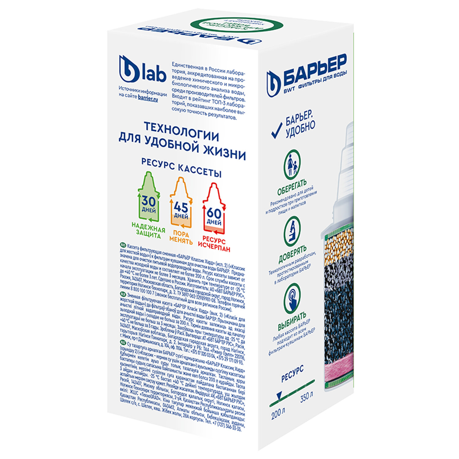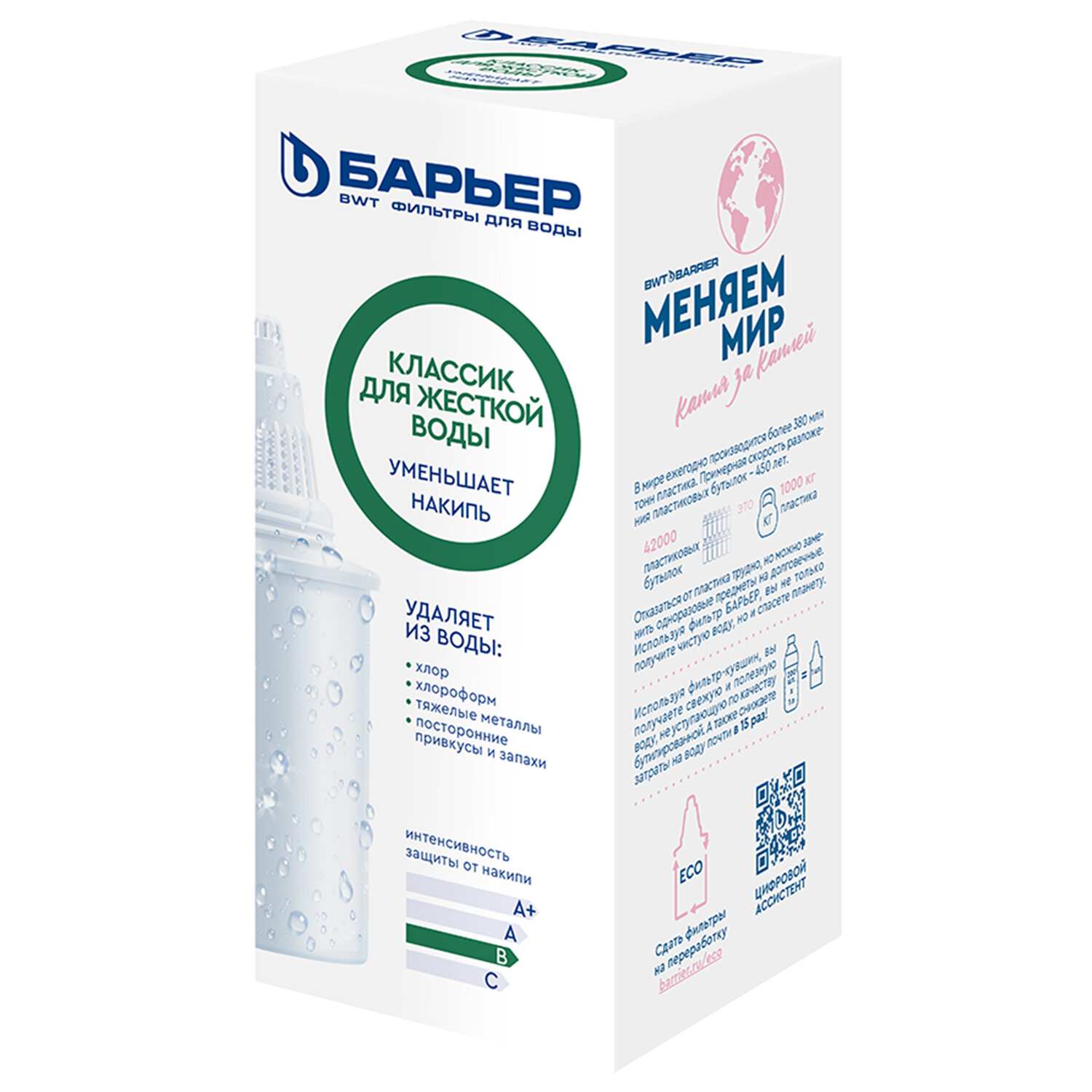 Сменная кассета БАРЬЕР "Классик для жесткой воды", для жесткой воды, ресурс 200 литров Код товара: 702814 291,2 ₽ Купить Производитель:БАРЬЕР Сменная кассета БАРЬЕР "Классик для жёсткой воды" – это умное решение для городских квартир, где водопроводная вода оставляет белый налёт на чайнике, снижает эффективность бытовой техники и придаёт напиткам неприятный привкус! Эта кассета не только обеспечивает базовую очистку, но и мягко умягчает воду, снижая содержание солей кальция и магния – главных причин образования накипи. В основе – специальная смесь ионообменных смол, которая одновременно уменьшает жёсткость, удаляет растворённое железо и защищает от тяжёлых металлов. Дополнительно, кокосовый активированный уголь, обработанный серебром, эффективно устраняет хлор, хлороформ, посторонние запахи и привкусы, а также подавляет рост бактерий внутри фильтра. Благодаря герметичному резьбовому соединению вы можете быть уверены: неочищенная вода никогда не попадёт в ваш стакан. Ресурс кассеты – до 200 литров (примерно 45 дней для средней семьи), что делает её практичной и экономичной. Как и все кассеты БАРЬЕР, она универсальна: подходит ко всем фильтрам-кувшинам бренда без исключений. Предприятие-изготовитель оставляет за собой право вносить изменения в конструкцию, не влияющие на правила и условия эксплуатации, без отражения в документации. Представленные ниже характеристики носят справочный характер.Производство: РоссияТип модуля: кассетаСерия: Классик для жесткой водыТип воды: жесткийСпециализация: умягчение и очистка водыСредний ресурс кассеты: 200 лКоличество в комплекте: 1 шт.Производительность: 0.3 л/минСрок годности: 36 месВес: 178 грРазмер упаковки: 6.5 × 14.5 × 6.5 смОбъём: 0.0007 м3Промежуточная упаковка: 12 штТранспортная упаковка: 12 штШтрих-код: 4601032993696 Файлы Сертификат-1.jpg Сертификат-2.jpg Сертификат-3.jpg Сертификат-4.jpg Сертификат-5.jpg