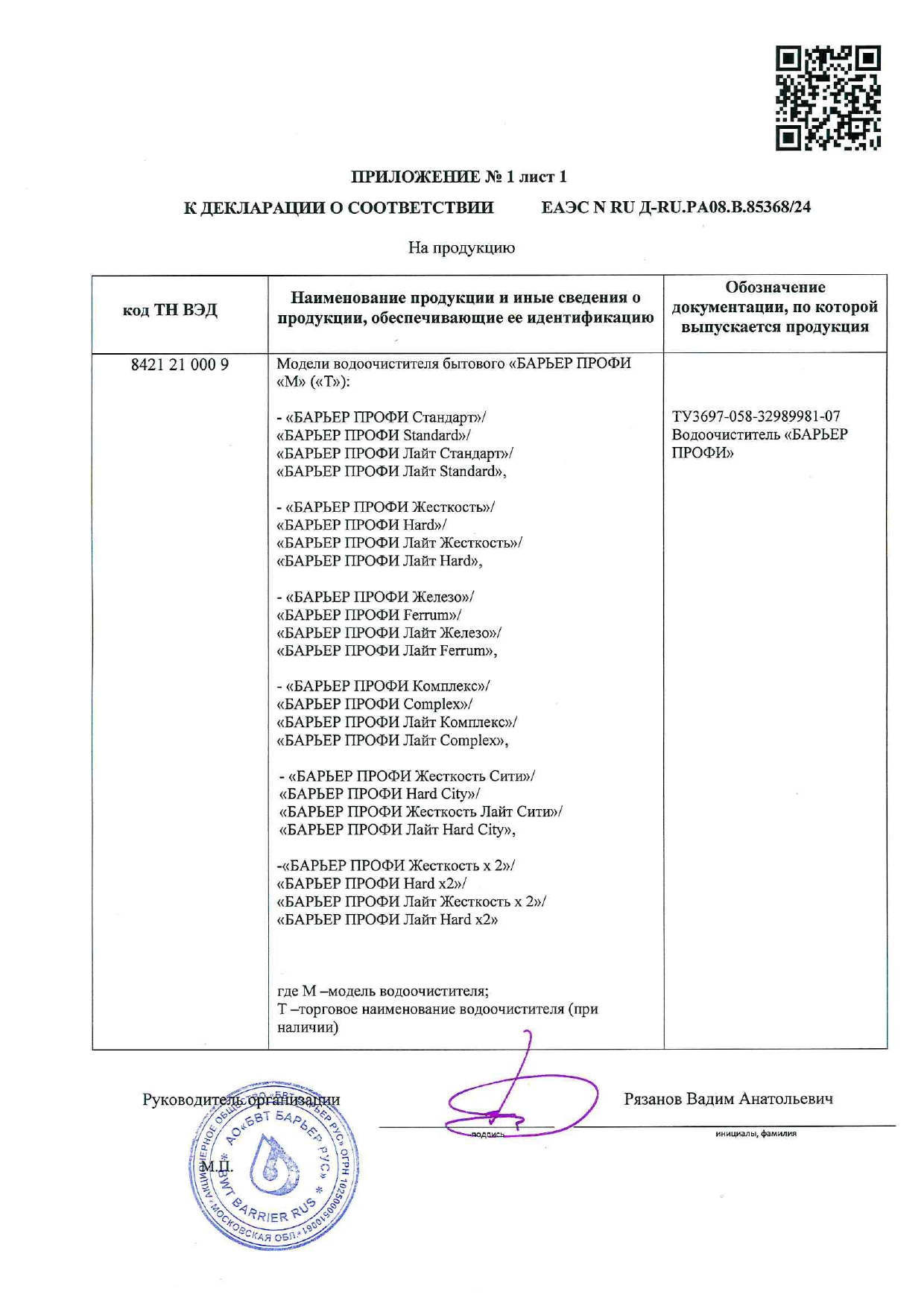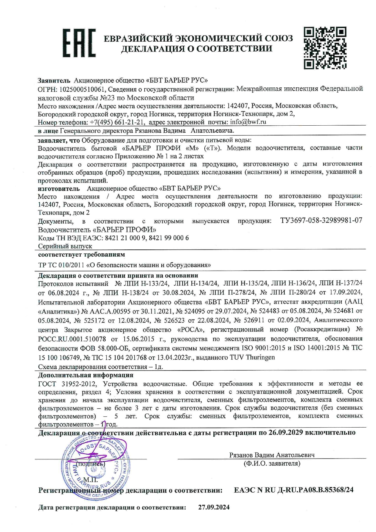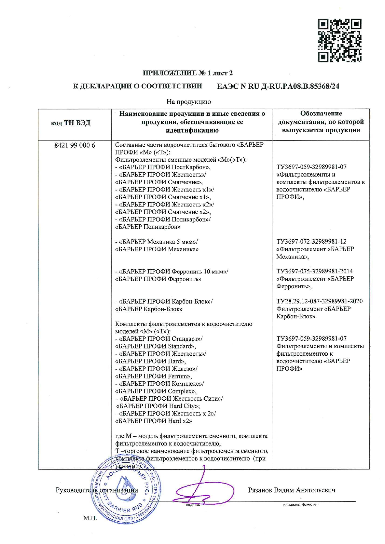 Картриджи сменные БАРЬЕР "ПРОФИ Жесткость", 3 ступени, ресурс 10000 л, КОМПЛЕКТ 3 шт. Код товара: 702835 2 024,96 ₽ Купить Производитель:БАРЬЕР Комплект сменных картриджей "БАРЬЕР ПРОФИ Жесткость" – это продуманное решение для домов с жёсткой водой, где белый известковый налёт в чайниках, снижение срока службы бытовой техники и мыльный привкус воды становятся повседневной проблемой. Сменные картриджи для проточного фильтра БАРЬЕР стандарта Slim Line 10 (SL10) подходят к любой проточной системе БАРЬЕР "ПРОФИ". Комплект сменных картриджей БАРЬЕР "ПРОФИ Жесткость" позволяет забыть о накипи и получить вкусную безопасную воду. Производительность – 2 л/мин, ресурс – 10000 литров. Вода проходит три этапа очистки: 1 ступень – картридж "Механика" для фильтра БАРЬЕР "ПРОФИ". Удаляет любые механические примеси более 5 мкм – песок, пластик, ржавчину и др. 2 ступень – картридж "Смягчение" для фильтра БАРЬЕР "ПРОФИ". Снижает карбонатную жесткость, из-за которой образуется накипь в чайнике. Ресурс – до 6 месяцев, однако картридж может быть подвергнут регенерации в домашних условиях с помощью простой поваренной НЕйодированной соли (не более 8 раз). 3 ступень – картридж "ПостКарбон" для фильтра БАРЬЕР "ПРОФИ". Осуществляет финишную очистку и кондиционирование, устраняет хлор, тяжелые металлы и неприятные привкусы. Для замены и установки сменного картриджа потребуется ключ из комплекта фильтра для воды БАРЬЕР "ПРОФИ". Предприятие-изготовитель оставляет за собой право вносить изменения в конструкцию, не влияющие на правила и условия эксплуатации, без отражения в документации. Представленные ниже характеристики носят справочный характер.Производство: РоссияТип модуля: картриджСерия: ПРОФИТип воды: жесткийСпециализация: умягчение и очистка водыСредний ресурс кассеты: 10000 лКоличество в комплекте: 3 шт.Производительность: 2 л/минСрок годности: 36 месВес: 1,35 кгРазмер упаковки: 7.6 × 26.4 × 22.4 смОбъём: 0.0054 м3Промежуточная упаковка: 6 штТранспортная упаковка: 6 штШтрих-код: 4601032932060 Файлы Приложение-1.pdf Сертификат-1.jpg Сертификат-2.jpg Сертификат-3.jpg Сертификат-4.jpg Сертификат-5.jpg