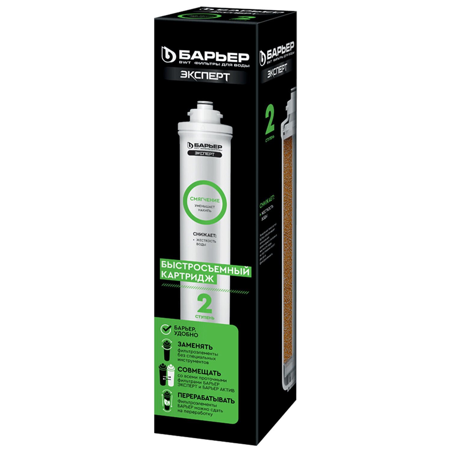 Картридж сменный БАРЬЕР "ЭКСПЕРТ Смягчение", 2 ступень, ресурс 500 л Код товара: 702843 1 120,48 ₽ Купить Производитель:БАРЬЕР Сменный картридж «БАРЬЕР ЭКСПЕРТ Смягчение» — это целевое решение для борьбы с жёсткой водой и её главным последствием — образованием накипи! Сменный картридж для проточного фильтра БАРЬЕР ЭКСПЕРТ. Предотвращает образование накипи: эффективно снижает карбонатную жесткость, из-за которой образуется осадок в чайнике. Рекомендованная частота замены картриджа — не реже 1 раза в 6 месяцев. Производительность — 2 л/мин. Сменный картридж БАРЬЕР ЭКСПЕРТ Смягчение подходит к фильтрам линеек БАРЬЕР ЭКСПЕРТ, БАРЬЕР ЭКСПЕРТ СЛИМ, БАРЬЕР Актив, БАРЬЕР ОНИКС. Заменяется удобно, одним движением, без специальных ключей, инструментов и навыков. Картридж БАРЬЕР ЭКСПЕРТ Смягчение используется в качестве второй ступени фильтрах БАРЬЕР ЭКСПЕРТ Жесткость, БАРЬЕР ЭКСПЕРТ Комплекс и БАРЬЕР ЭКСПЕРТ Смягчение БИО. Производитель оставляет за собой право без предварительного уведомления вносить изменения в технические характеристики, комплектацию и конструкцию, не ухудшающие эксплуатационные характеристики изделия.Производство: РоссияТип модуля: картриджСерия: ЭкспертТип воды: жесткий, средней жесткостиСпециализация: умягчение водыСредний ресурс кассеты: 500 лКоличество в комплекте: 1 шт.Производительность: 2 л/минСрок годности: 36 месВес: 896 грРазмер упаковки: 8.5 × 34 × 8.1 смОбъём: 0.0028 м3Промежуточная упаковка: 15 штТранспортная упаковка: 15 штШтрих-код: 4601032930493 Файлы Сертификат-1.jpg Сертификат-2.jpg Сертификат-3.jpg Сертификат-4.jpg