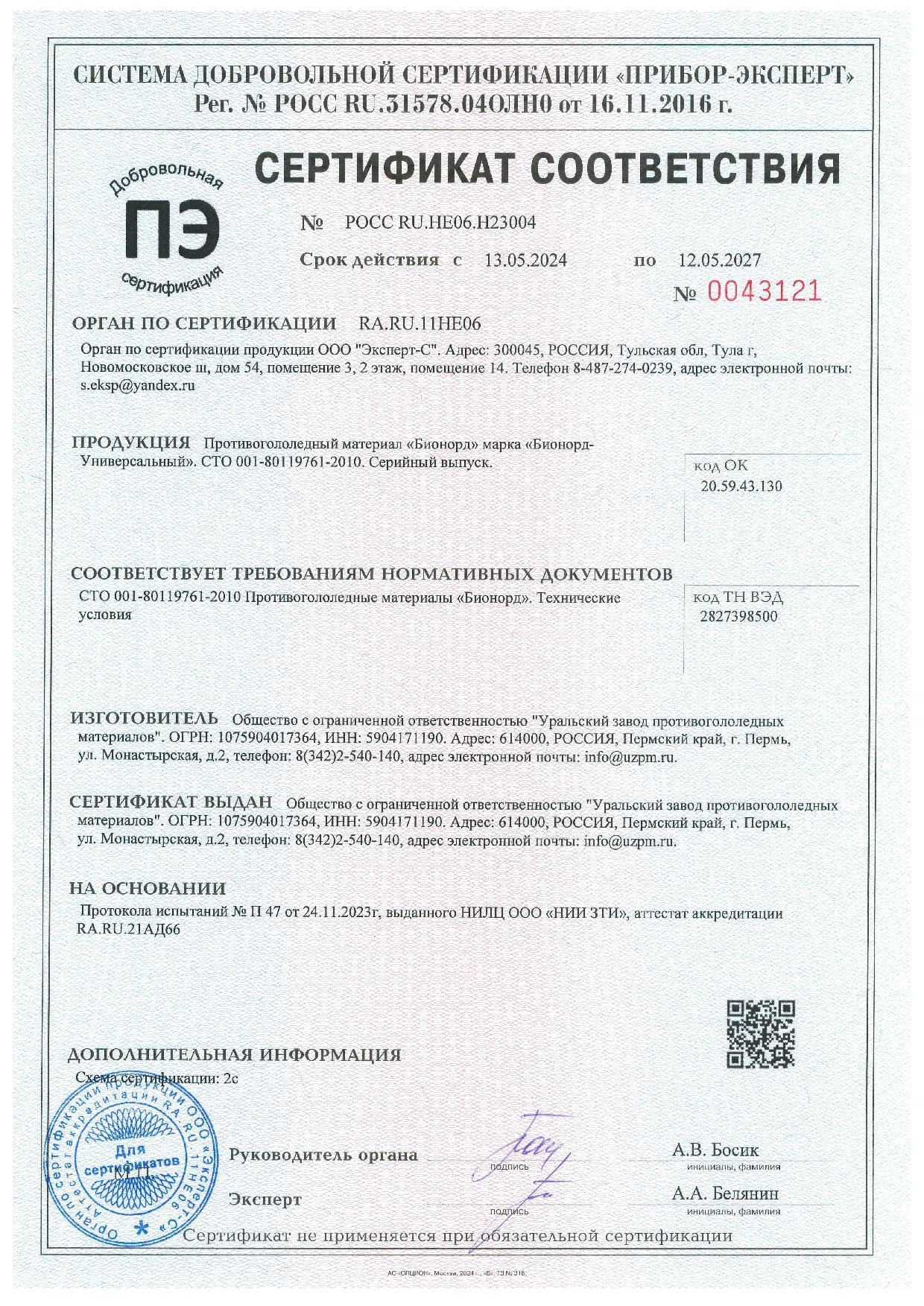Реагент антигололедный 23 кг BIONORD Green, до -25 °С, хлорид натрия и кальция, МИНПРОМТОРГ Код товара: 702568 2 416,05 ₽ Купить Производитель:BIONORD Специализированный противогололедный материал BIONORD Green наиболее эффективен для обработки пешеходных зон. За счёт введения в состав биофильной добавки оказывает минимальное воздействие на окружающую среду. Оптимальный выбор для использования на придомовых территориях, игровых площадках, пешеходных дорожках и в парковых зонах. Производится по передовой технологии "Единая гранула". Противогололедный материал отличается оперативным выведением из почвы и безопасностью для покрытий из плитки, камня, бетона. Экономичен: расходуется в 7 раз меньше, чем смесь песка и соли. Поставляется в мешках 23 кг. Состав: смесь хлоридов, биофильная добавка. Преимущества: • бережное отношение ко всем атрибутам человеческой жизни: одежде, обуви, коже, меху, а также лапам животных; • минимальное воздействие на окружающую среду; • ускоренное выведение из грунта, что снижает негативное влияние на почвы; • высокая скорость плавления льда – 20–40 минут с момента обработки; • экономичность использования – расход материала в 7 раз меньше, чем смеси песка и соли для обработки площади аналогичного размера; • широкий диапазон температурных границ применения – плавит лед до -25 °C; • полная растворимость – остатки средства полностью вымываются, не загрязняя ливневую канализацию; • абсолютно безопасно для плиточных, каменных, бетонных и асфальтобетонных покрытий (при соблюдении инструкции по применению). Производитель – ООО "Уральский завод противогололедных материалов". В случае крайне низких температур (ниже -25 °C) норма распределения может быть увеличена до 150 г/м2.Производство: РоссияТемпературный диапазон, °С : до -25Вид товара: гранулыВес: 23 кгРассчитан на площадь обработки до: 153 м2Мгновенного действия: даБезопасен для животных и растений: даСостав: биофильные добавки, хлористый кальций, хлористый натрийУпаковка: мешокТип товара: реагентСрок годности: 36 месРазмер упаковки: 12 × 57 × 37.5 смОбъём: 0.0257 м3Промежуточная упаковка: 1 штТранспортная упаковка: 1 штШтрих-код: 4670009940513 Файлы Приложение-1.pdf Сертификат-1.jpg Сертификат-2.jpg Сертификат-3.jpg