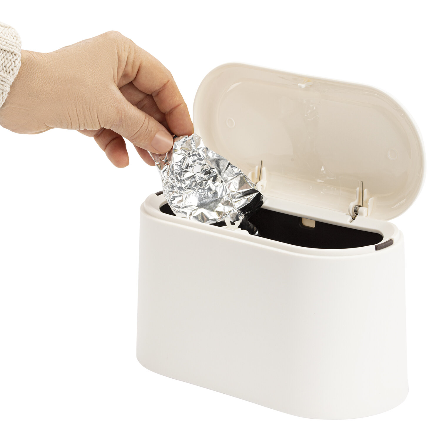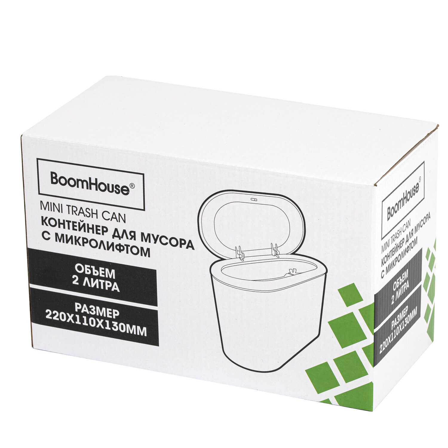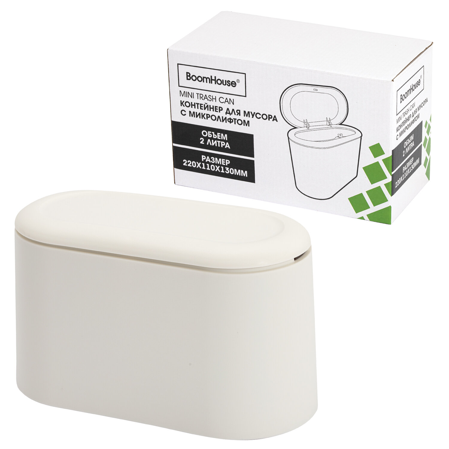 Контейнер, урна, ведерко для мусора с микролифтом НАСТОЛЬНОЕ 2 л, 220х110х130 мм, BOOMHOUSE (БУМХАУС) Код товара: 238898 477,28 ₽ Купить Производитель:BoomHouse Компактный и вместительный контейнер для мусора BOOMHOUSE идеально подходит для использования в офисах, школах, различных учреждениях. Изготовлен из высококачественного пластика. Оснащен крышкой с механизмом микролифта. Легкость и компактность контейнера позволяют перемещать его с одного места на другое. Небольшой контейнер легко помещается на рабочем столе. Имеет размеры 22х11 см и объем 2 л.Производство: КитайТип товара: урнаОбъем: 2 лКрышка: даСъемный внутренний контейнер: даМатериал: пластикСерия: StandardВысота: 13 смШирина: 11 смГлубина: 22 смЦвет: белый матовыйТип упаковки: гофрокоробВес: 376 грРазмер упаковки: 11.3 × 22.7 × 14.5 смОбъём: 0.0043 м3Промежуточная упаковка: 30 штТранспортная упаковка: 30 штШтрих-код: 4606224486703 Сертификат-1.jpg Сертификат-2.jpg