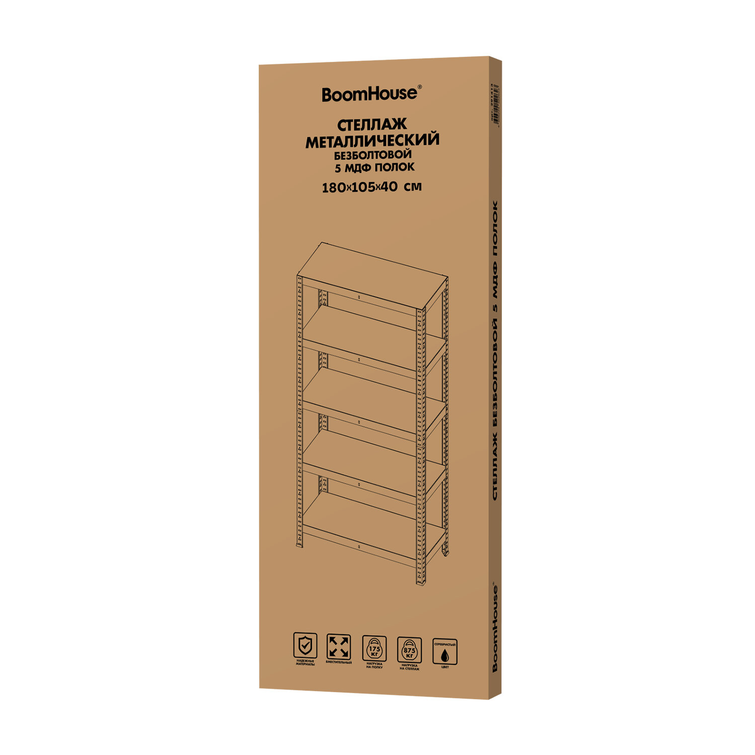 Стеллаж металлический BOOMHOUSE (БУМХАУС) безболтовой, в1800*ш1050*г400мм, 5 полок МДФ, серебристый Код товара: 291413 4 083 ₽ Купить Производитель:BoomHouse Металлический стеллаж BOOMHOUSE легкая сборка без болтов. Простой и экономичный способ организовать хранение вещей. Предназначены для хранения документов и различных грузов в офисе, на складе, в архиве. Стойка имеет разборную конструкцию, благодаря чему стеллаж поставляется в компактной упаковке. Максимальная нагрузка на полку при этом достигает 175 кг, на стеллаж - до 875 кг. Каркас выполнен из полированной оцинкованной стали, толщина которой 0,62 мм. Полки выполнены из влагостойкого МДФ без покрытия. Толщина полки 4 мм. Для повышения жесткости всей конструкции верхняя и нижняя полка усилена дополнительными Г-образными уголками. Шаг установки полок - 25 мм. Опоры пластиковые, нерегулируемые. Вся необходимая фурнитура для сборки в комплекте.Производство: КитайТип товара: стеллаж (комплект)Высота стеллажа: 1800 ммШирина стеллажа: 1050 ммКоличество полок: 5 шт.Глубина стеллажа: 400 ммНагрузка на полку: до 175 кгШаг установки полок: 25 ммТип соединения: на зацепахМатериал: оцинкованная стальМатериал полок: МДФЦвет каркаса: серебристыйЦвет полки: бурыйПоставляется в разобранном виде: даВес: 14,8 кгРазмер упаковки: 6 × 109 × 40.5 смОбъём: 0.0265 м3Промежуточная упаковка: 1 штТранспортная упаковка: 1 штШтрих-код: 4606224522623 Приложение-1.pdf