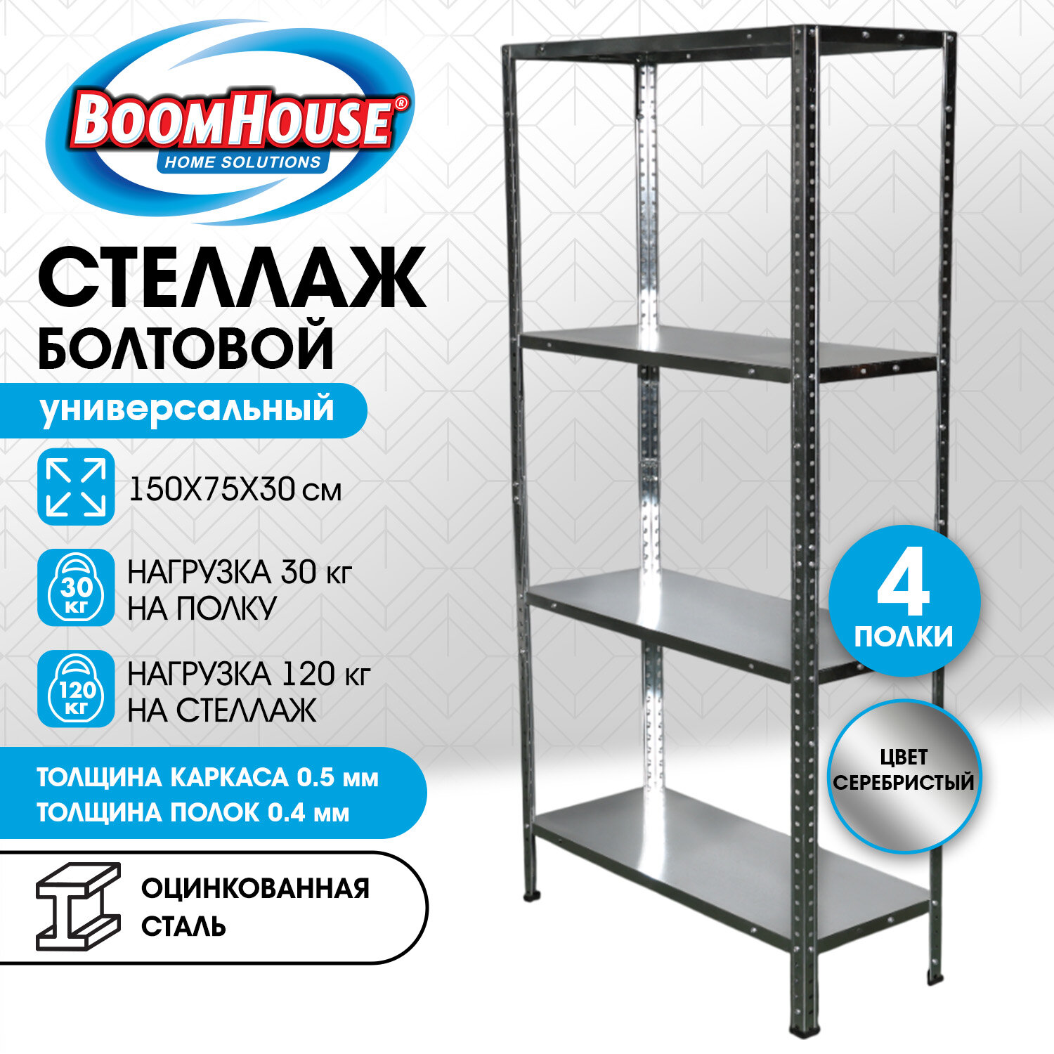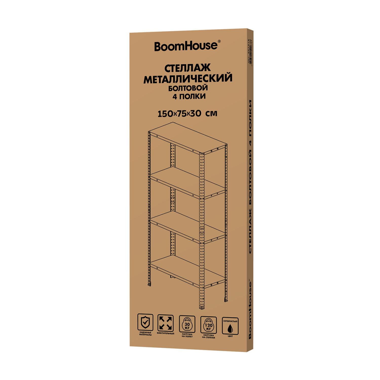 Стеллаж металл BOOMHOUSE (БУМХАУС) в1500*ш750*г300мм, 4 полки, нагрузка на стеллаж до 120 кг, серебристый Код товара: 291418 1 808 ₽ Купить Производитель:BoomHouse Металлический стеллаж BOOMHOUSE собирается с помощью болтов, за счет чего достигается устойчивая конструкция. Простой и экономичный способ организовать хранение вещей. Предназначены для хранения документов и различных грузов в офисе, на складе, в архиве. Возможны два варианта сборки стеллажа. Высокий единый стеллаж (150 см) благодаря сборке стойки, или 2 невысоких (75 см) раздельных стеллажа. Стеллаж изготовлен из оцинкованной стали, что позволяет его использовать в помещениях с повышенной влажностью. Для повышения жесткости всей конструкции верхнюю и нижнюю полку нужно усилить дополнительными Г-образными уголками (поставляются в комплекте). Максимальная нагрузка на полку - до 30 кг, на стеллаж - до 120 кг. Шаг регулирования высоты полок – 25 мм. Стойка имеет разборную конструкцию, благодаря чему стеллаж поставляется в компактной упаковке. Комплектуются подпятниками, предохраняющими пол от повреждений. Вся необходимая фурнитура для сборки в комплекте.Производство: КитайТип товара: стеллаж (комплект)Высота стеллажа: 1500 ммШирина стеллажа: 750 ммКоличество полок: 4 шт.Глубина стеллажа: 300 ммНагрузка на полку: до 30 кгШаг установки полок: 25 ммТип соединения: на болтахМатериал: оцинкованная стальМатериал полок: оцинкованная стальЦвет каркаса: серебристыйЦвет полки: серебристыйПоставляется в разобранном виде: даВес: 5,7 кгРазмер упаковки: 6.3 × 80 × 31.5 смОбъём: 0.0159 м3Промежуточная упаковка: 1 штТранспортная упаковка: 1 штШтрих-код: 4606224522678 Приложение-1.pdf
