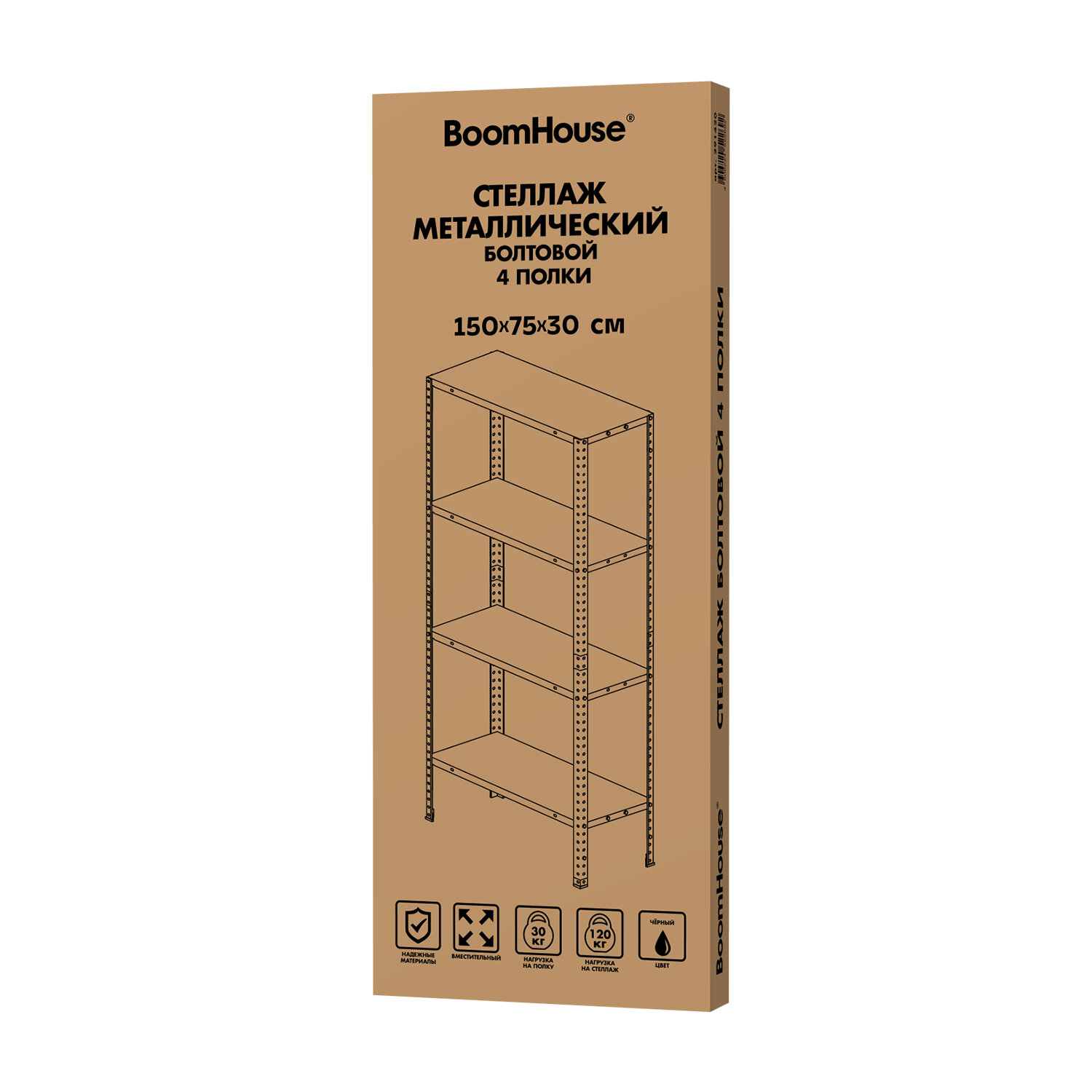Стеллаж металл BOOMHOUSE (БУМХАУС) в1500*ш750*г300мм, 4 полки, нагрузка на стеллаж до 120 кг, черный Код товара: 291420 2 314 ₽ Купить Производитель:BoomHouse Металлический стеллаж BOOMHOUSE собирается с помощью болтов, за счет чего достигается устойчивая конструкция. Простой и экономичный способ организовать хранение вещей. Предназначены для хранения документов и различных грузов в офисе, на складе, в архиве. Возможны два варианта сборки стеллажа. Высокий единый стеллаж (150 см) благодаря сборке стойки, или 2 невысоких (75 см) раздельных стеллажа. Стеллаж изготовлен из оцинкованной стали, что позволяет его использовать в помещениях с повышенной влажностью. Для повышения жесткости всей конструкции верхнюю и нижнюю полку нужно усилить дополнительными Г-образными уголками (поставляются в комплекте). Максимальная нагрузка на полку - до 30 кг, на стеллаж - до 120 кг. Шаг регулирования высоты полок – 25 мм. Стойка имеет разборную конструкцию, благодаря чему стеллаж поставляется в компактной упаковке. Комплектуются подпятниками, предохраняющими пол от повреждений. Вся необходимая фурнитура для сборки в комплекте.Производство: КитайТип товара: стеллаж (комплект)Высота стеллажа: 1500 ммШирина стеллажа: 750 ммКоличество полок: 4 шт.Глубина стеллажа: 300 ммНагрузка на полку: до 30 кгШаг установки полок: 25 ммТип соединения: на болтахМатериал: оцинкованная стальМатериал полок: оцинкованная стальЦвет каркаса: черныйЦвет полки: черныйПоставляется в разобранном виде: даВес: 5,9 кгРазмер упаковки: 6.3 × 80 × 31.5 смОбъём: 0.0159 м3Промежуточная упаковка: 1 штТранспортная упаковка: 1 штШтрих-код: 4606224522692 Приложение-1.pdf