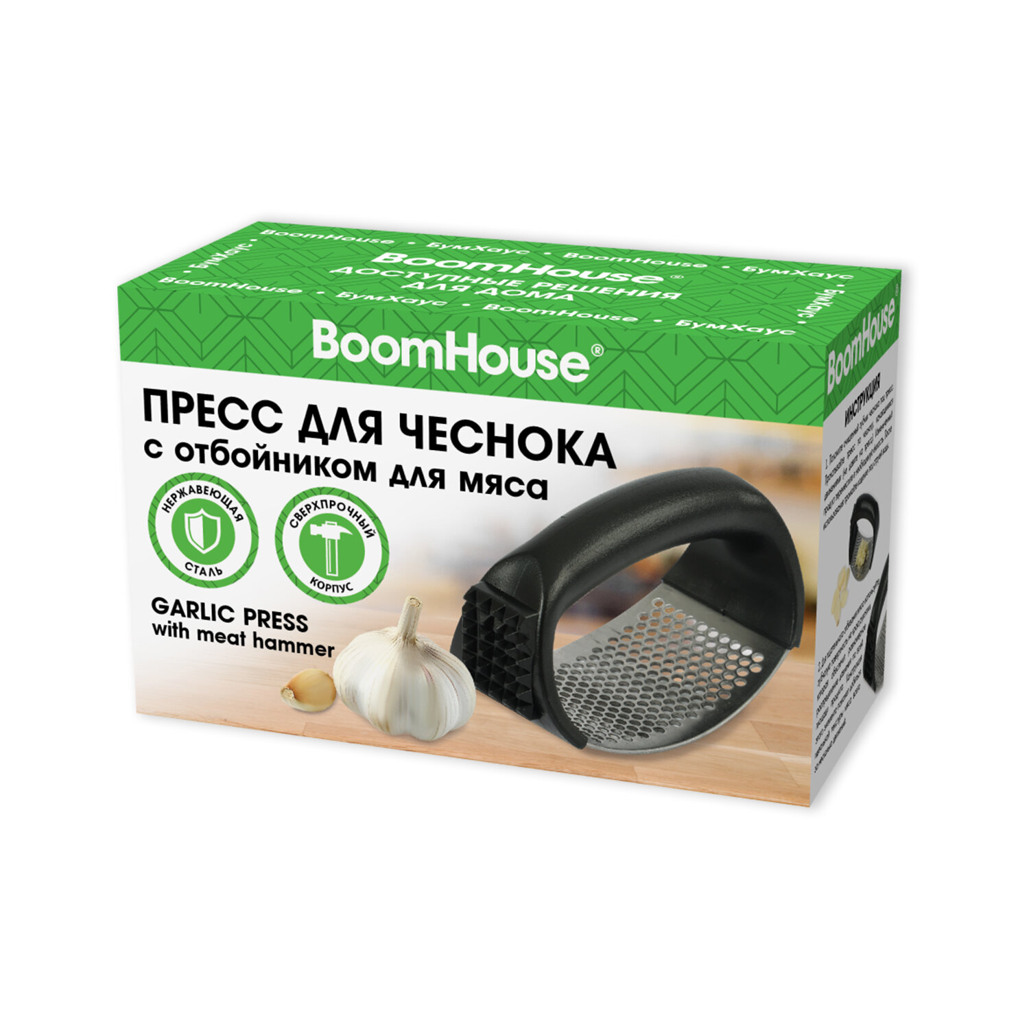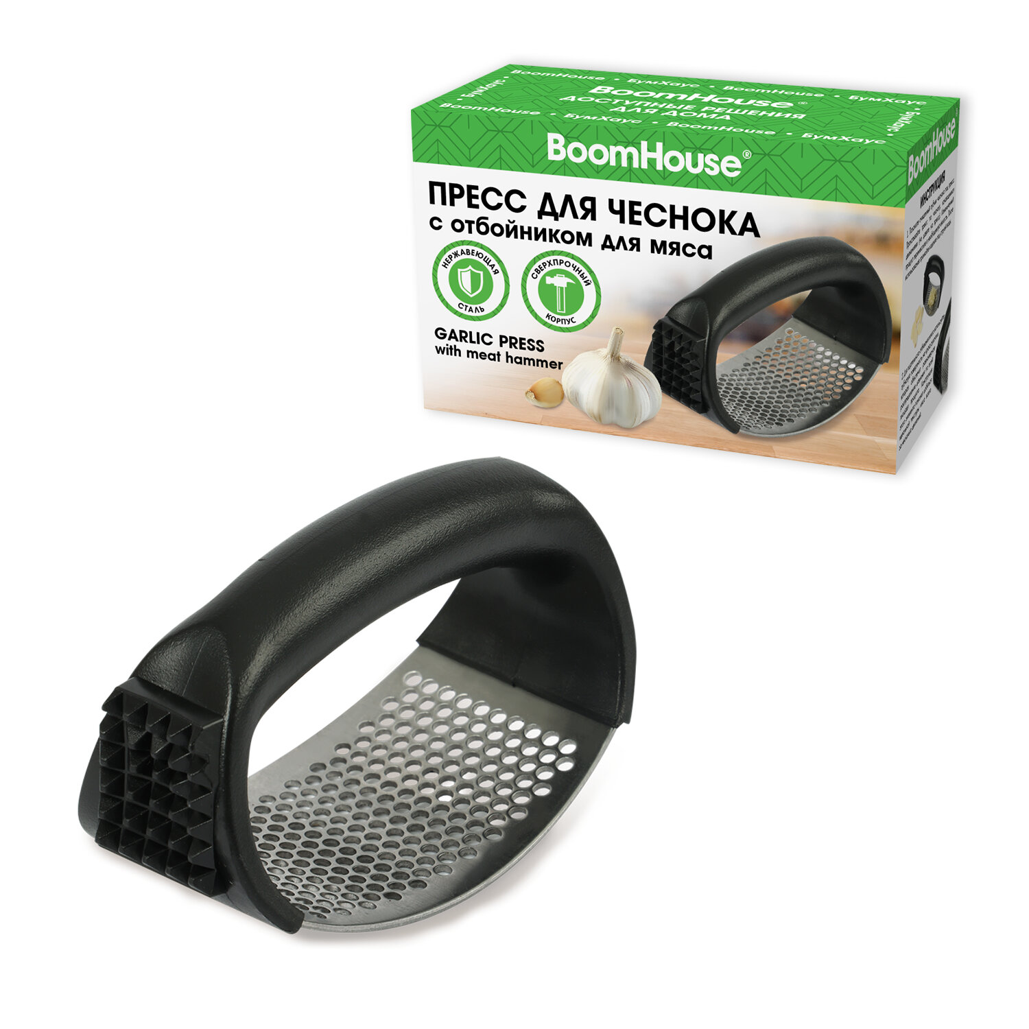 Пресс для чеснока с отбойником для мяса, нержавеющая сталь + пластик, черный, BOOMHOUSE Код товара: 702094 100,17 ₽ Купить Производитель:BoomHouse Пресс для чеснока с отбойником для мяса BOOMHOUSE - ваш незаменимый помощник на кухне. Благодаря прочной конструкции и компактному размеру он легко справится с любым чесноком и сделает приготовление блюд максимально простым и комфортным. Пресс для чеснока BOOMHOUSE изготовлен из качественных материалов, который соответствует всем требованиям безопасности – это прочный пищевой пластик и мартенситная нержавеющая сталь SUS410, отличающаяся высокой коррозионной стойкостью, прочностью и устойчивостью к окислению. Пресс для чеснока – это ручной кухонный прибор, предназначенный для измельчения зубчиков чеснока путём продавливания их через толстую сетку с мелкими отверстиями. Устройство оснащено специальными зубчиками для отбивания мяса. Пресс для чеснока удобно держать, использовать и хранить благодаря эргономичной ручке и оптимальному размеру – 11х5х7 см. А легкий вес изделия (75 г) позволит вам не уставать при долгом использовании. Рекомендации по использованию: 1) Сразу после каждого использования пресс для чеснока следует очистить, тщательно вымыть и высушить. 2) При засорении отверстий не рекомендуется использовать абразивные средства или металлические скребки – можно воспользоваться щеткой, которой удобно очистить все поверхности. 3) Храните пресс в сухом месте, вдали от агрессивных химикатов, которые могут вызвать коррозию, и металлических приборов, подверженных коррозии.Производство: КитайВес: 102 грРазмер упаковки: 5.5 × 11.4 × 6.9 смОбъём: 0.0005 м3Промежуточная упаковка: 200 штТранспортная упаковка: 200 штШтрих-код: 4606224520018 Файлы