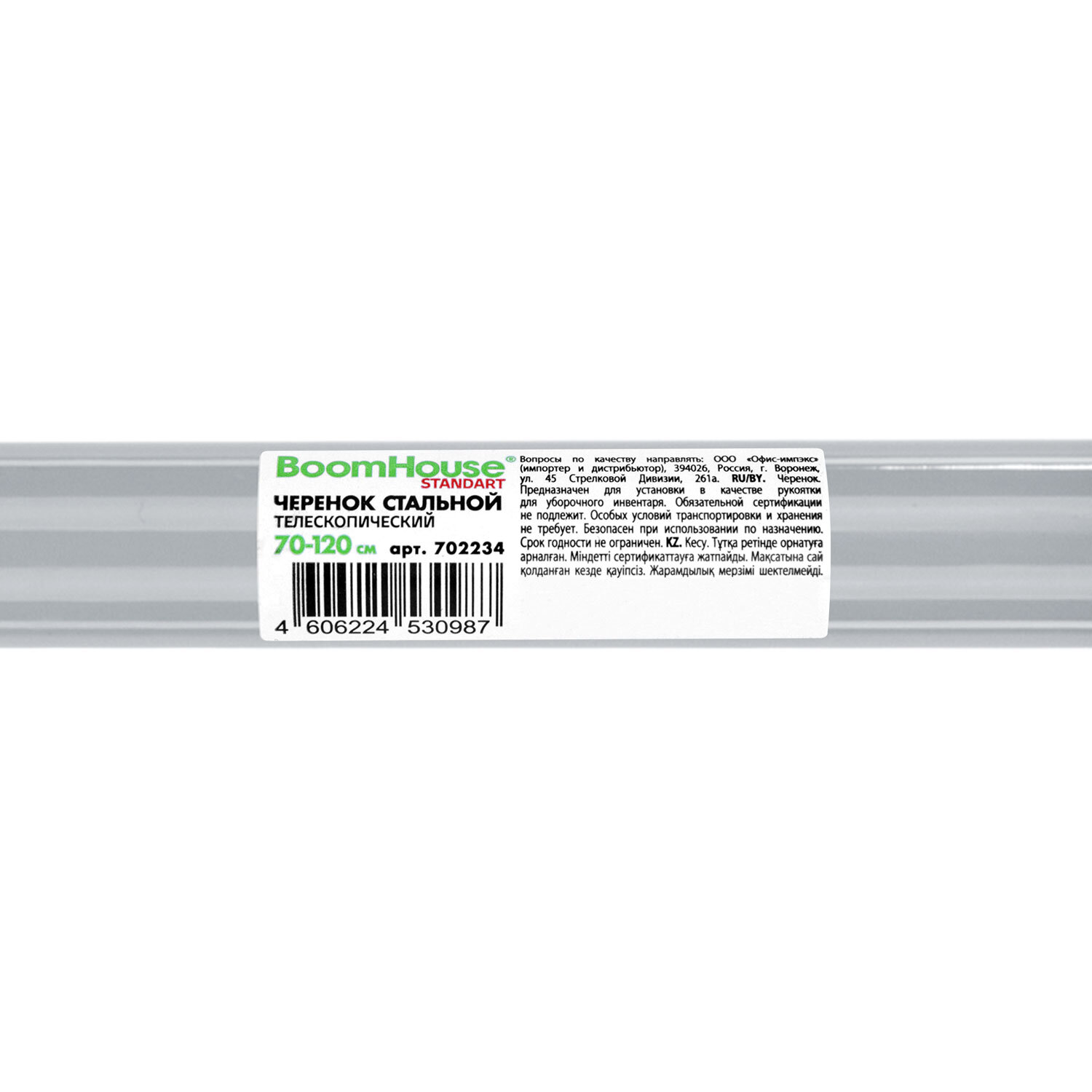 Черенок ТЕЛЕСКОПИЧЕСКИЙ для инвентаря 70-120 см, еврорезьба, металлопластик, серый, BOOMHOUSE (БУМХАУС) STANDART Код товара: 702234 347,3 ₽ Купить Производитель:BoomHouse Черенок телескопический BOOMHOUSE STANDART предназначена для крепления к флаундерам, щеткам и другим инструментам для проведения уборки. Используется в комплекте с держателем и насадкой. Подходит к техническим щеткам, а также к любым другим типам профессионального инвентаря с еврорезьбой (щеткам для пола, швабрам, держателями, метлам). Телескопический черенок позволяет выбрать оптимальную длину под себя. Черенок имеет отверстие для подвешивания на пластиковом колпачке сверху для удобного хранения. Длина черенка из металлопластика – 70-120 см. Диаметр – 2,2 см.Производство: КитайТип товара: черенок с еврорезьбойТип крепления: еврорезьба 1,6 смДлина: 120 смДиаметр черенка: 22 ммТелескопический: даМатериал: металлопластикЦвет: серыйВес: 242 грРазмер упаковки: 2.6 × 70 × 2.6 смОбъём: 0.0007 м3Промежуточная упаковка: 24 штТранспортная упаковка: 24 штШтрих-код: 4606224530987 Файлы Сертификат-1.jpg Сертификат-2.jpg Сертификат-3.jpg Сертификат-4.jpg Сертификат-5.jpg Сертификат-6.jpg Сертификат-7.jpg Сертификат-8.jpg Сертификат-9.jpg Сертификат-10.jpg Сертификат-11.jpg Сертификат-12.jpg Сертификат-13.jpg Сертификат-14.jpg Сертификат-15.jpg Сертификат-16.jpg Сертификат-17.jpg Сертификат-18.jpg Сертификат-19.jpg Сертификат-20.jpg Сертификат-21.jpg Сертификат-22.jpg Сертификат-23.jpg Сертификат-24.jpg Сертификат-25.jpg Сертификат-26.jpg Сертификат-27.jpg Сертификат-28.jpg
