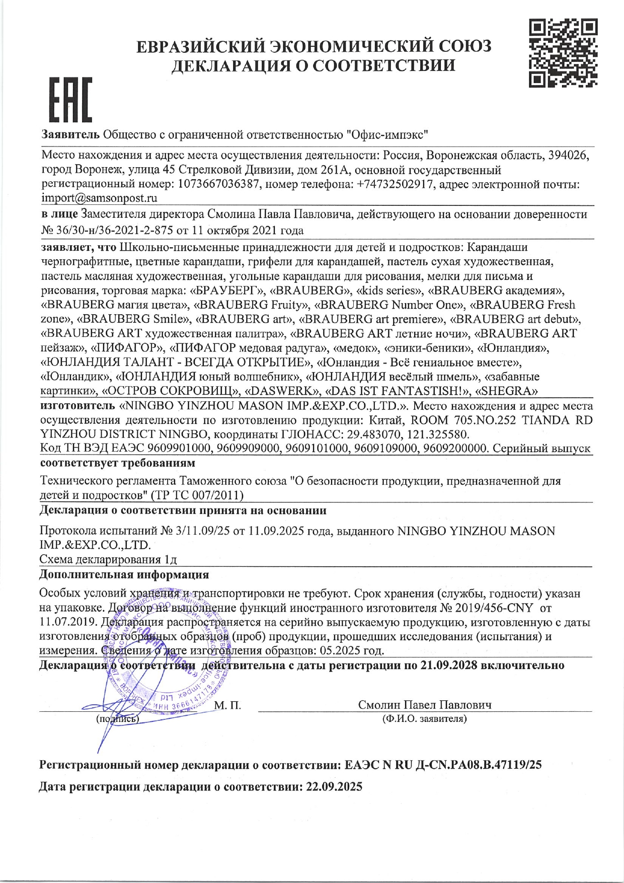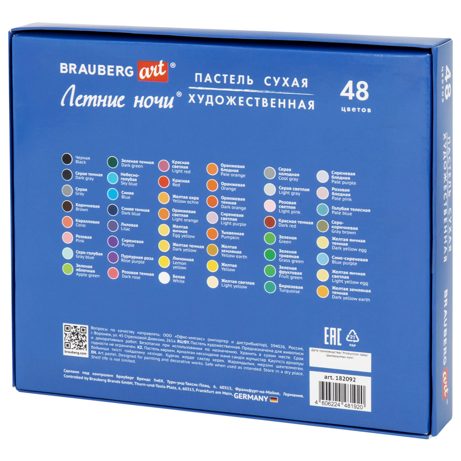 Пастель сухая художественная BRAUBERG ART "Летние ночи", 48 цветов, круглое сечение Код товара: 182092 703,46 ₽ Купить Производитель:BRAUBERG ART Сухая художественная пастель BRAUBERG ART "Летние ночи" предназначена для графики и живописи. Она отличается насыщенностью цвета, мягким письмом и не крошится при использовании. Подходит как для начинающих художников и любителей, так и профессионалов Легко ложится на различные фактуры цветной бумаги, бумагу для рисования, холст, картон, дерево, керамику. Также можно наносить на влажную поверхность или размывать водой для достижения акварельного эффекта. 48 цветов позволяют передать полную цветовую палитру. Высокое качество пигментов и связующего обеспечивает низкий расход материала, хорошую укрывистость и яркость цвета. Пастель имеет вид брусков с квадратным сечением. Не токсична и безопасна при использовании. При попадании на одежду или кожу рук легко смывается тёплой водой. Благодаря компактной упаковке удобно брать с собой. Художественная пастель пригодится школьникам, студентам, участникам мастер-классов, ученикам художественных школ, студий и училищ, живописных мастерских, так как у них представлена широкая гамма цветов. Отлично подойдёт для работы дома или пленэре. Эту пастель используют любители в качестве хобби и профессионалы. Творчество – луч света в серых буднях!Производство: КитайТип пастели: сухаяСерия: Летние ночиКоличество цветов: 48Цвета: классическиеСечение: круглоеУпаковка: картонная коробкаВес: 421 грРазмер упаковки: 2.7 × 18.2 × 15.3 смОбъём: 0.0011 м3Промежуточная упаковка: 6 штТранспортная упаковка: 24 штШтрих-код: 4606224481920 Сертификат-1.jpg Сертификат-2.jpg Сертификат-3.jpg