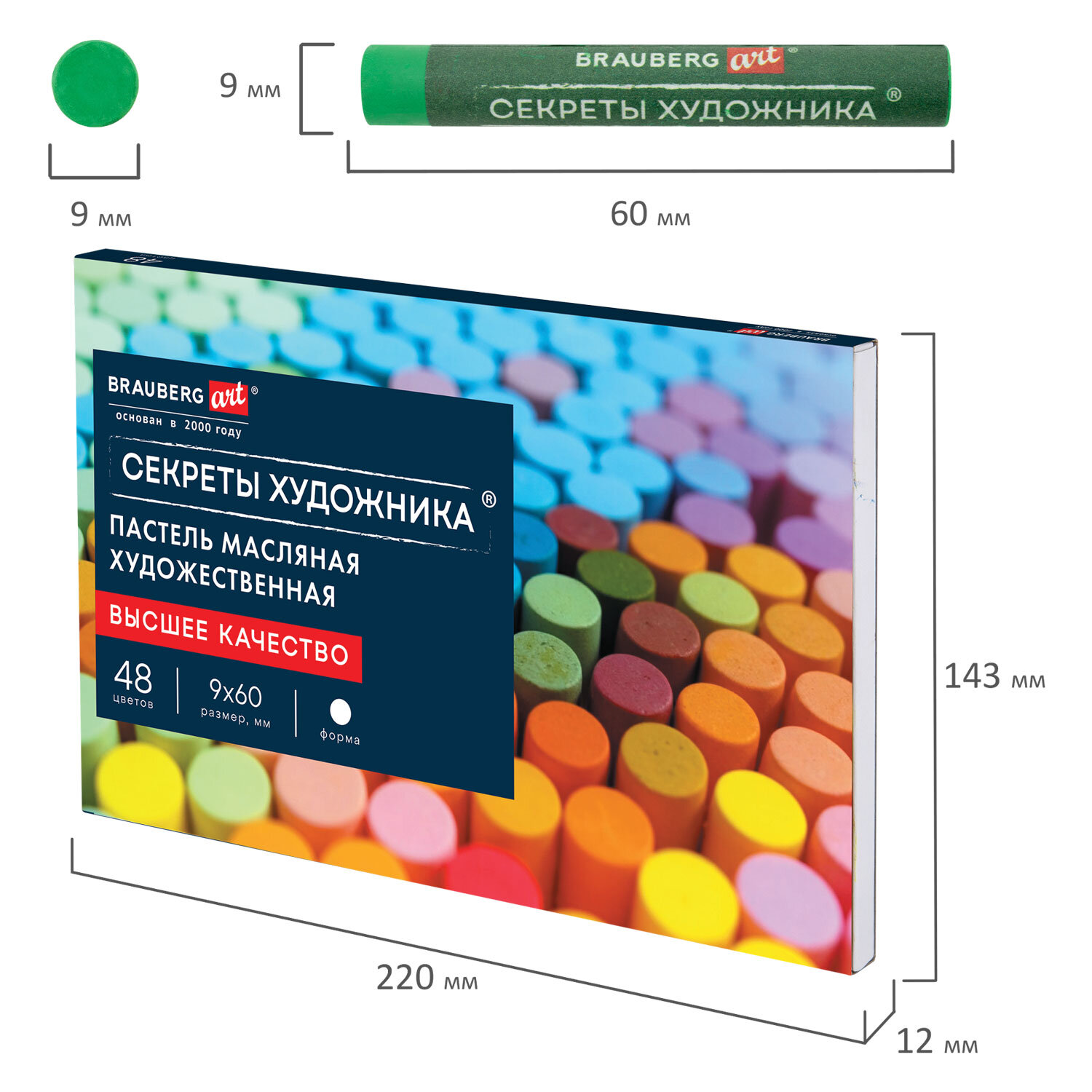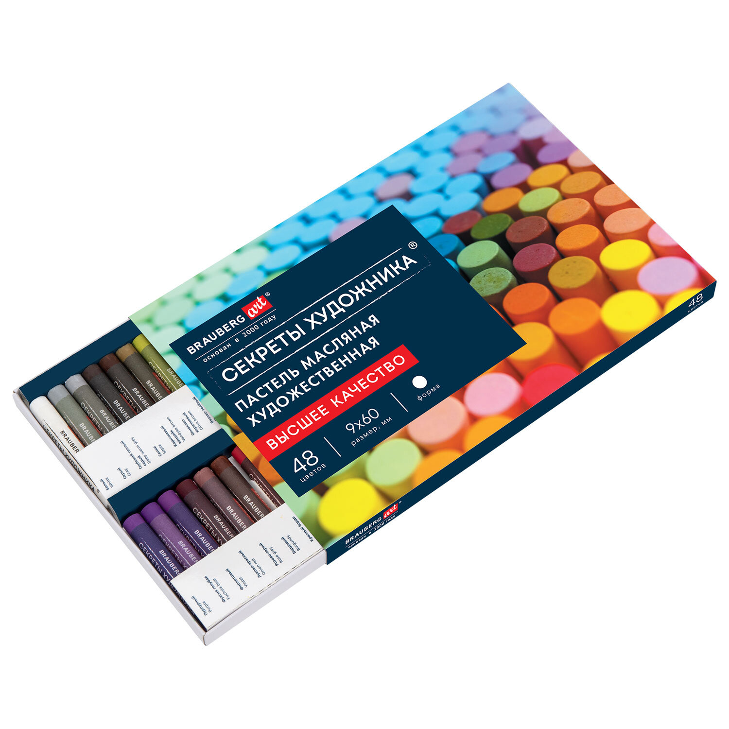 Масляная пастель легко ложится на различные фактуры цветной бумаги, бумагу для рисования, холст, картон, дерево, керамику. 48 цветов позволяют передать полную цветовую палитру. Высокое качество пигментов и связующего обеспечивает низкий расход материала, хорошую укрывистость и яркость цвета. Пастель имеет вид брусков с круглым сечением, обёрнутых в бумажную обёртку. Она позволяет сохранять руки и одежду чистыми. Не токсична и безопасна при использовании. Благодаря компактной упаковке удобно брать с собой.
