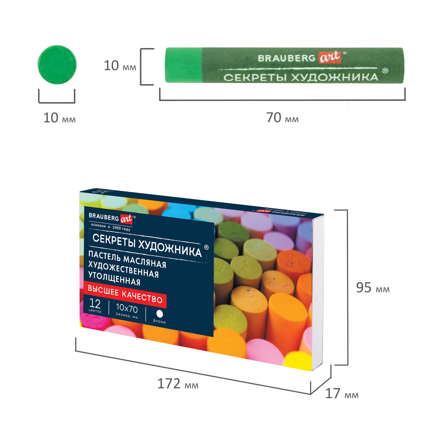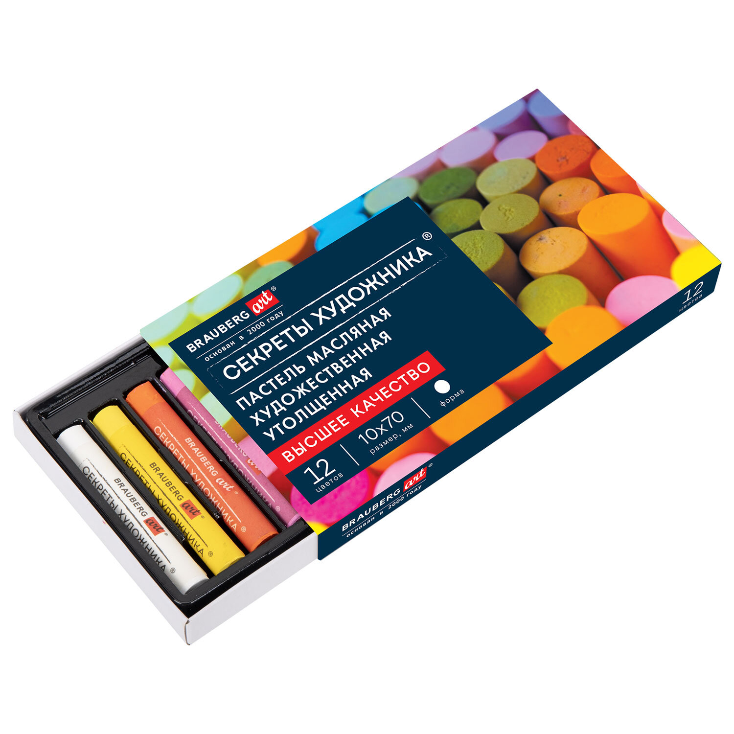Масляная пастель легко ложится на различные фактуры цветной бумаги, бумагу для рисования, холст, картон, дерево, керамику. 12 цветов позволяют передать полную цветовую палитру. Высокое качество пигментов и связующего обеспечивает низкий расход материала, хорошую укрывистость и яркость цвета. Пастель имеет вид брусков с круглым сечением, обёрнутых в бумажную обёртку. Она позволяет сохранять руки и одежду чистыми. Не токсична и безопасна при использовании. Благодаря компактной упаковке удобно брать с собой.