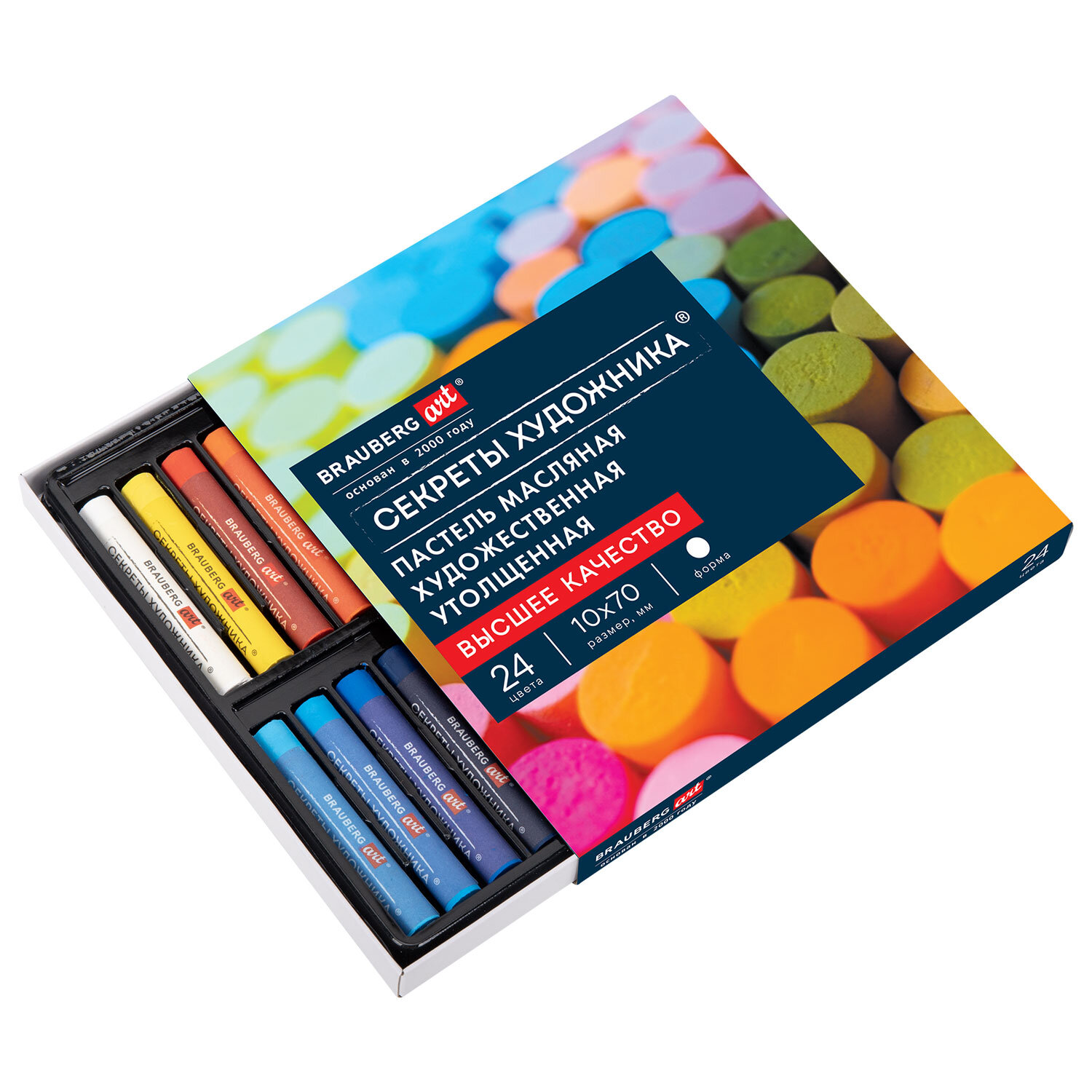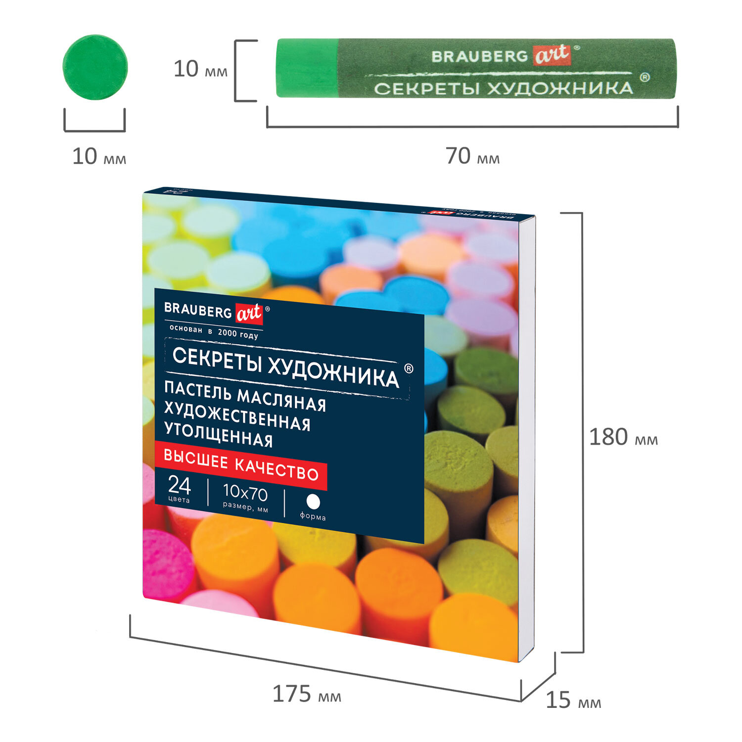 Масляная пастель легко ложится на различные фактуры цветной бумаги, бумагу для рисования, холст, картон, дерево, керамику. 36 цветов позволяют передать полную цветовую палитру. Высокое качество пигментов и связующего обеспечивает низкий расход материала, хорошую укрывистость и яркость цвета. Пастель имеет вид брусков с круглым сечением, обёрнутых в бумажную обёртку. Она позволяет сохранять руки и одежду чистыми. Не токсична и безопасна при использовании. Благодаря компактной упаковке удобно брать с собой.