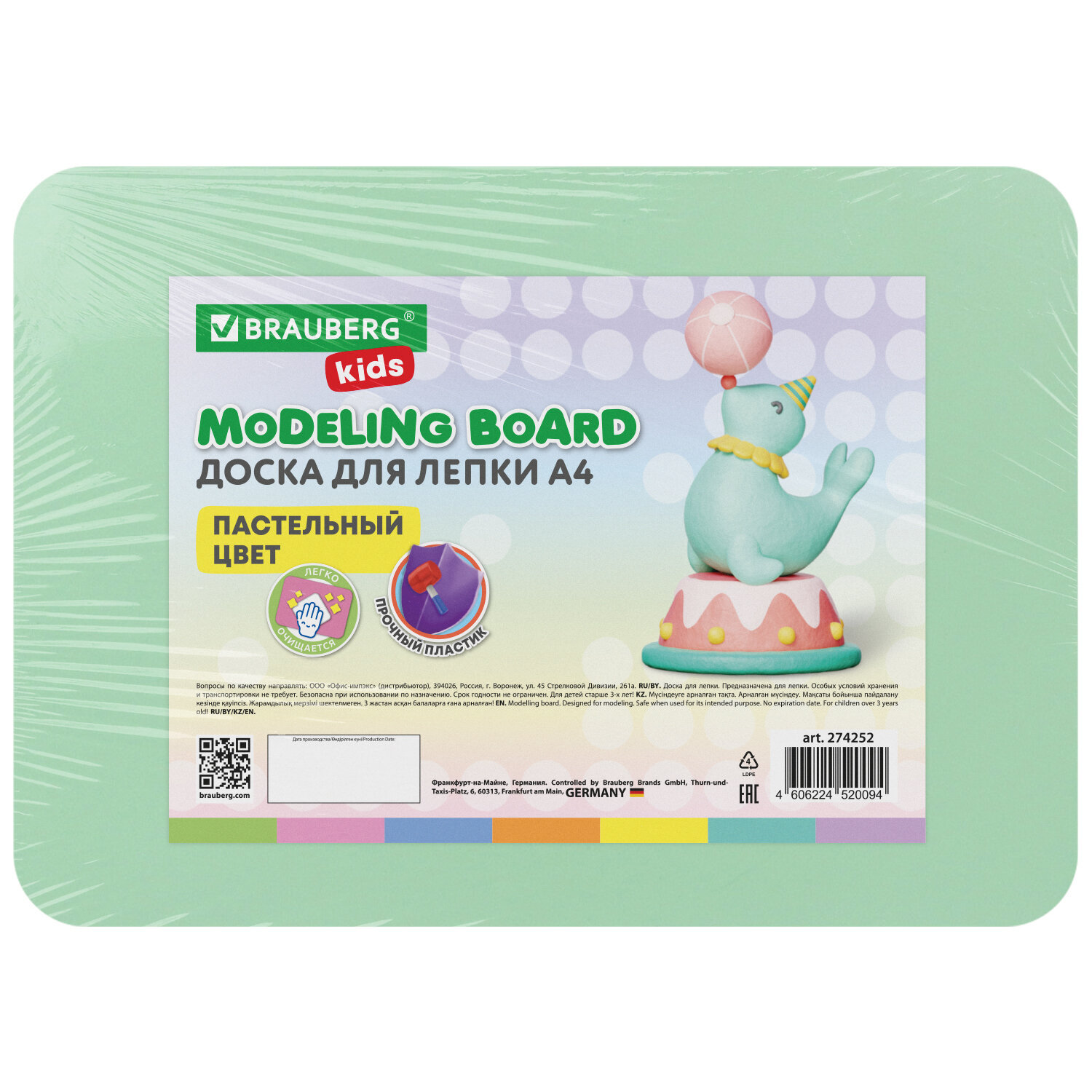 Доска для лепки А4, 280х200 мм, BRAUBERG KIDS, пастельные цвета, ассорти Код товара: 274252 112 ₽ Купить Производитель:BRAUBERG KIDS Доски для лепки BRAUBERG KIDS надежно уберегут стол от намокания и загрязнений, оставленных пластилином, глиной, красками, фломастерами и прочими красящимися предметами. Доска для лепки имеет удобную, функциональную форму. Производится из жесткого прочного пластика толщиной 1,65 мм, к которому не липнет пластилин. Размер – 280х200 мм. Выполнена в 4 пастельных цветах: розовый, лавандовый, салатовый, бирюзовый (ассорти без возможности выбора цвета). Поставляется в термоусадочной пленке.Производство: РоссияТип товара: доска для лепкиКоличество предметов в наборе: 1 шт.Комплектация: доскаДлина: 280 ммШирина: 200 ммТолщина: 1.65 ммМатериал: пластикЦвет: пастельный ассортиУпаковка: термопленкаВес: 95 грРазмер упаковки: 0.3 × 27.9 × 19.7 смОбъём: 0.0004 м3Промежуточная упаковка: 20 штТранспортная упаковка: 20 штШтрих-код: 4606224520094 Файлы Сертификат-1.jpg Сертификат-2.jpg Сертификат-3.jpg Сертификат-4.jpg