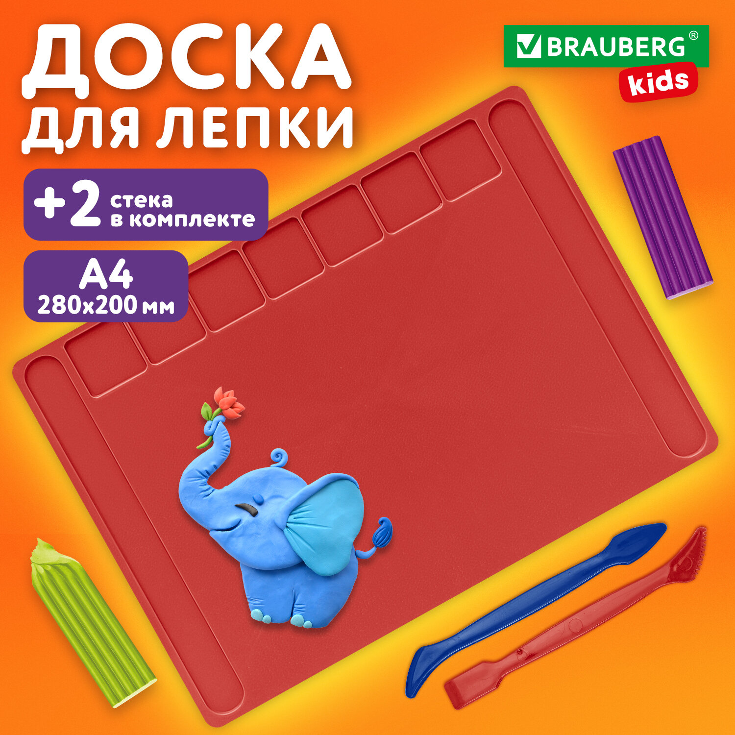 Доска для лепки А4, 280х200 мм, BRAUBERG KIDS, красная, 7 отделений для пластилина, 2 стека Код товара: 274257 135 ₽ Купить Производитель:BRAUBERG KIDS Доски для лепки BRAUBERG KIDS надежно уберегут стол от намокания и загрязнений, оставленных пластилином, глиной, красками, фломастерами и прочими красящимися предметами. Набор состоит из 3-х предметов: 2-х стеков и доски. Доска для лепки имеет удобную, функциональную форму с углублениями для стеков и 7 отделениями для пластилина. Производится из жесткого прочного пластика толщиной 1,65 мм, к которому не липнет пластилин. Размер доски – 280х200 мм. Выполнена в ярком красном цвете. Поставляется в термоусадочной пленке.Производство: РоссияТип товара: доска для лепкиКоличество предметов в наборе: 3 шт.Комплектация: 2 стека, доскаДлина: 280 ммШирина: 200 ммТолщина: 1.65 ммМатериал: пластикЦвет: красныйУпаковка: термопленкаВес: 125 грРазмер упаковки: 0.5 × 28 × 19.9 смОбъём: 0.0004 м3Промежуточная упаковка: 40 штТранспортная упаковка: 40 штШтрих-код: 4606224520148 Файлы Сертификат-1.jpg Сертификат-2.jpg Сертификат-3.jpg Сертификат-4.jpg