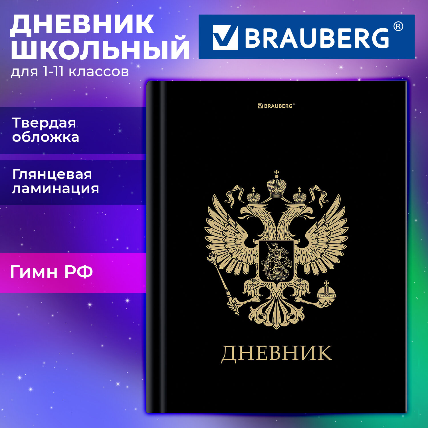 Дневник 1-11 класс 40 л., твердый, BRAUBERG, глянцевая ламинация, "Герб" Код товара: 107598 287,5 ₽ Купить Производитель:BRAUBERG Универсальный дневник BRAUBERG с оригинальной обложкой помогает своевременно фиксировать оценки и домашние задания, замечания по поведению и прилежанию, а также позволяет общаться учителям и родителям. Предназначен для учащихся 1-11 классов. Твердая обложка надежно защищает внутренний блок и долго сохраняет привлекательный внешний вид. Благодаря глянцевой ламинации краски на обложке выглядят более яркими и насыщенными, исключается возможное истирание рисунка. Внутренний блок содержит 40 листов и состоит из офсетной белой бумаги плотностью 60 г/м2.Производство: РоссияТип изделия: дневникиТип обложки: твердый книжный переплетТип спецэффектов на обложке: глянцевая ламинацияОсновной цвет обложки: с дизайномПол ребенка: универсальныйВнутренний блок: офсетСерия: PrintДизайн: ГербПлотность внутренного блока: 60 г/м2Цвет внутреннего блока: белыйТип застежки: нетВес: 177 грРазмер упаковки: 0.7 × 21.8 × 17.3 смОбъём: 0.0003 м3Промежуточная упаковка: 28 штТранспортная упаковка: 28 штШтрих-код: 4606224542324 Сертификат-1.jpg Сертификат-2.jpg Сертификат-3.jpg