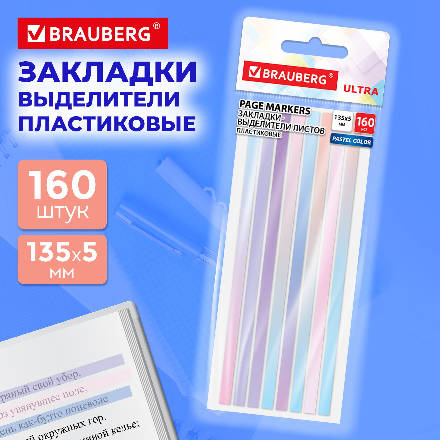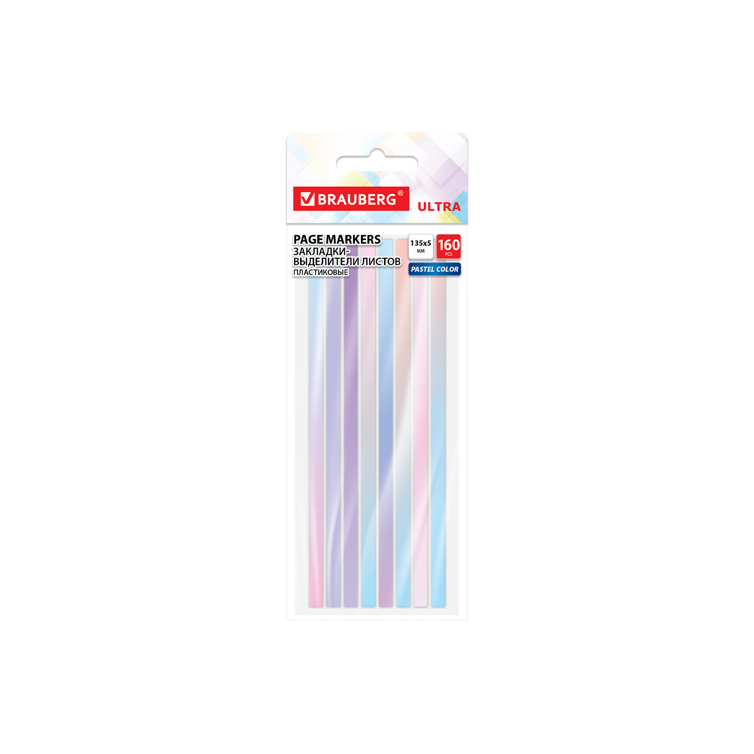 Закладки клейкие выделители текста BRAUBERG ULTRA PASTEL COLOR, 135х5мм, 160 штук (8 цветов х 20 листов) Код товара: 116686 204,4 ₽ Купить Производитель:BRAUBERG Пластиковые закладки BRAUBERG акцентируют внимание на важных страницах любимой книги, журнала, каталога и др. Набор пластиковых закладок-выделителей состоит из 160 листов и включает 8 цветов, по 20 закладок каждого цвета. Легко клеятся к любой поверхности и не оставляют следов. Материал закладок позволяет делать надписи ручкой и карандашом. Удобны для выделения фрагментов рукописного и печатного текста. Уложены на пластиковом основании. Поставляются в полиэтиленовом пакете с европодвесом.Производство: КитайШирина: 5 ммДлина: 135 ммКоличество цветов: 8Количество закладок в блоке: 20 шт.Общее количество закладок: 160 штСерия: ULTRAМатериал: пластикФорма закладок: прямоугольныеЦвет: ассорти пастельУпаковка: полибег с европодвесомВес: 15 грРазмер упаковки: 20 × 8 × 0.2 смПромежуточная упаковка: 24 штТранспортная упаковка: 288 штШтрих-код: 4606224472294