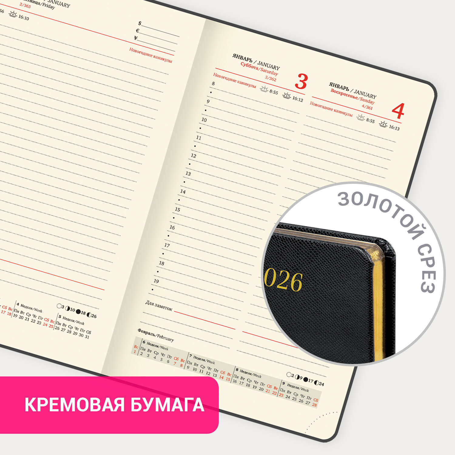 Ежедневник датированный 2026, МАЛЫЙ ФОРМАТ 100х150 мм, А6, BRAUBERG "Iguana", под кожу, черный Код товара: 117252 321,29 ₽ Купить Производитель:BRAUBERG Кожа рептилий – вечный тренд, символ изысканного вкуса. Коллекция датированных ежедневников "Iguana" – очередное тому подтверждение. Модная фактура и насыщенные цвета придают изделиям особый шик и легкую загадочность. Внутренний блок включает 168 листов тонированной бумаги плотностью 70 г/м2. Каждая страничка имеет перфорированный угол. Благодаря малому формату А6 (100х150 мм) ежедневник удобно использовать как в офисе, так и на выездных деловых встречах. Твердая обложка классического черного цвета стилизована под кожу рептилии. Подходит для горячего тиснения. Срез ежедневника украшен золотым фольгированием – это подчеркивает премиальность изделия. Дополнением является закладка-ляссе, с помощью которой при необходимости можно быстро открыть ежедневник на нужной странице. Помимо прочего, ежедневник снабжен обширным справочным материалом. В конце ежедневника есть 4 страницы для записей и заметок. Датированный ежедневник BRAUBERG "Iguana" идеально подойдет для офисных работников и людей, занимающихся бизнесом, ценящих свое драгоценное время.Производство: КитайТип ежедневника: датированныйФормат: А6Обложка: под кожу рептилийВид обложки: твердаяКоличество листов: 168 шт.Особенности: закладка-ляссе, перфорация уголков, поролоновая прослойка, скругленные углы, справочная информацияСерия: IguanaГод: 2026Тип застежки: нетОсновной цвет обложки: черныйДополнительный цвет обложки: нетЦвет среза: золотойЦвет внутреннего блока: кремовыйПлотность внутреннего блока: 70 г/м2Высота строки для записи: 4 ммТип крепления: сшивкаПечать блока: 2 краскиПодходит для блинтового тиснения: даПодходит для тиснения фольгой: даДлина: 150 ммШирина: 100 ммТолщина: 20 ммВес: 242 грРазмер упаковки: 2.4 × 15 × 10.1 смОбъём: 0.0005 м3Промежуточная упаковка: 30 штТранспортная упаковка: 30 штШтрих-код: 4606224488509 Файлы Сертификат-1.jpg Сертификат-2.jpg Сертификат-3.jpg Сертификат-4.jpg Сертификат-5.jpg Сертификат-6.jpg Сертификат-7.jpg Сертификат-8.jpg Сертификат-9.jpg Сертификат-10.jpg Сертификат-11.jpg Сертификат-12.jpg Сертификат-13.jpg Сертификат-14.jpg Сертификат-15.jpg Сертификат-16.jpg Сертификат-17.jpg Сертификат-18.jpg Сертификат-19.jpg Сертификат-20.jpg Сертификат-21.jpg Сертификат-22.jpg Сертификат-23.jpg Сертификат-24.jpg Сертификат-25.jpg Сертификат-26.jpg
