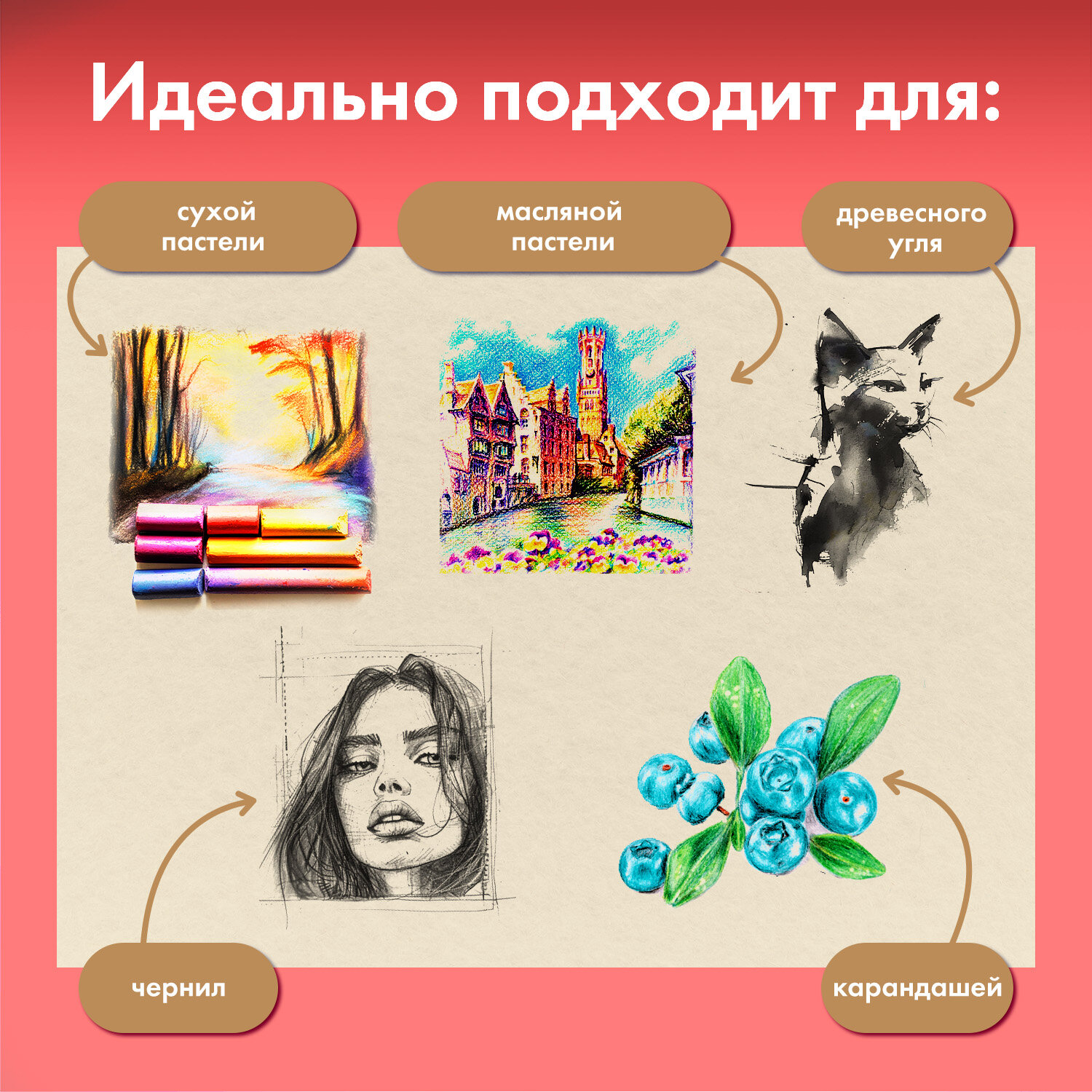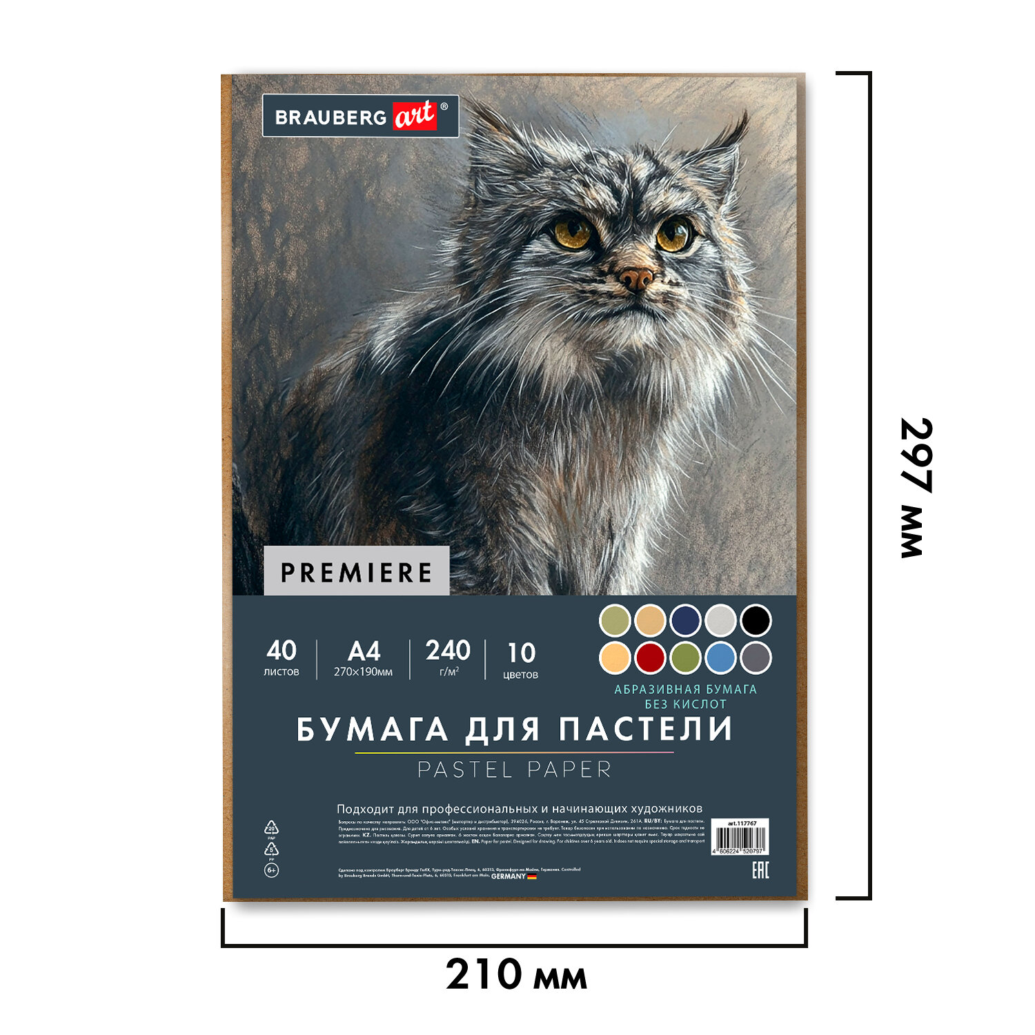 Бумага для пастели АБРАЗИВНАЯ А4 в коробке, 40 листов 8 цветов, 240 г/м2, BRAUBERG AR Код товара: 117767 732,17 ₽ Купить Производитель:BRAUBERG Бумага для пастели BRAUBERG предназначена для различных техник рисования. Позволяет создавать мягкие и детализированные текстуры на картинах, а при более плотной зарисовке пастель выглядит ярко и сочно. Окрашенная в массе бумага в 10 популярных цветах высокой плотности 240 г/м2 гарантирует превосходное сохранение работ. Еще одним преимуществом является наличие ярко выраженной абразивной фактуры, что не маловажно для создания рисунка пастелью. Данная фактура бумаги гарантирует идеальное сцепление материала (удерживает больше пигмента, чем обычная пастельная бумага, что позволяет наносить больше слоёв без осыпания и добиваться насыщенных, глубоких цветов), дает возможность для тонкой детализации, лёгкого смешивания цветов и нанесения нескольких слоёв. Бумага упакована в коробку из микрогофрокартона. Коробка позволит сохранить Ваши рисунки во время транспортировки. В ней также удобно хранить готовые работы. Внутренний блок содержит 40 листов формата А4 (210х297 мм).Производство: КитайТип товара: бумага для пастелиКоличество листов: 40Формат: А4Тип скрепления: нетПлотность бумаги: 240 г/м2Серия: PREMIEREДлина: 297 ммШирина: 210 ммТонированная бумага: даБез кислот: даТиснение: АбразивнаяЦвет: ассортиИндивидуальная упаковка: даВес: 638 грРазмер упаковки: 1.7 × 21 × 29.7 смОбъём: 0.0011 м3Промежуточная упаковка: 15 штТранспортная упаковка: 15 штШтрих-код: 4606224520797 Файлы Сертификат-1.jpg