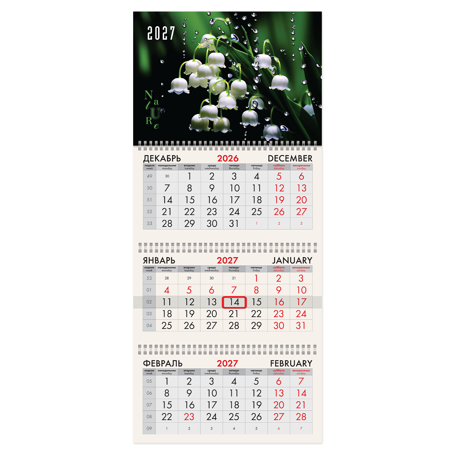 Календарь квартальный 2027г, 3 блока 3 гребня, бегунок, офсет, BRAUBERG, "Ландыши" Код товара: 118266 298,35 ₽ Купить Производитель:BRAUBERG Квартальный календарь BRAUBERG "Ландыши" предназначен для делового планирования. Офисный календарь на 2027 год на 3 гребнях. Состоит из 3 блоков с календарными сетками на три месяца – предыдущий, текущий и последующий. Блок календаря напечатан на офсетной бумаге плотностью 65 г/м2. Подложка изготовлена из мелованного картона плотностью 250 г/м2. Курсор-бегунок выделяет текущую дату. Вертикальный формат. Размер – 29,5х68,2 см. Поставляется в индивидуальной упаковке (полибег) с европодвесом и прокладкой из гофрокартона, что обеспечивает дополнительную защиту товара.Производство: РоссияТип календаря: квартальный на 3 гребняхГод: 2027Тип скрепления: гребеньРазмер: 29,5х68,2 смВнутренний блок: офсетная бумагаПлотность внутреннего блока: 65 г/м2Подложка: мелованный картонПлотность подложки: 250 г/м2Курсор: даПикколо: даДизайн: ЛандышиКалендарная сетка: с разбивкой на 3 месяцаИндивидуальная упаковка: даВес: 250 грРазмер упаковки: 2 × 29.7 × 22.5 смОбъём: 0.0016 м3Промежуточная упаковка: 40 штТранспортная упаковка: 40 штШтрих-код: 4606224527505 Файлы