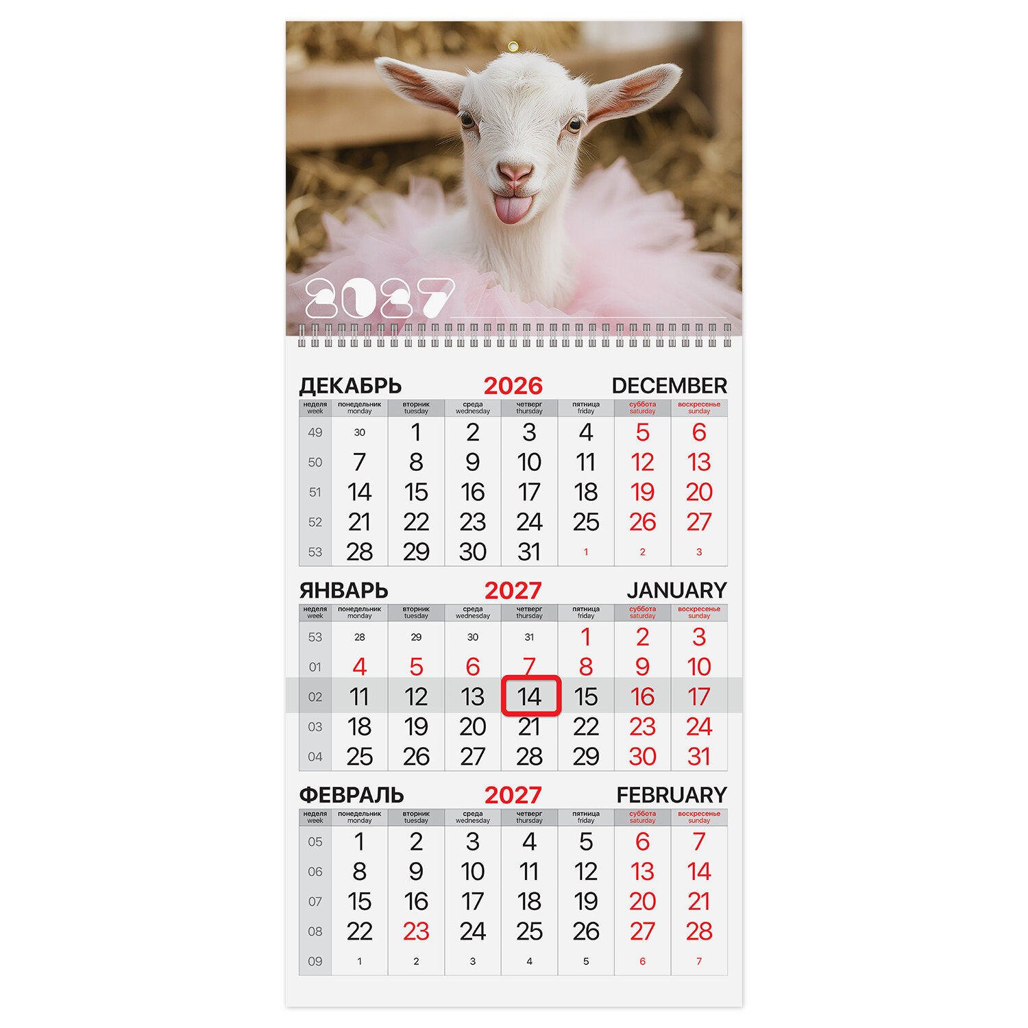 Календарь квартальный на 2027 г., 1 блок, 1 гребень, бегунок, офсет, BRAUBERG, "Козочка" Код товара: 118389 223,92 ₽ Купить Производитель:BRAUBERG Квартальный календарь BRAUBERG "Козочка" предназначен для делового планирования. Офисный календарь на 2027 год на гребне. Состоит из 1 блока с календарными сетками на три месяца – предыдущий, текущий и следующий. Блок календаря напечатан на офсетной бумаге плотностью 65 г/м2. Подложка изготовлена из картона плотностью 280 г/м2. Курсор-бегунок выделяет текущую дату. Вертикальный формат. Размер – 29,5х60 см. Календари ТМ BRAUBERG российского производства отпечатаны на современном высокотехнологичном оборудовании и соответствуют стандартам качества.Производство: РоссияТип календаря: квартальный на 1 гребнеГод: 2027Тип скрепления: гребеньРазмер: 29,5х60 смВнутренний блок: офсетная бумагаПлотность внутреннего блока: 65 г/м2Подложка: картонПлотность подложки: 280 г/м2Курсор: даПикколо: даДизайн: КозочкаКалендарная сетка: с разбивкой на 3 месяцаИндивидуальная упаковка: даВес: 175 грРазмер упаковки: 0.7 × 44.3 × 29.8 смОбъём: 0.0005 м3Промежуточная упаковка: 30 штТранспортная упаковка: 30 штШтрих-код: 4606224528731 Файлы