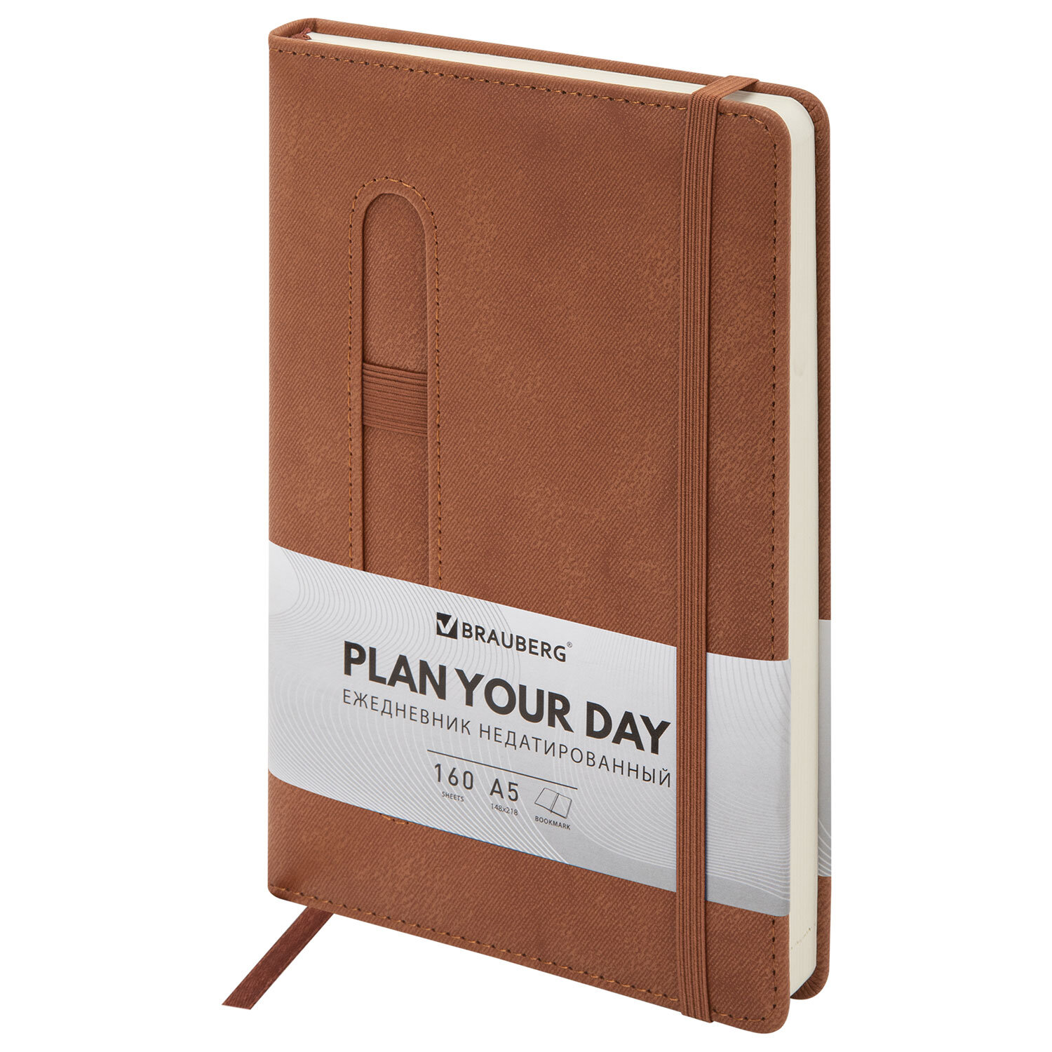 Ежедневник недатированный А5 148x218 мм BRAUBERG "Optimal", под кожу, 160 листов, резинка, держатель для ручки, коричневый Код товара: 118643 439,21 ₽ Купить Производитель:BRAUBERG Серия "Optimal" создана для тех, кто ценит естественность в дизайне и практичность в использовании. Внутренний блок включает 160 листов тонированной бумаги плотностью 70 г/м2. Каждая страница снабжена перфорированным уголком. Благодаря стандартному формату А5 (148х218 мм) недатированный ежедневник удобно использовать как в офисе, так и на выездных деловых встречах. Твердая обложка стилизована под старинную кожу в рубчик и выполнена в стильном коричневом цвете. Подходит для горячего тиснения. Модель оснащена резинкой-фиксатором, предотвращающей самопроизвольное открытие в сумке или портфеле. Также предусмотрены закладка-ляссе для быстрого доступа к нужной странице и держатель для ручки. Справочный материал дополнительно расширяет функциональность ежедневника. В конце внутреннего блока есть 4 страницы для записей и заметок.Производство: КитайТип ежедневника: недатированныйФормат: А5Обложка: под старинную кожуВид обложки: твердаяКоличество листов: 160 шт.Особенности: закладка-ляссе, перфорация уголков, поролоновая прослойка, прострочка по периметру, скругленные углы, справочная информация, фиксатор для ручкиСерия: OptimalГод: нетТип застежки: резинка-фиксаторОсновной цвет обложки: коричневыйДополнительный цвет обложки: нетЦвет среза: нетЦвет внутреннего блока: тонированныйПлотность внутреннего блока: 70 г/м2Высота строки для записи: 4 ммТип крепления: сшивкаПечать блока: 2 краскиПодходит для блинтового тиснения: даПодходит для тиснения фольгой: даПодходит для заливки полимерной смолой: даПодходит для УФ-печати: даДлина: 218 ммШирина: 148 ммТолщина: 20 ммВес: 440 грРазмер упаковки: 2.6 × 14.8 × 21.8 смОбъём: 0.001 м3Промежуточная упаковка: 20 штТранспортная упаковка: 20 штШтрих-код: 4606224538235 Файлы