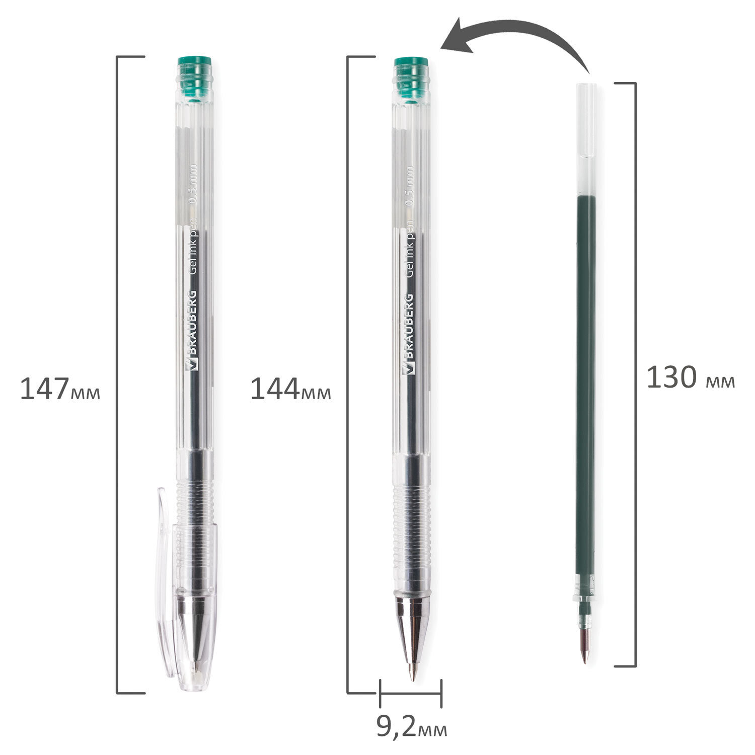 Ручка гелевая BRAUBERG "Jet", ЗЕЛЕНАЯ, корпус прозрачный, узел 0,5 мм, линия письма 0,35 мм Код товара: 141021 119,39 ₽ Купить Производитель:BRAUBERG Классическая гелевая ручка BRAUBERG "Jet" с рифленой поверхностью в зоне захвата обеспечивает комфотное и качественное письмо. Имеет шестигранный прозрачный корпус с рифленой поверхностью в зоне захвата. Детали ручки выполнены в цвет зеленых чернил. Сменный стержень длиной 130 мм со стандартным наконечником позволит использовать ручку максимально долго. Диаметр пишущего узла, равный 0,5 мм, создает линию письма, равную 0,35 мм.Производство: КитайЦвет чернил: зеленыйТолщина линии письма: 0.35 ммДиаметр пишущего узла: 0.5 ммФорма наконечника: стандартныйКоличество в комплекте: 1 шт.Эффект чернил: классическиеСерия: JetДлина сменного стержня: 130 ммЭргономичная зона захвата: рифлениеЦвет корпуса: прозрачныйФорма корпуса: шестиграннаяПокрытие корпуса: -Упаковка: картонная коробкаСрок годности: 36 месВес: 9 грРазмер упаковки: 1.1 × 14.6 × 1.4 смПромежуточная упаковка: 12 штТранспортная упаковка: 1728 штШтрих-код: 4606224051666 Сертификат-1.jpg Сертификат-2.jpg Сертификат-3.jpg